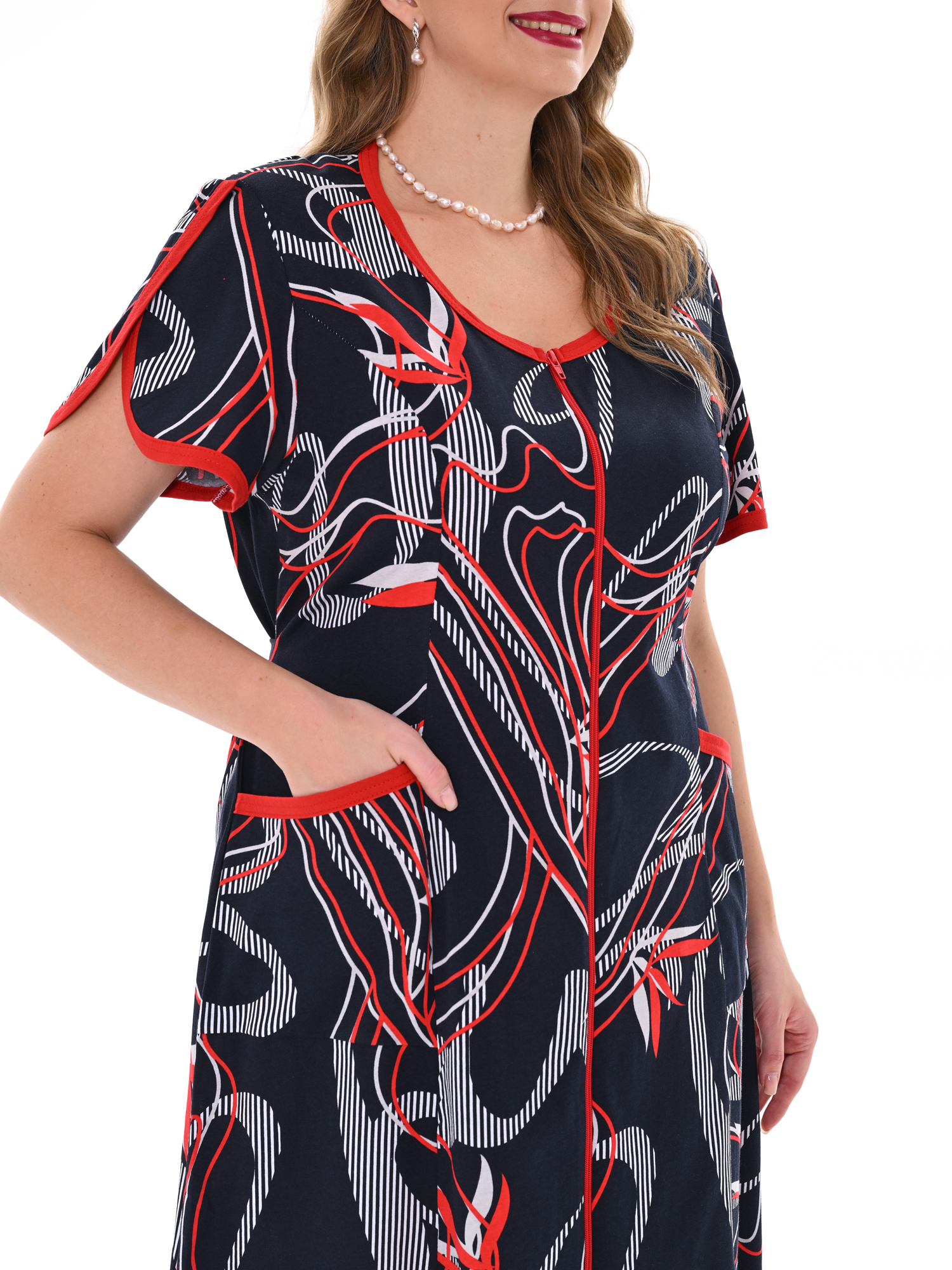 Стильный халат на молнии отлично подойдет как для дома, так и отдыха. Яркие цвета и декоративная отделка по горловине, рукаву и карманам придают изделию изысканный вид, а пояс в боковых швах аккуратно подчеркивает талию.