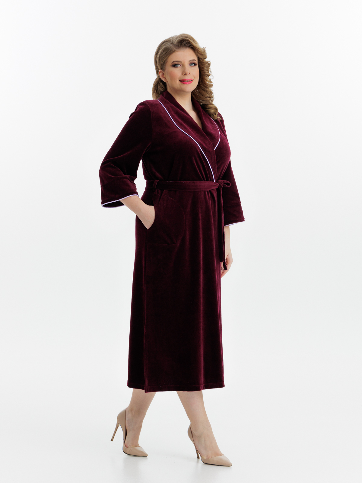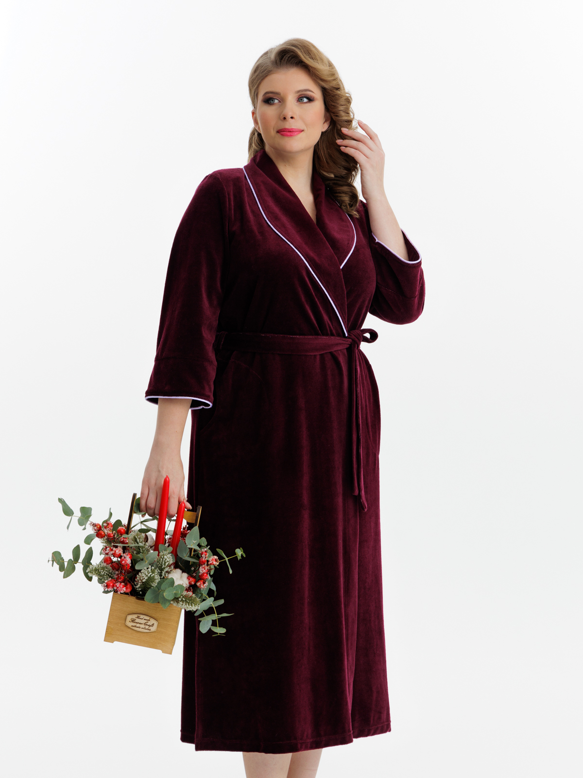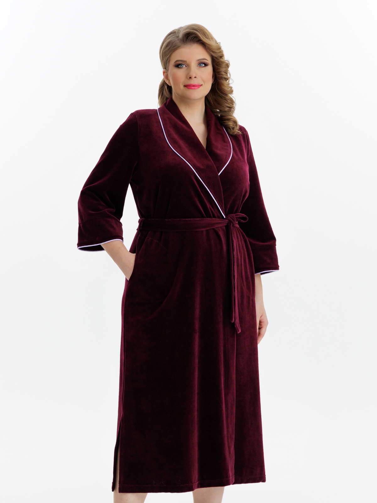 Невероятно мягкий и уютный халат из велюра качества пенье с добавлением полиэстера. Модель прямого силуэта на запахе, талию подчеркивает съемный пояс. Рукав 3/4, боковые разрезы, имеются карманы и декоративная отделка воротника и манжетов рукавов атласным кантом. Утонченный дизайн в сочетании с оригинальным цветовым решением создают изумительный образ.