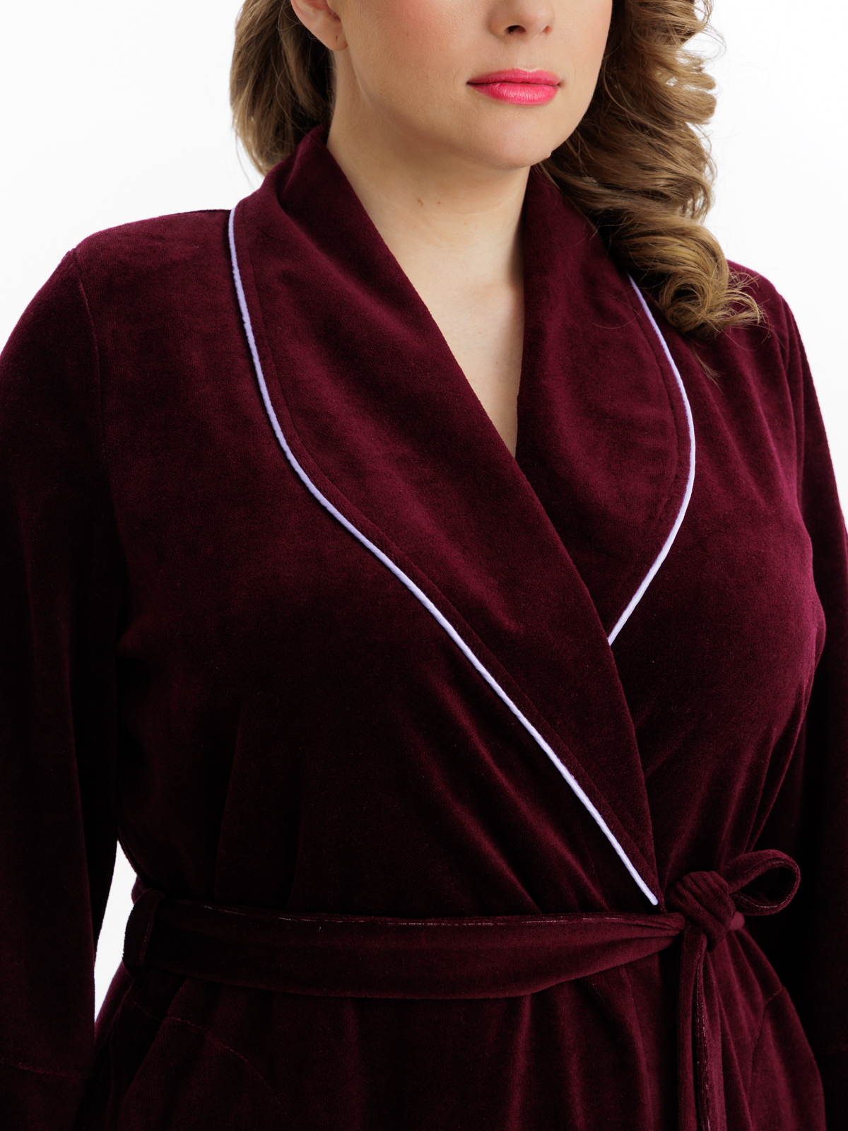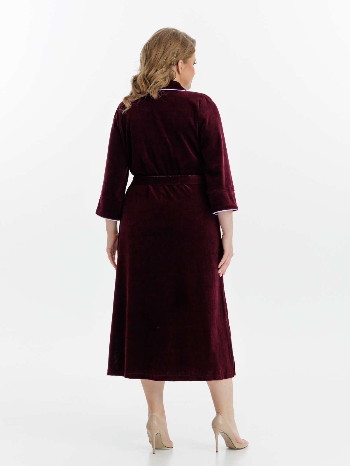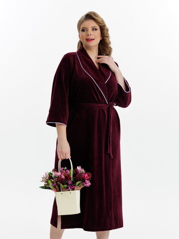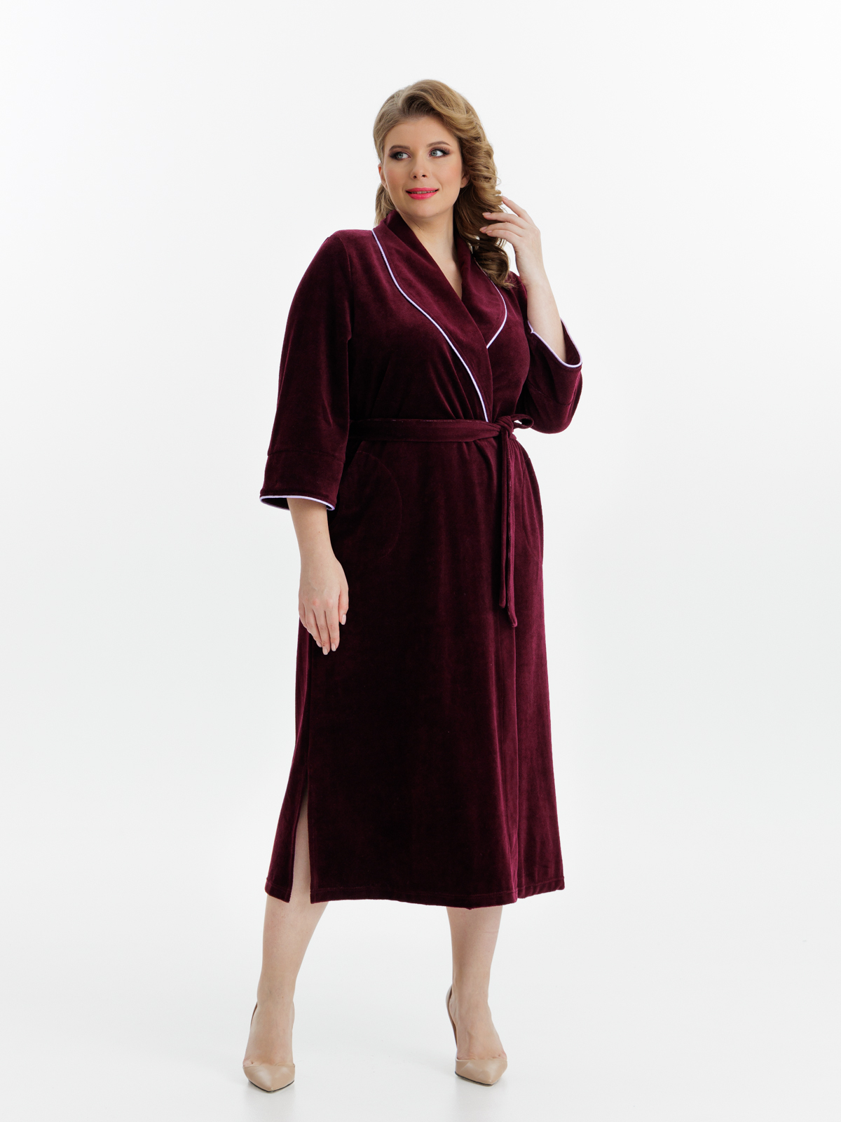 Невероятно мягкий и уютный халат из велюра качества пенье с добавлением полиэстера. Модель прямого силуэта на запахе, талию подчеркивает съемный пояс. Рукав 3/4, боковые разрезы, имеются карманы и декоративная отделка воротника и манжетов рукавов атласным кантом. Утонченный дизайн в сочетании с оригинальным цветовым решением создают изумительный образ.