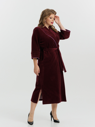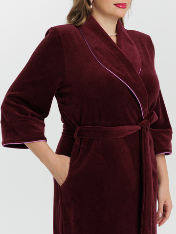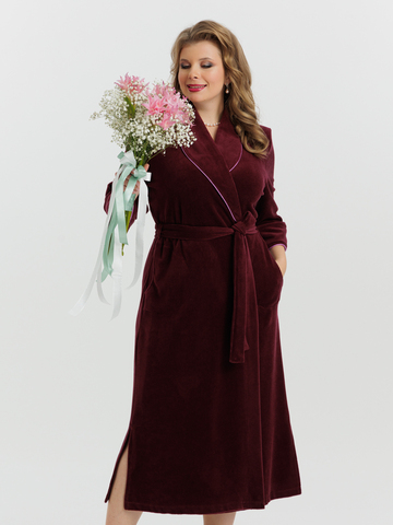 Невероятно мягкий и уютный халат из велюра качества пенье с добавлением полиэстера. Модель прямого силуэта на запахе, талию подчеркивает съемный пояс. Рукав 3/4, боковые разрезы, имеются карманы и декоративная отделка воротника и манжетов рукавов атласным кантом. Утонченный дизайн в сочетании с оригинальным цветовым решением создают изумительный образ.