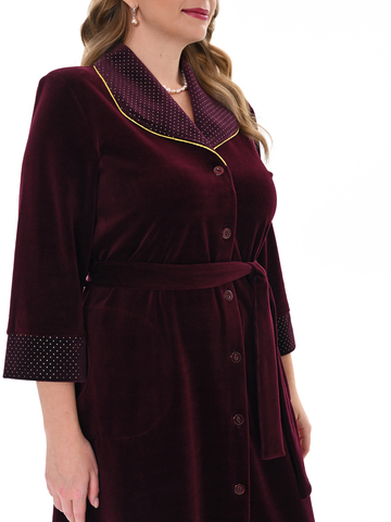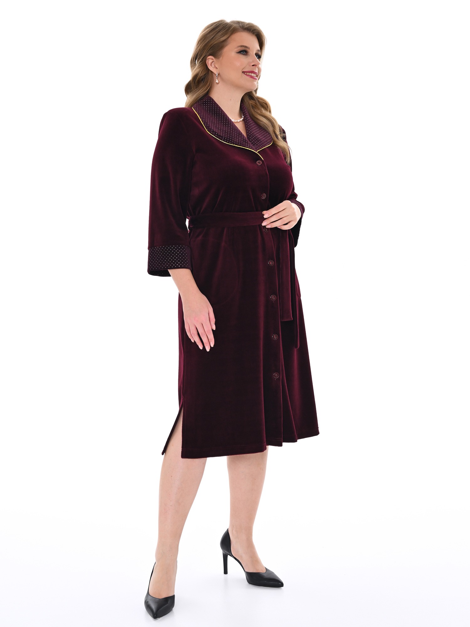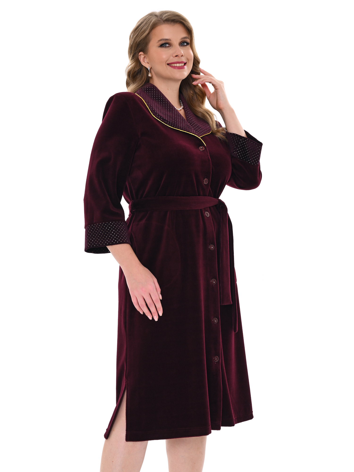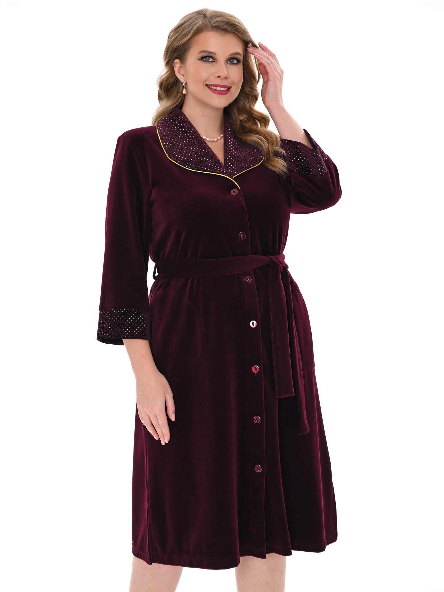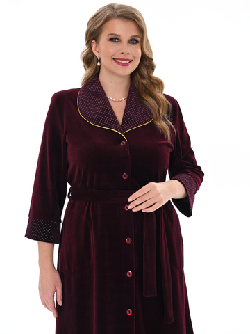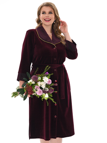Невероятно мягкий и уютный халат из велюра качества пенье с добавлением полиэстера. Модель на пуговицах, талию подчеркивает съемный пояс. Рукав 3/4, боковые разрезы, имеются карманы и декоративная отделка воротника и манжетов рукавов атласным кантом. Утонченный дизайн в сочетании с оригинальным цветовым решением создают изумительный образ.