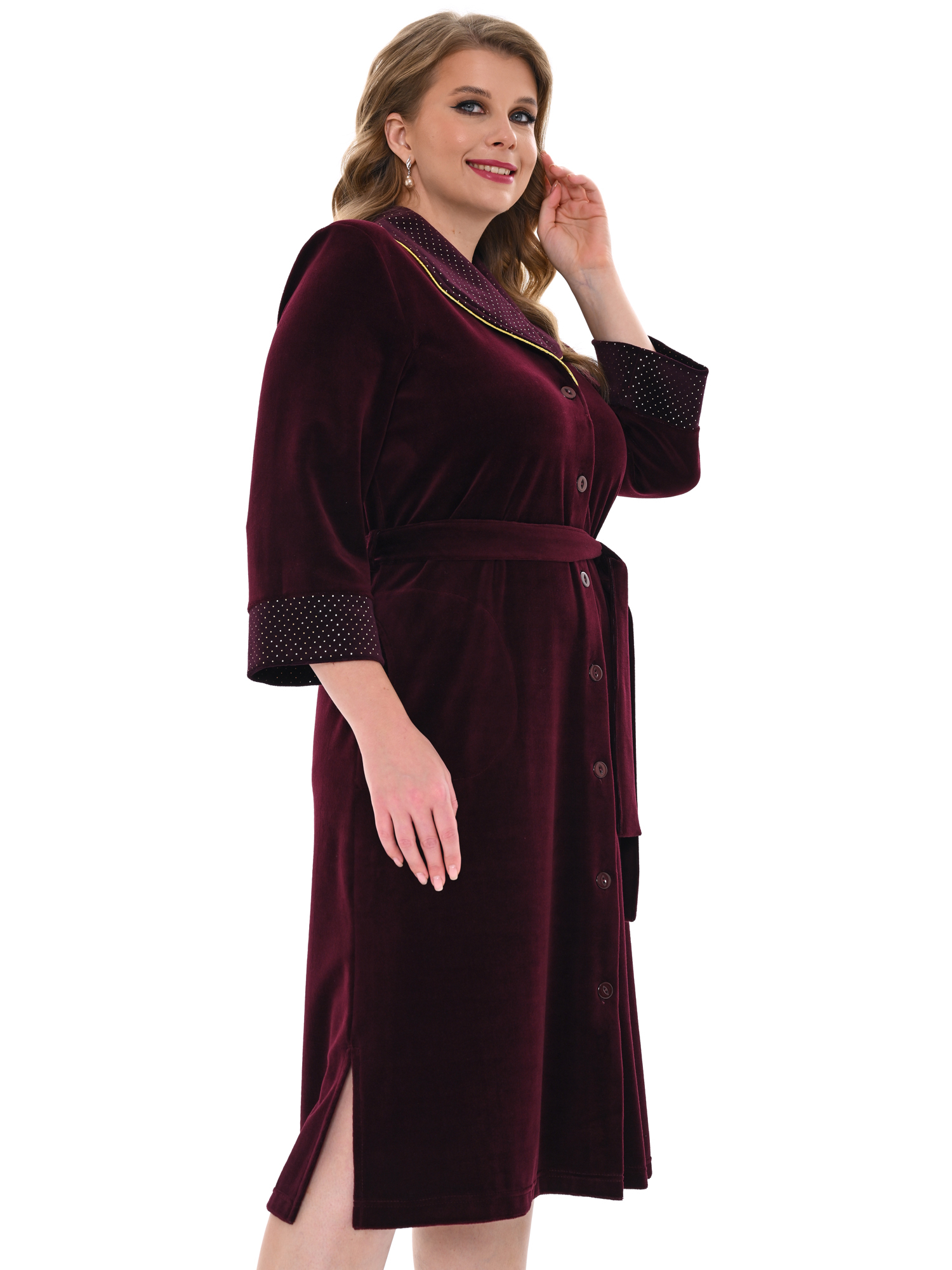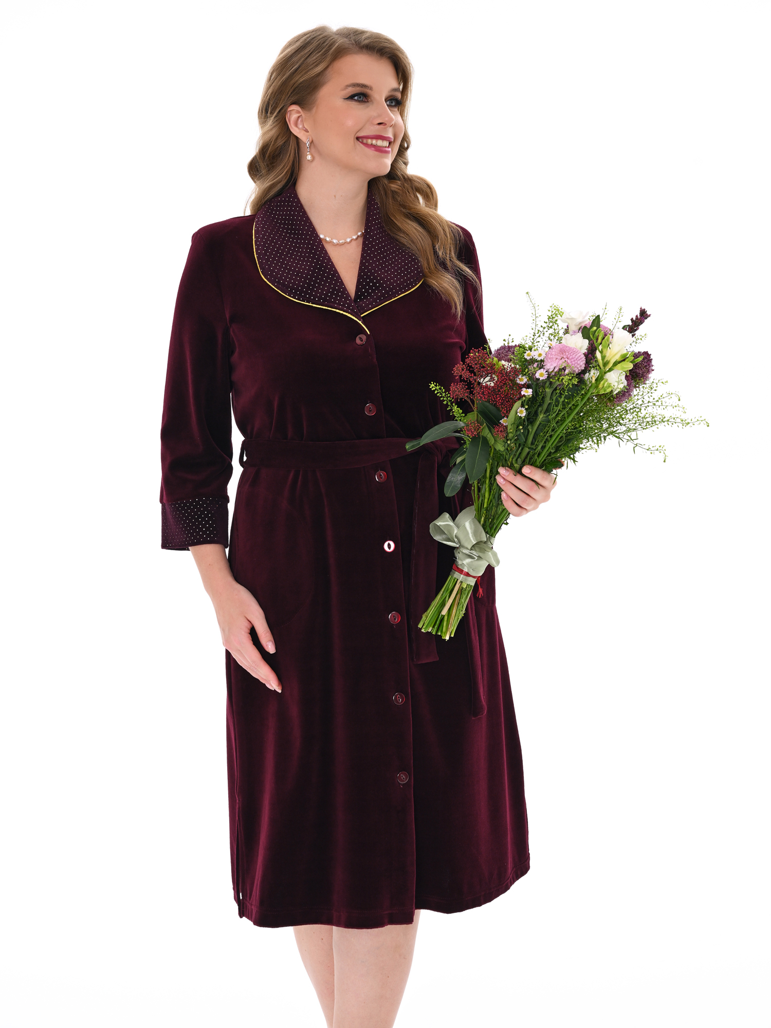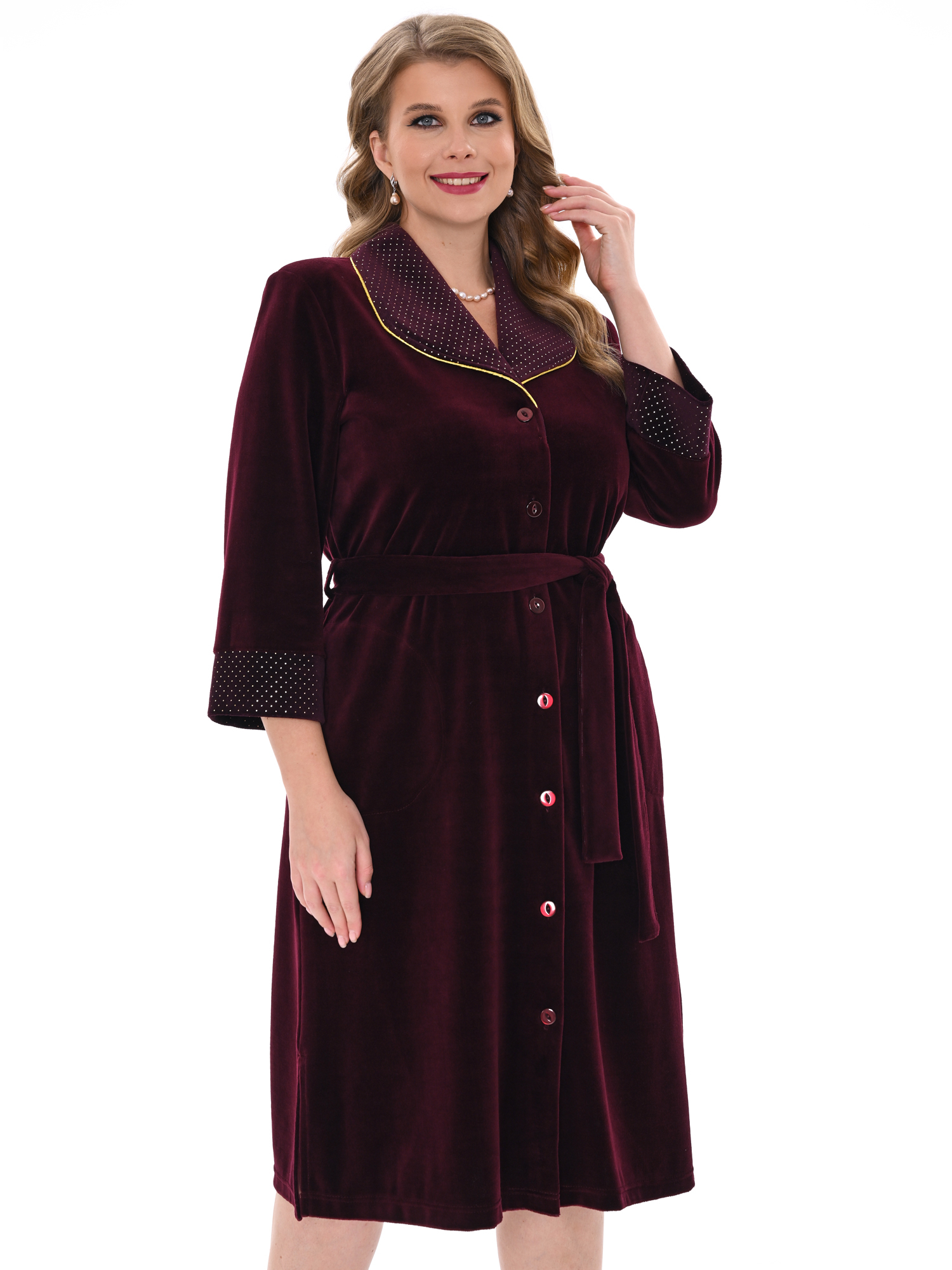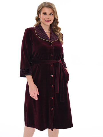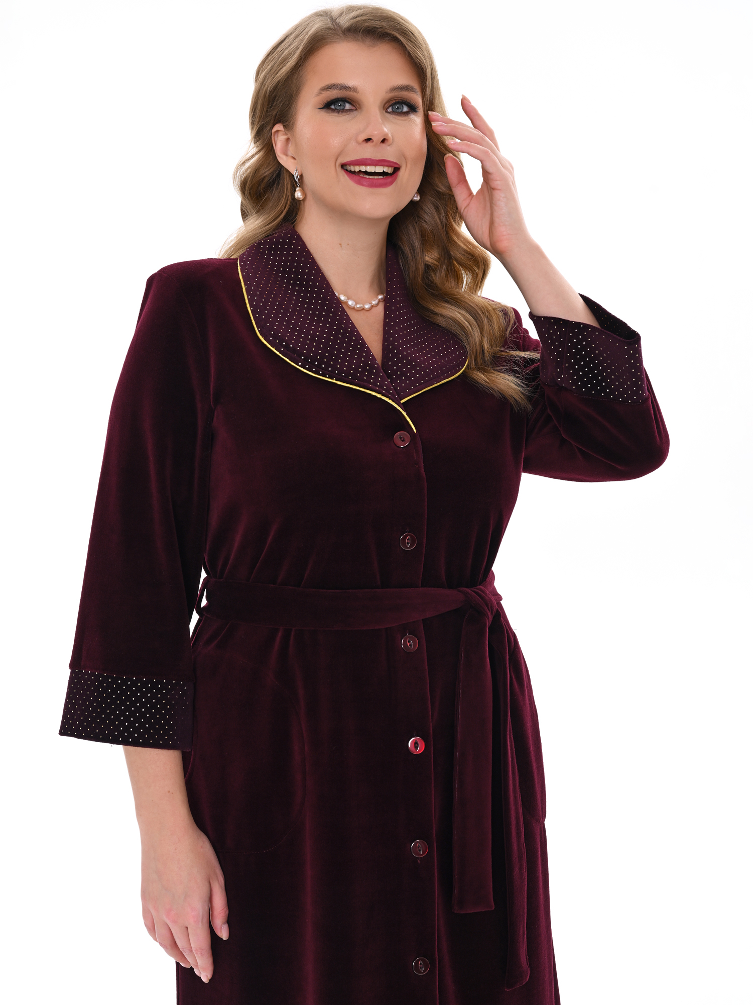 Невероятно мягкий и уютный халат из велюра качества пенье с добавлением полиэстера. Модель на пуговицах, талию подчеркивает съемный пояс. Рукав 3/4, боковые разрезы, имеются карманы и декоративная отделка воротника и манжетов рукавов атласным кантом. Утонченный дизайн в сочетании с оригинальным цветовым решением создают изумительный образ.