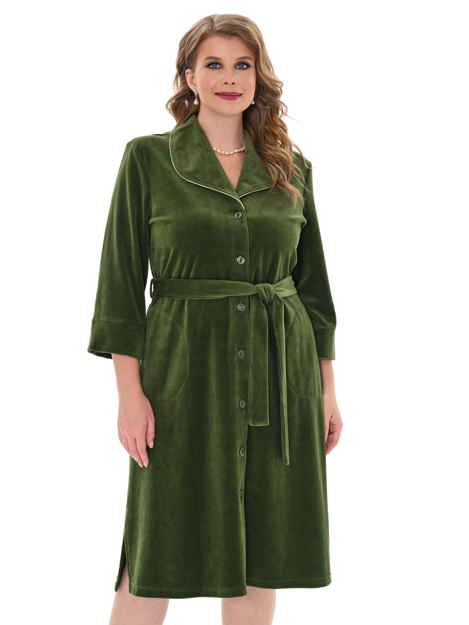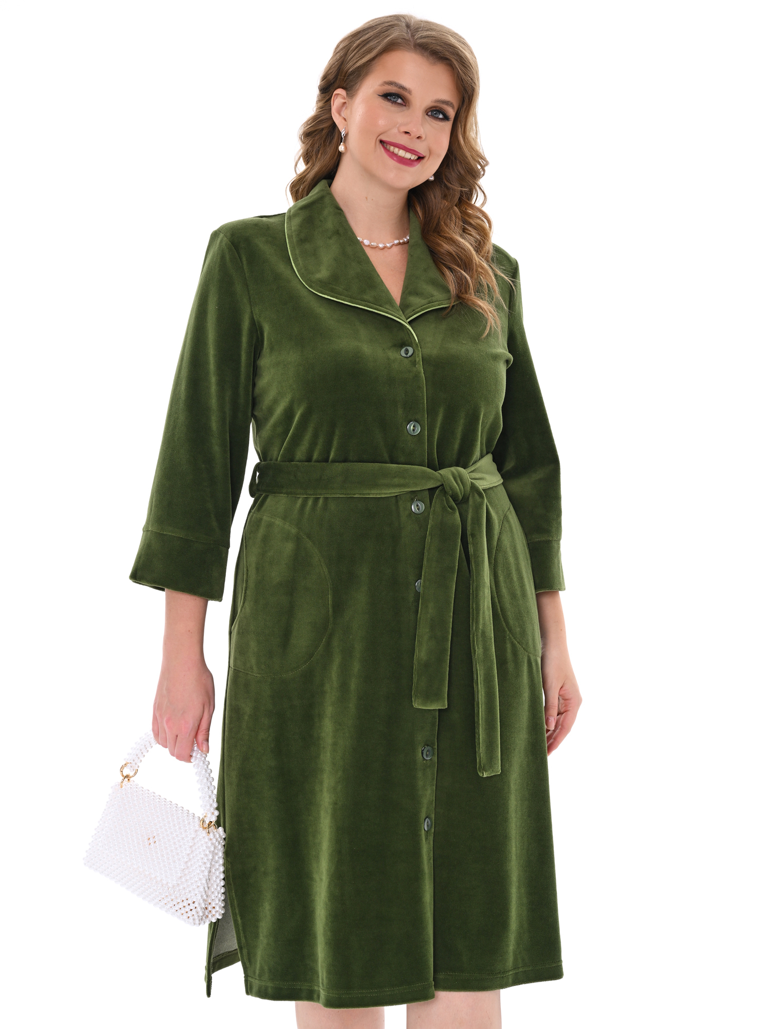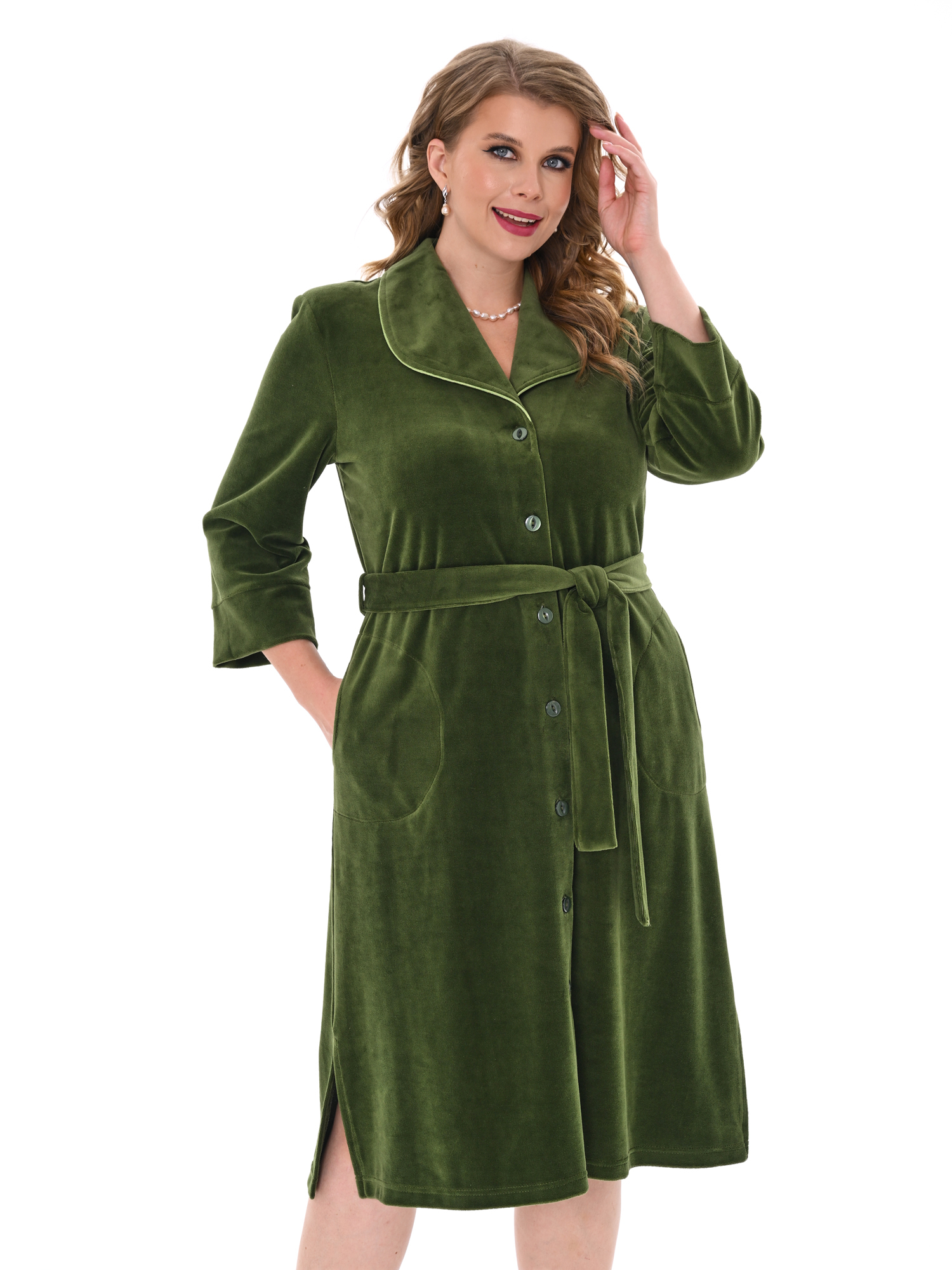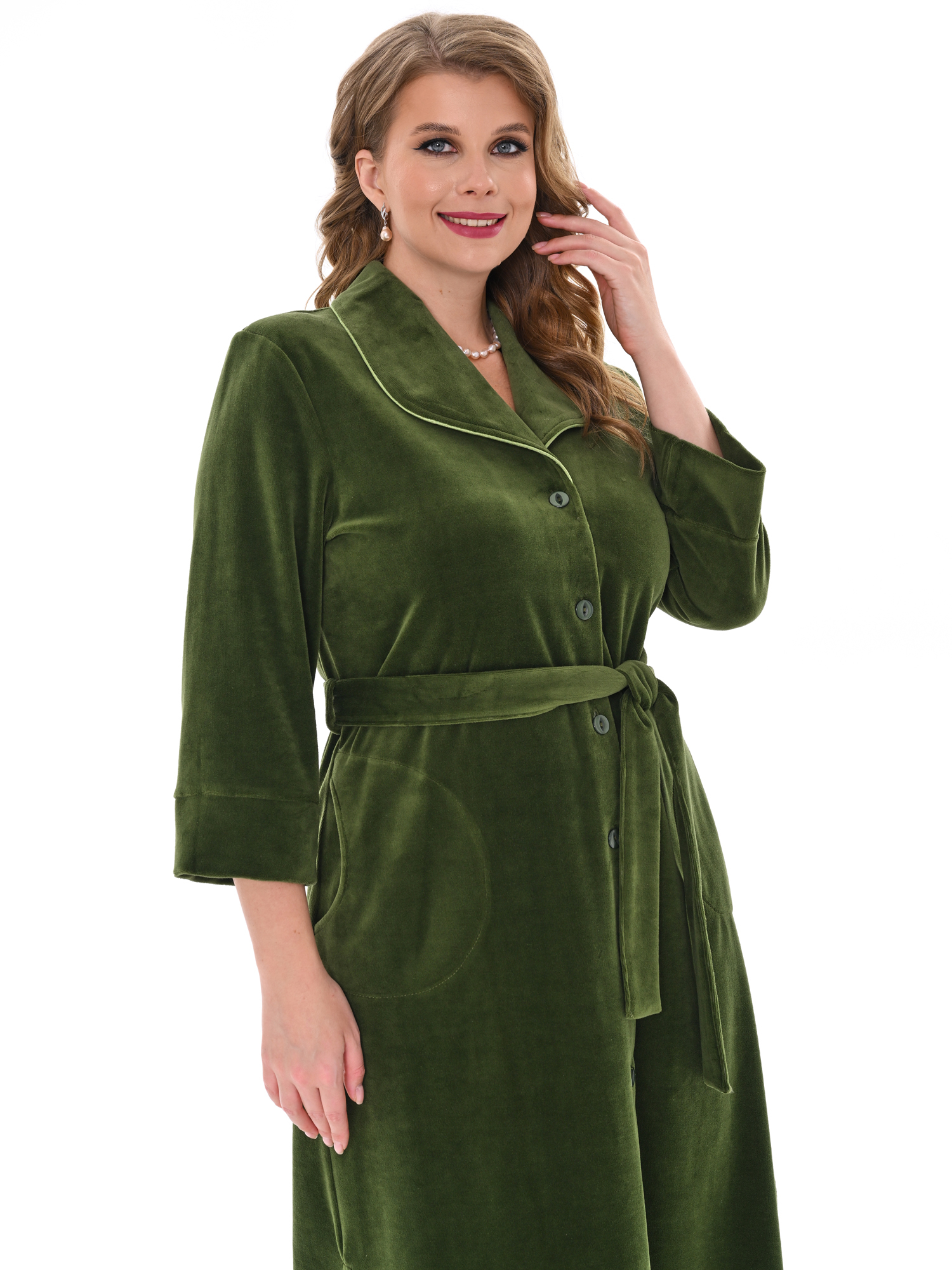 Невероятно мягкий и уютный халат из велюра качества пенье с добавлением полиэстера. Модель на пуговицах, талию подчеркивает съемный пояс. Рукав 3/4, боковые разрезы, имеются карманы и декоративная отделка воротника и манжетов рукавов атласным кантом. Утонченный дизайн в сочетании с оригинальным цветовым решением создают изумительный образ.