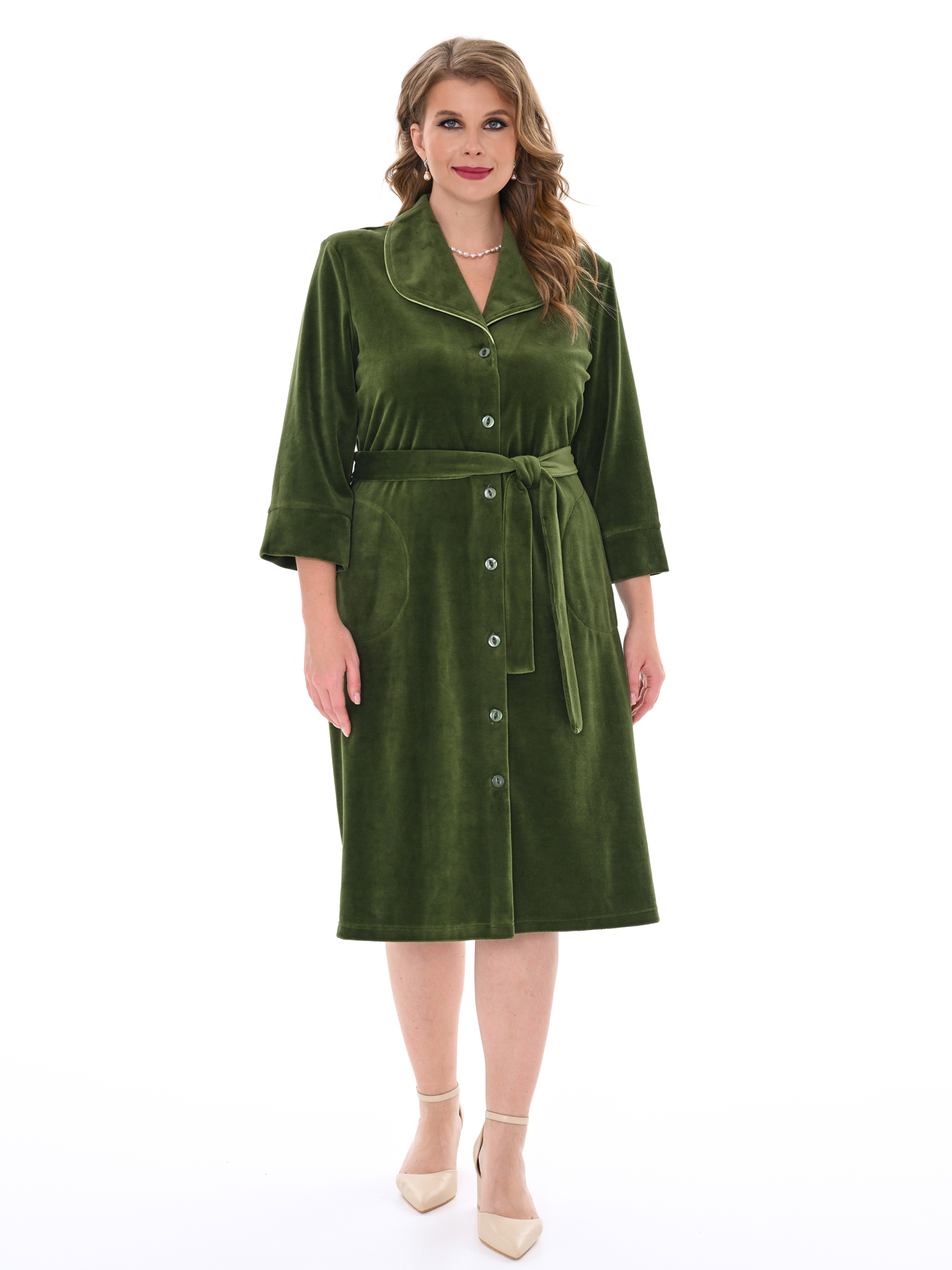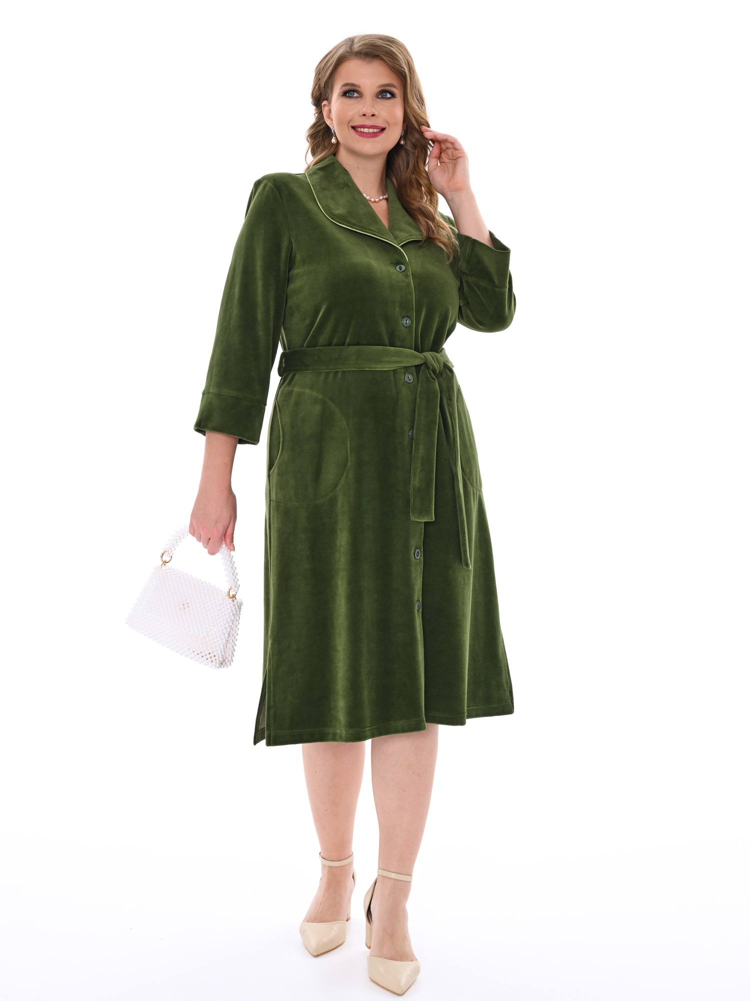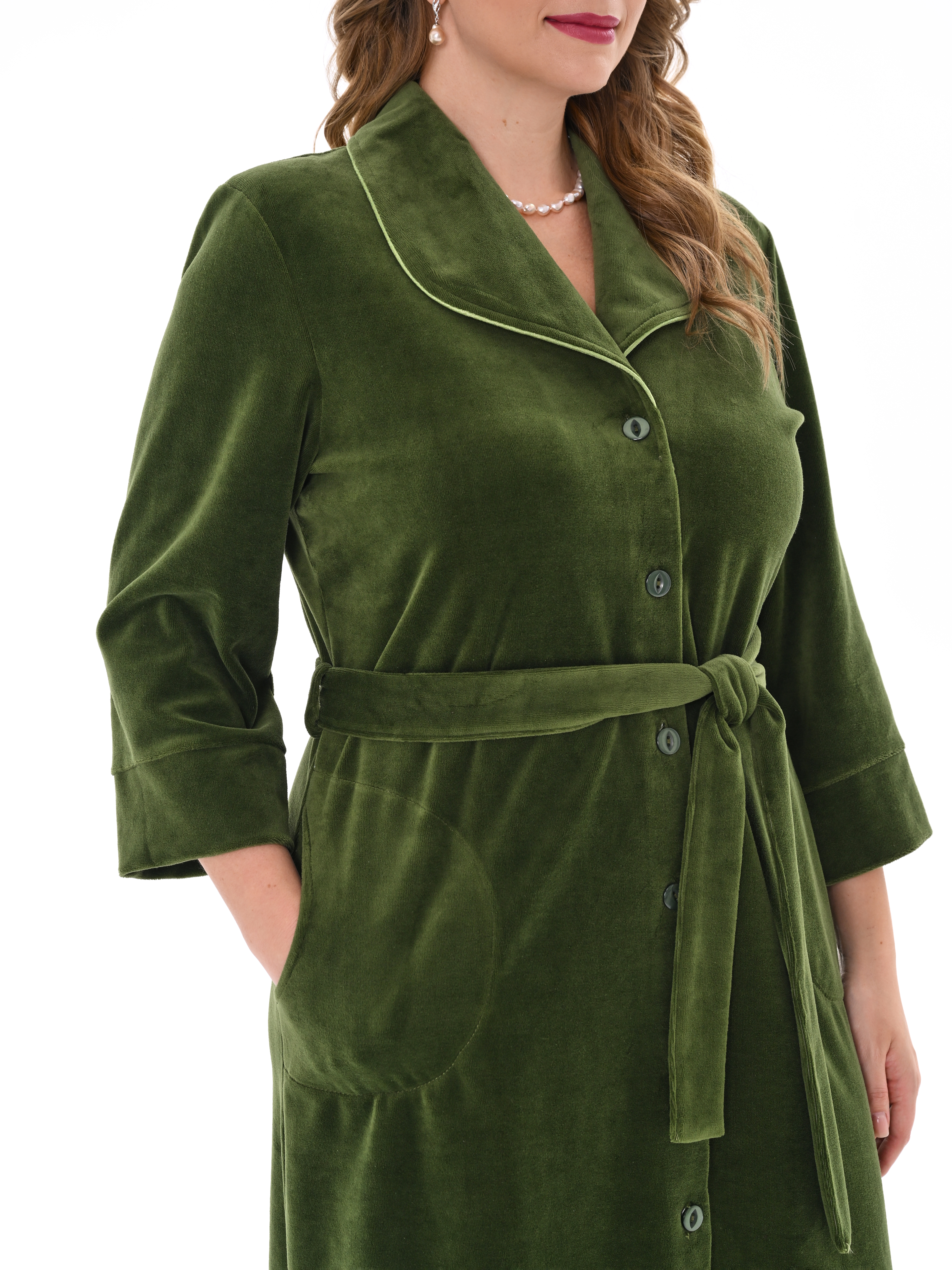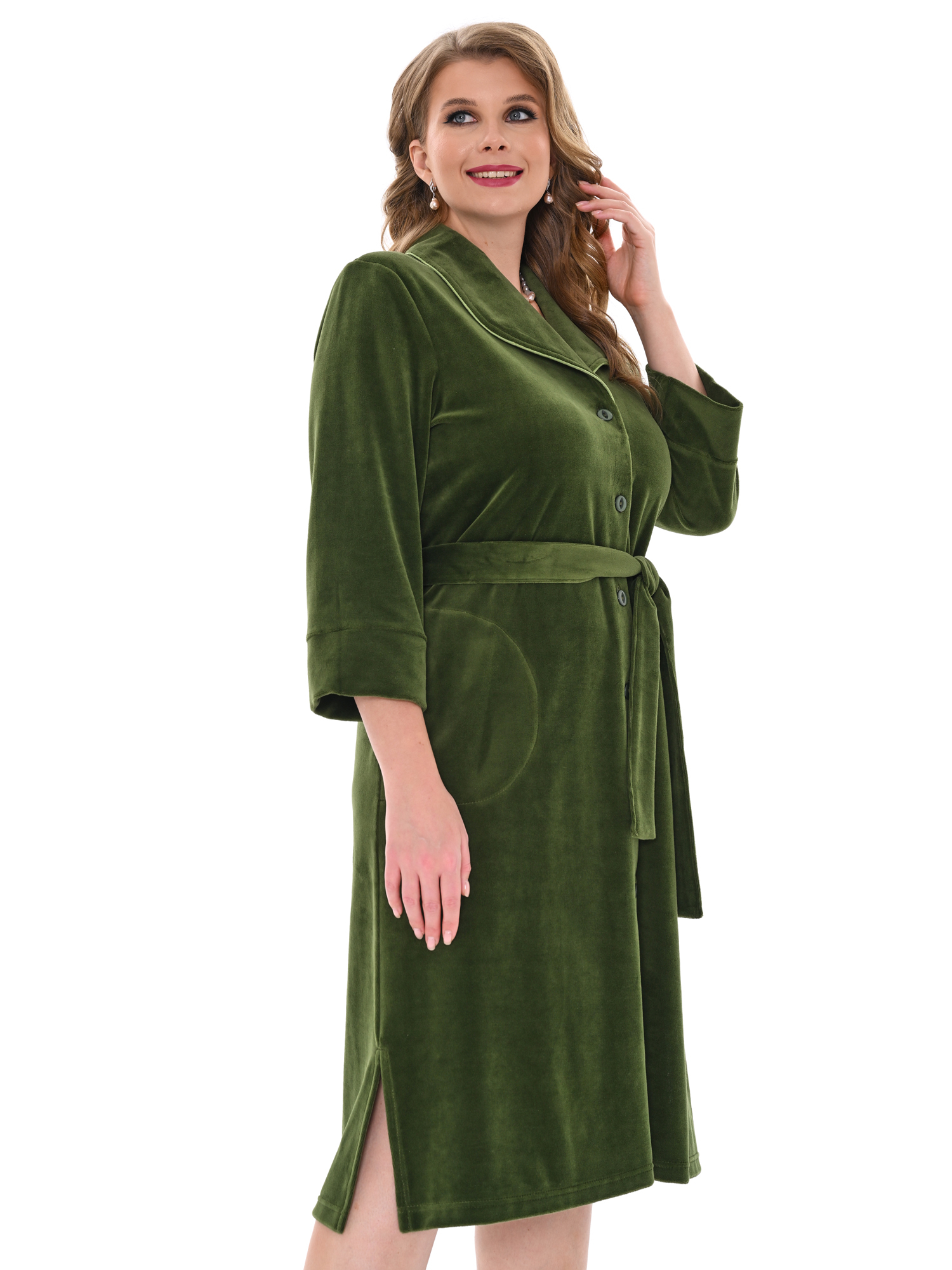 Невероятно мягкий и уютный халат из велюра качества пенье с добавлением полиэстера. Модель на пуговицах, талию подчеркивает съемный пояс. Рукав 3/4, боковые разрезы, имеются карманы и декоративная отделка воротника и манжетов рукавов атласным кантом. Утонченный дизайн в сочетании с оригинальным цветовым решением создают изумительный образ.