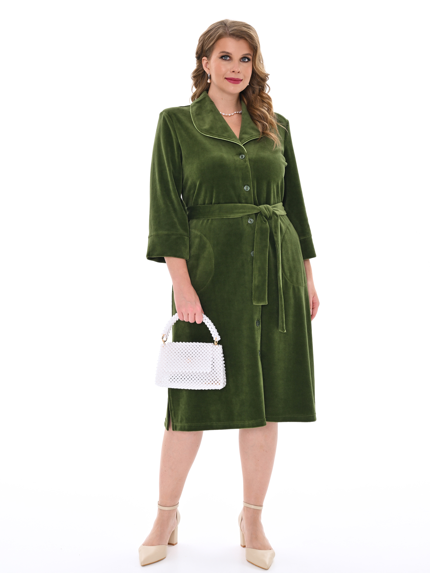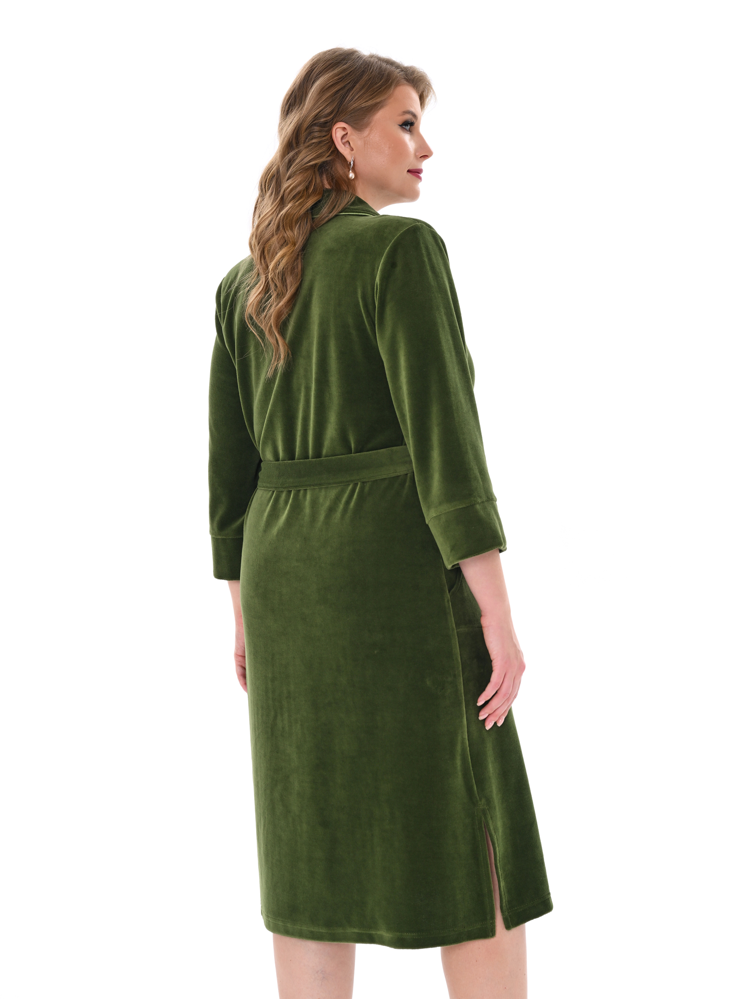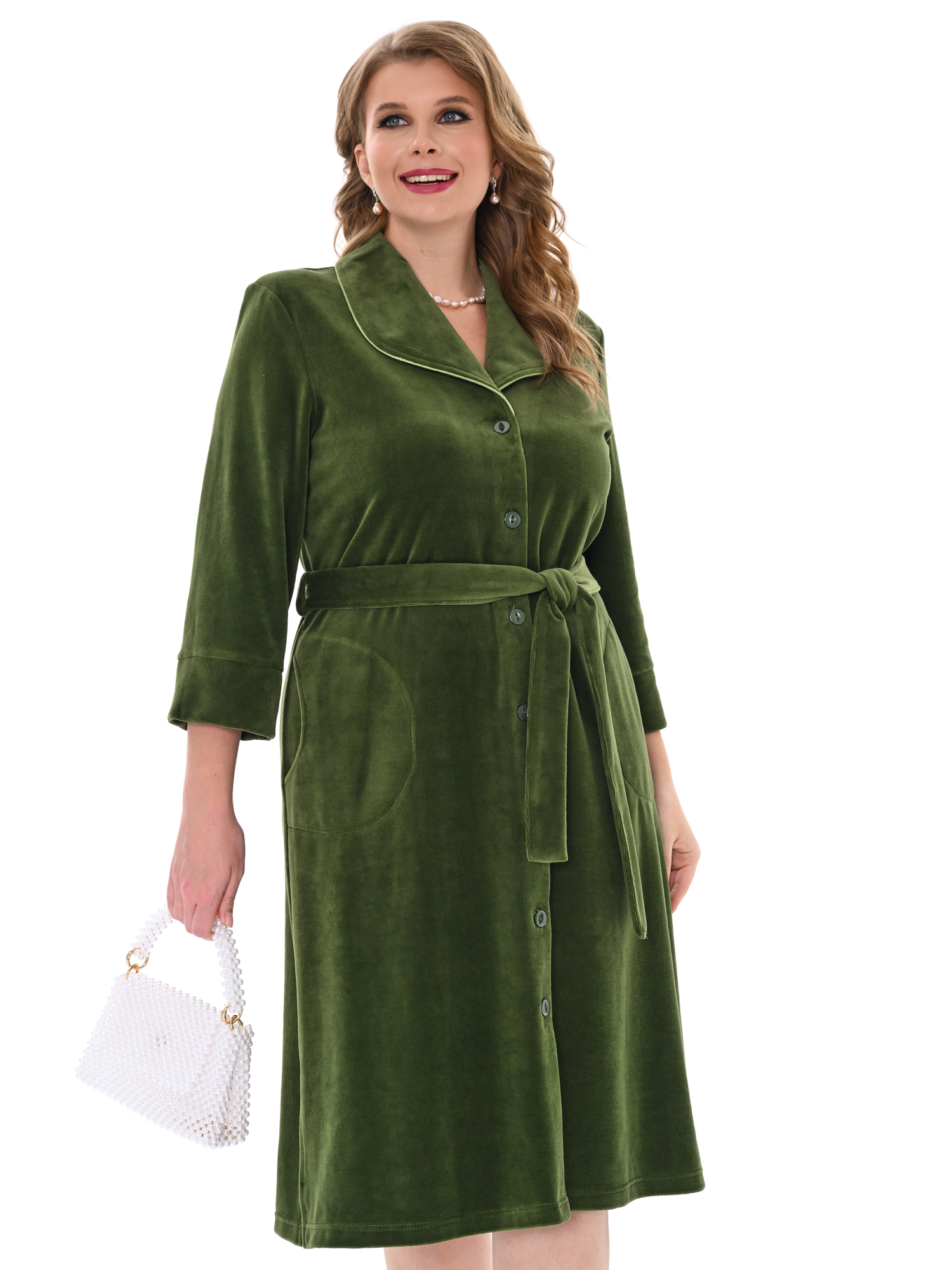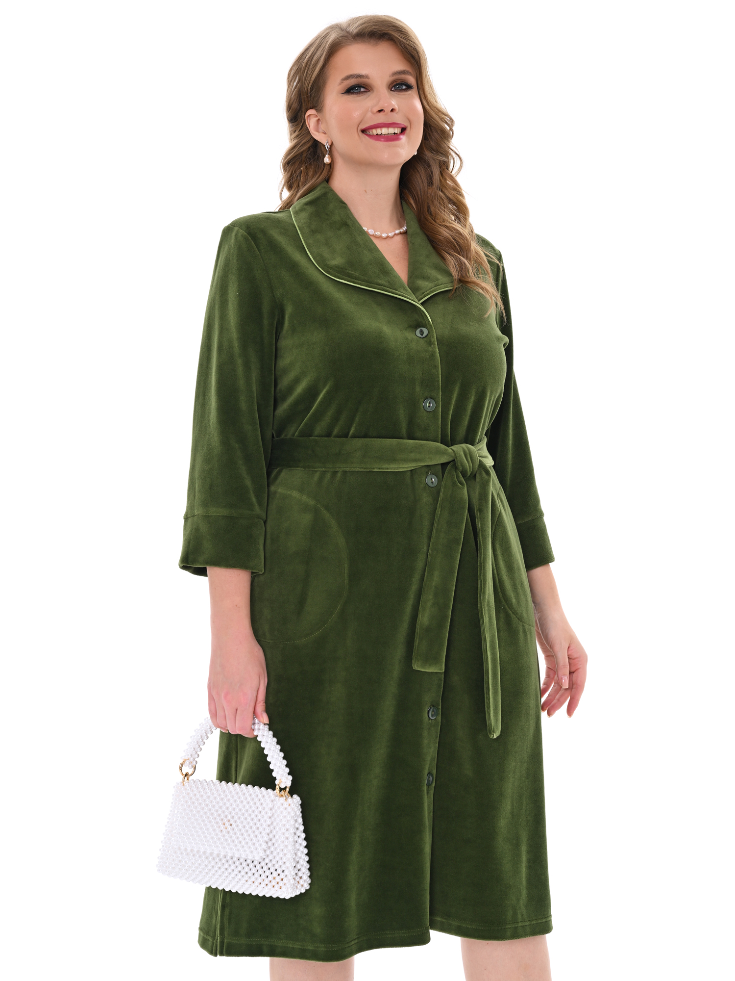 Невероятно мягкий и уютный халат из велюра качества пенье с добавлением полиэстера. Модель на пуговицах, талию подчеркивает съемный пояс. Рукав 3/4, боковые разрезы, имеются карманы и декоративная отделка воротника и манжетов рукавов атласным кантом. Утонченный дизайн в сочетании с оригинальным цветовым решением создают изумительный образ.
