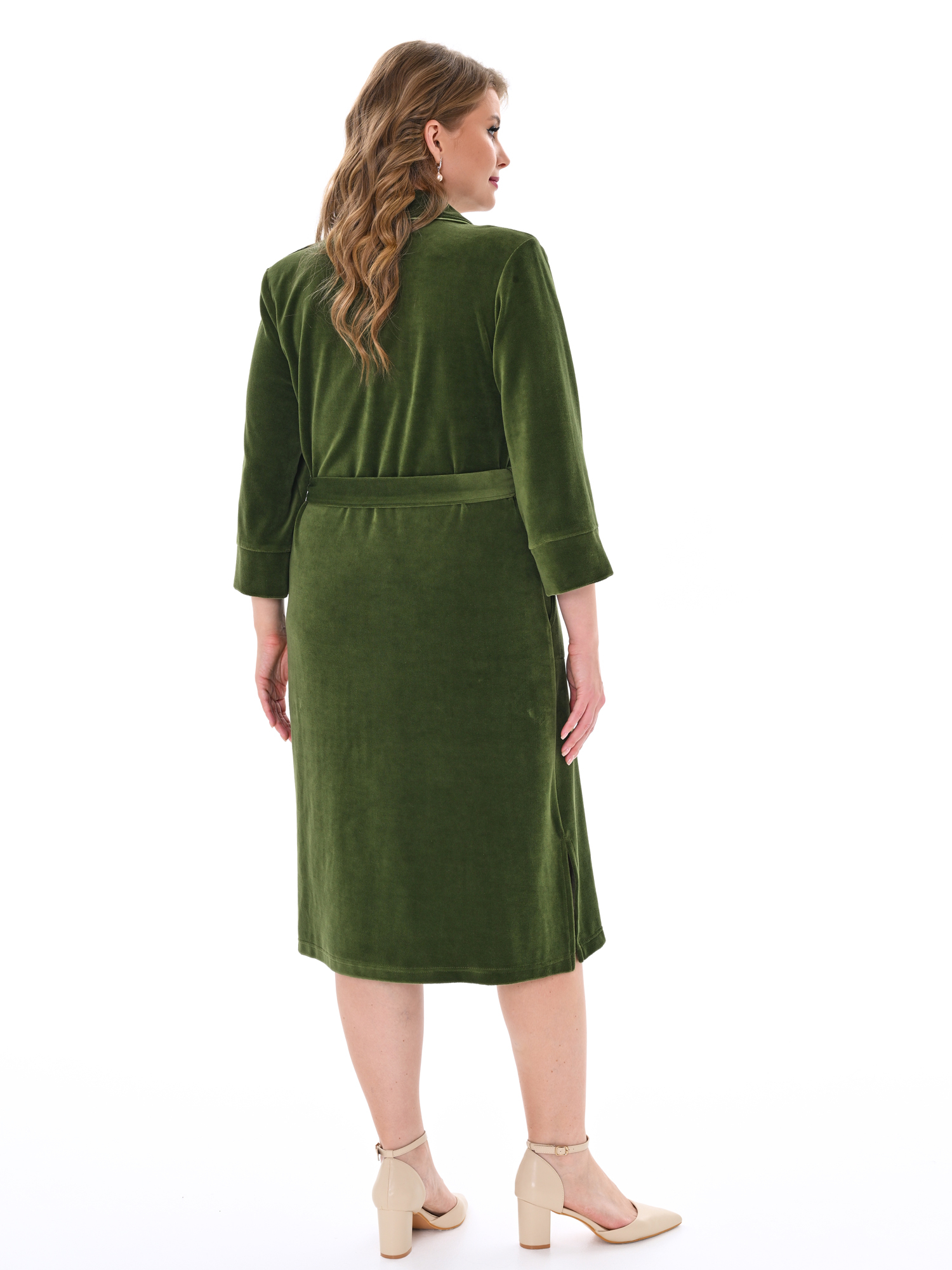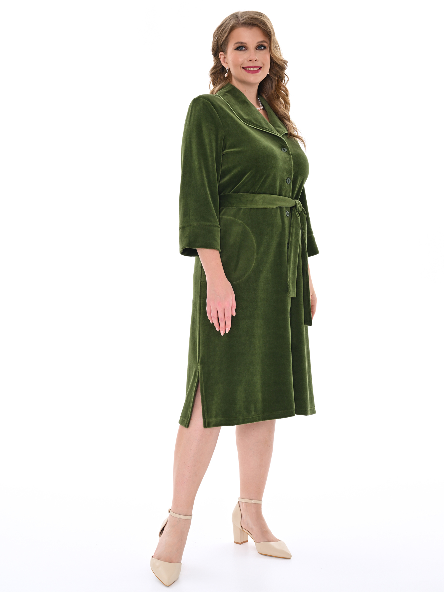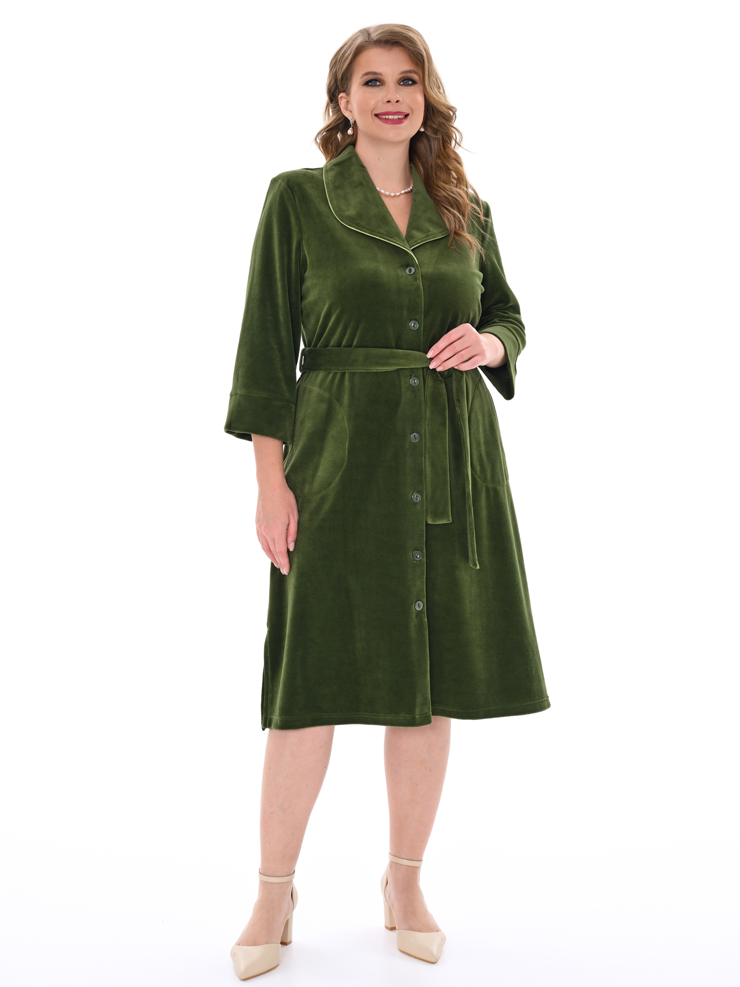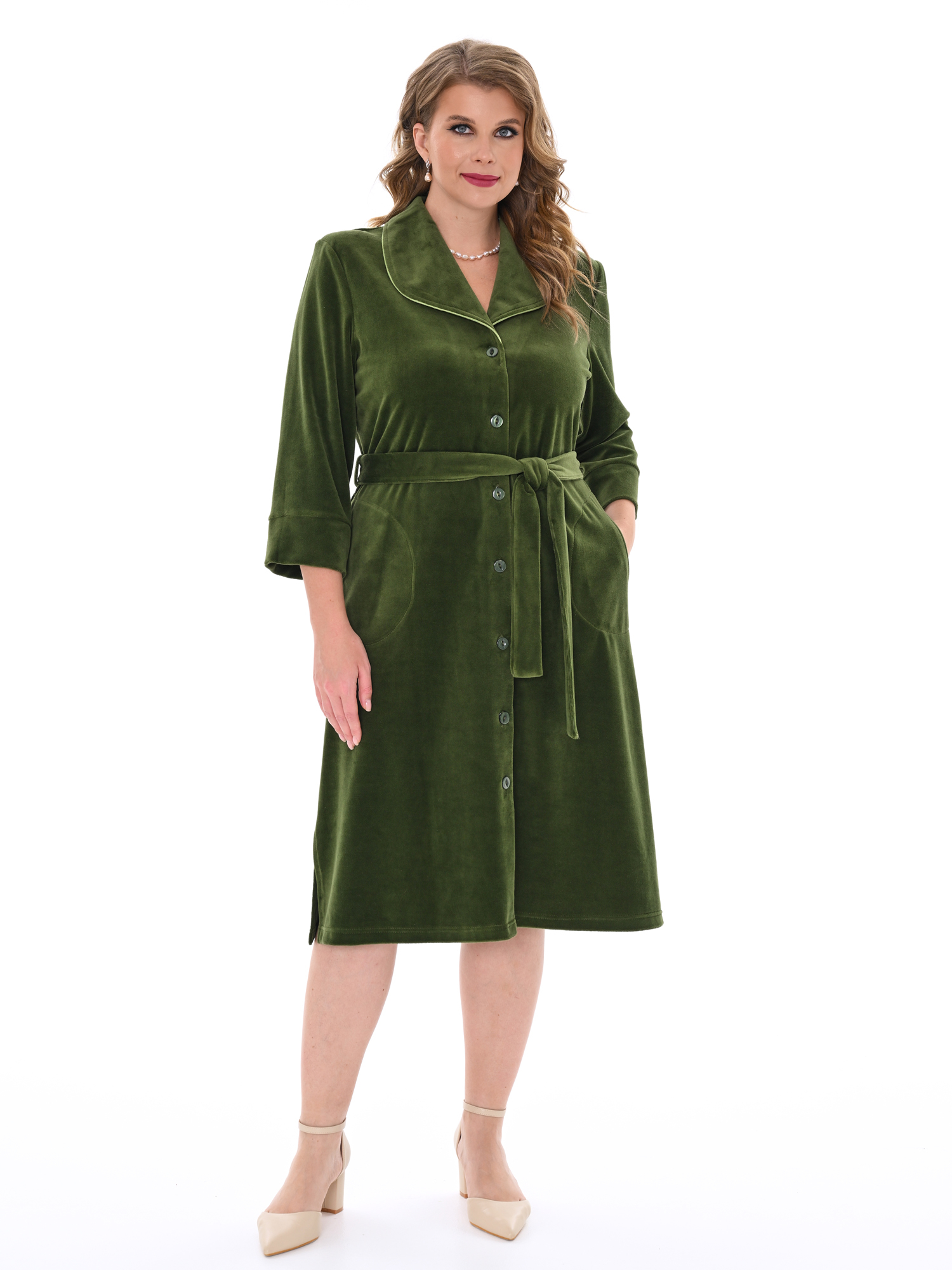 Невероятно мягкий и уютный халат из велюра качества пенье с добавлением полиэстера. Модель на пуговицах, талию подчеркивает съемный пояс. Рукав 3/4, боковые разрезы, имеются карманы и декоративная отделка воротника и манжетов рукавов атласным кантом. Утонченный дизайн в сочетании с оригинальным цветовым решением создают изумительный образ.