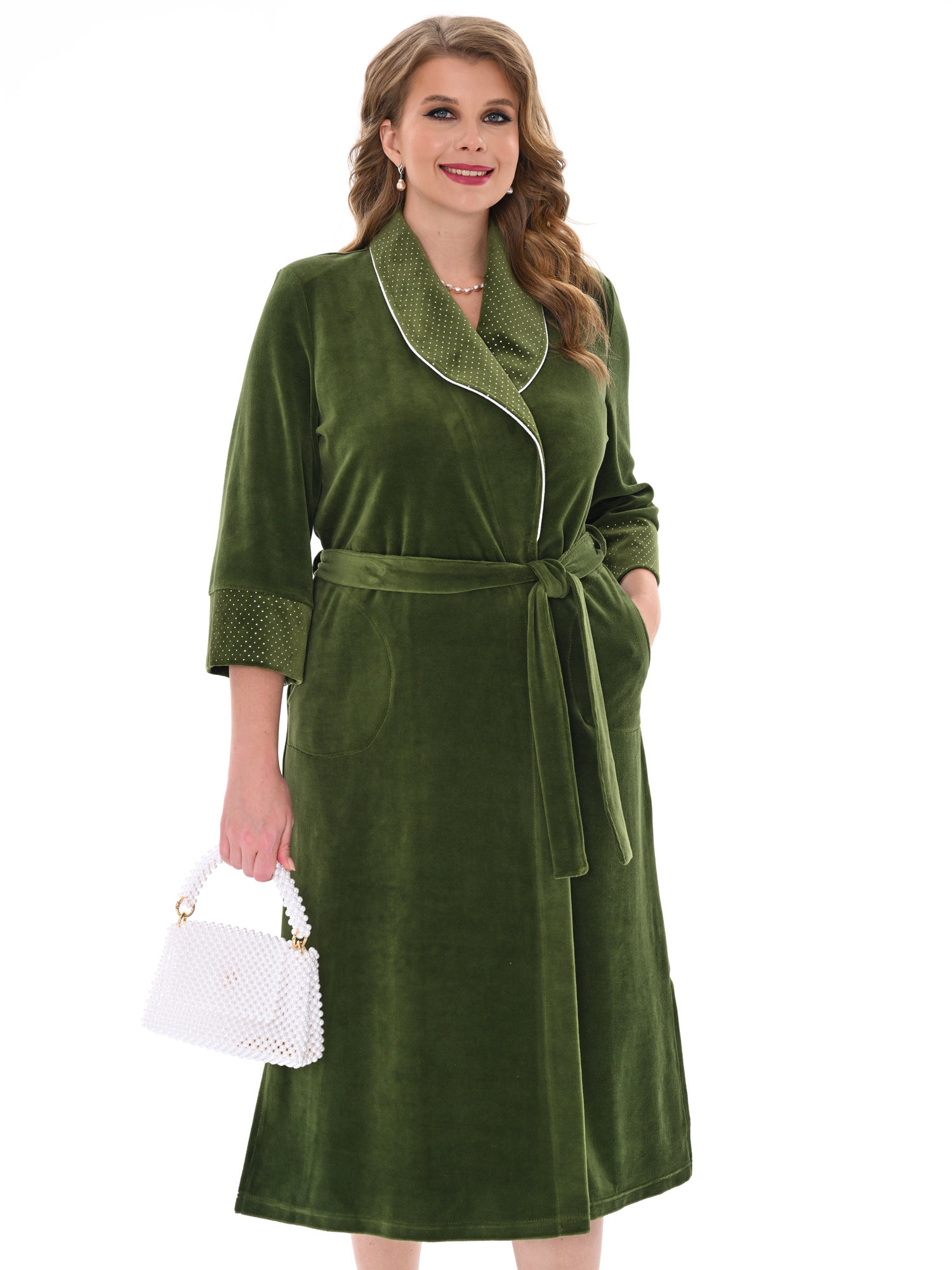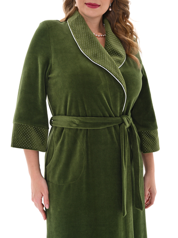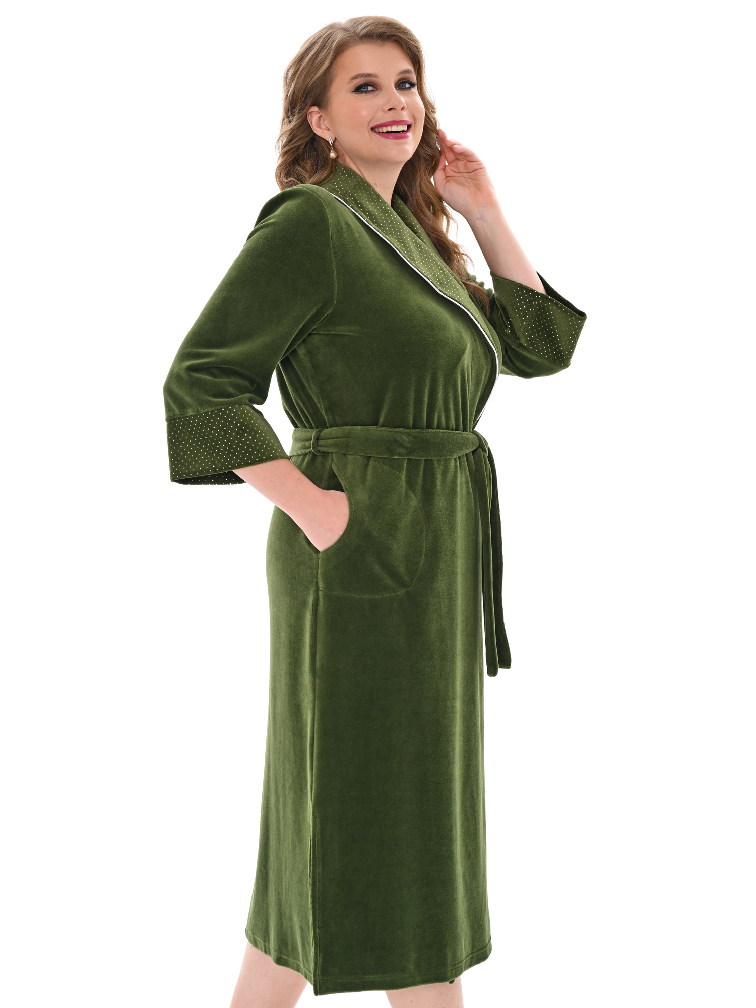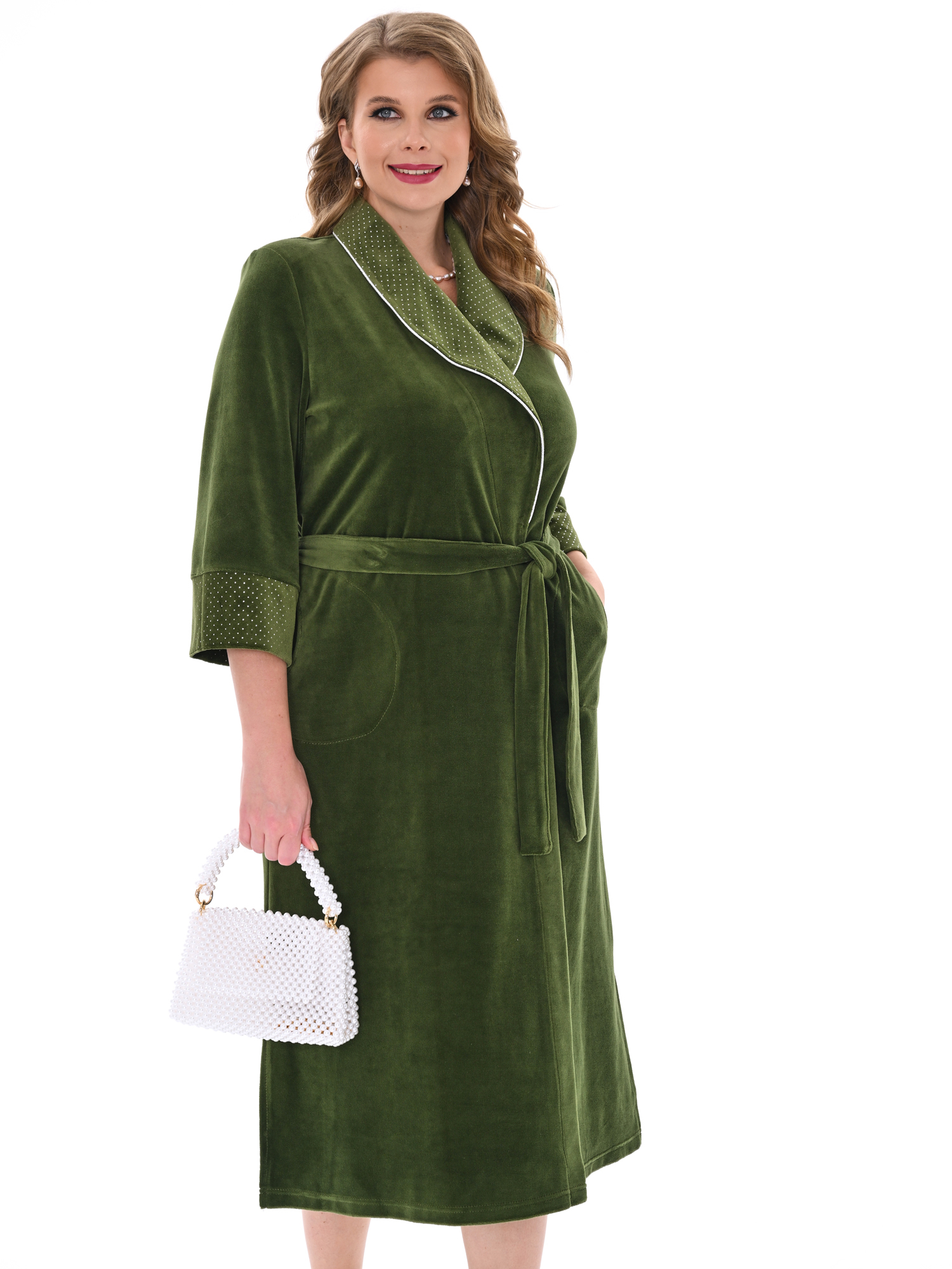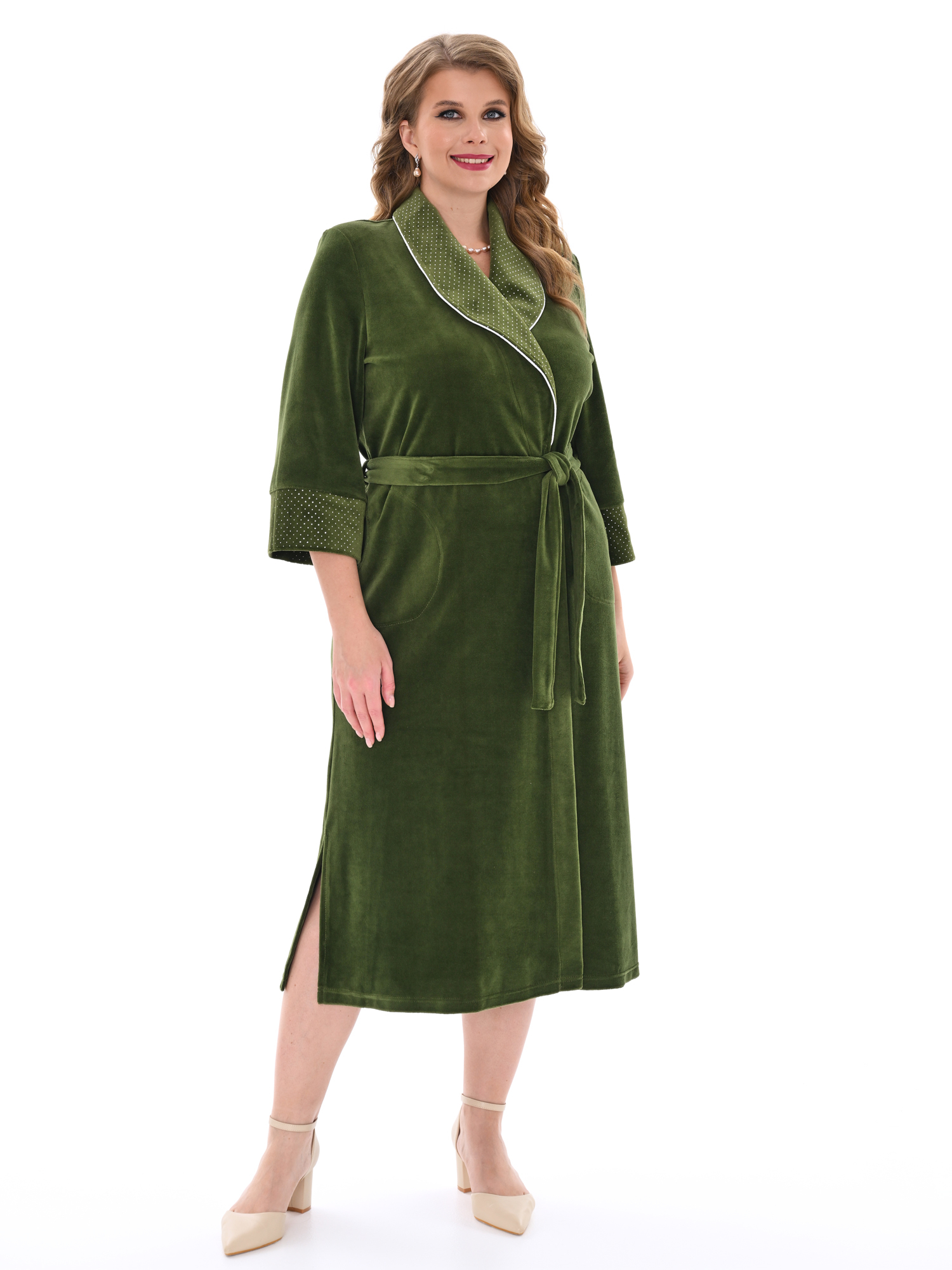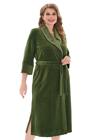 Невероятно мягкий и уютный халат из велюра пенье с добавлением полиэстера, декоративной отделкой глиттер. Модель прямого силуэта на запахе, талию подчеркивает съемный пояс. Рукав 3/4, боковые разрезы, имеются карманы и декоративная отделка воротника и манжетов рукавов однотонным велюром. Утонченный дизайн в сочетании с оригинальным цветовым решением создают изумительный образ,