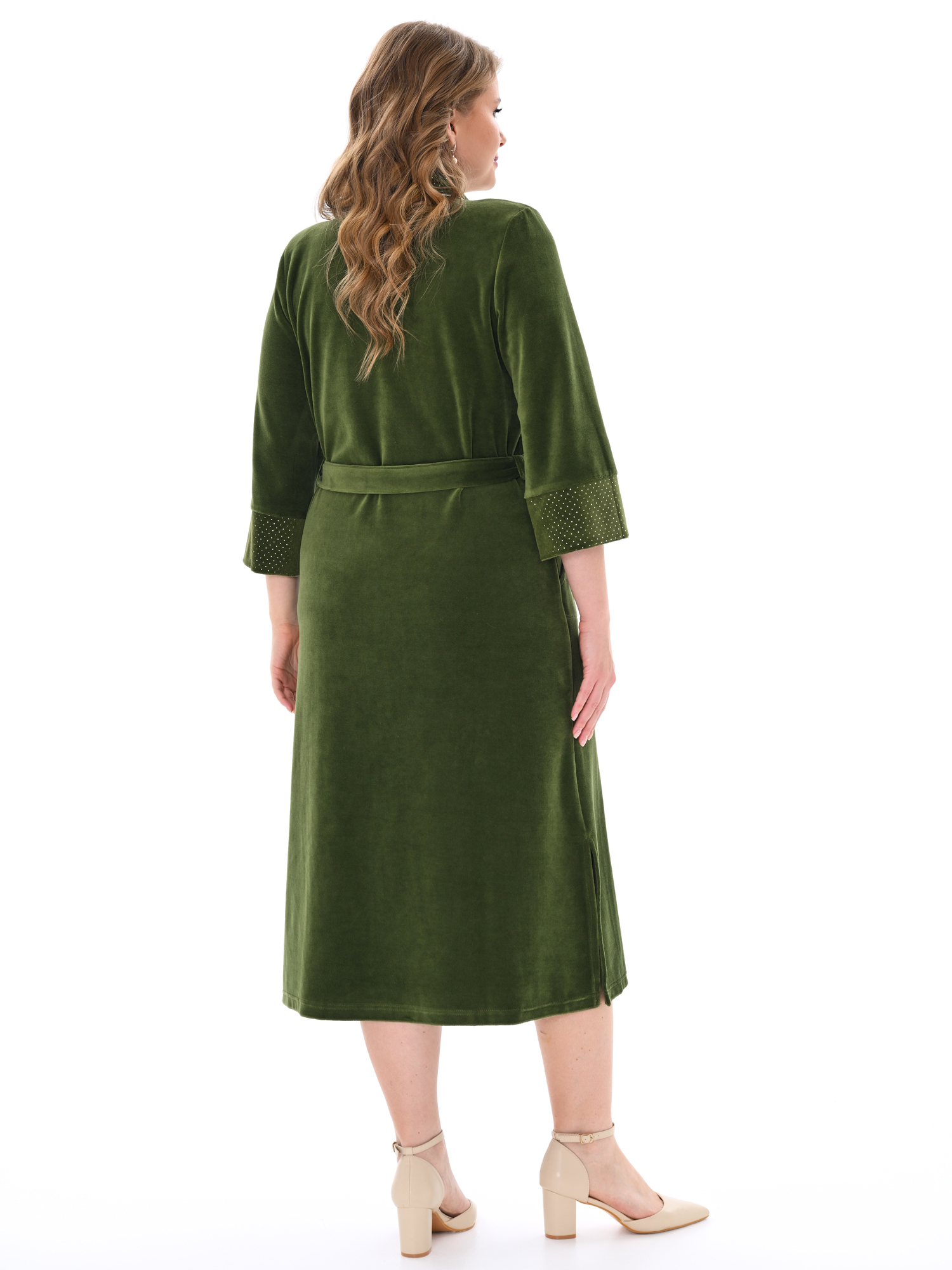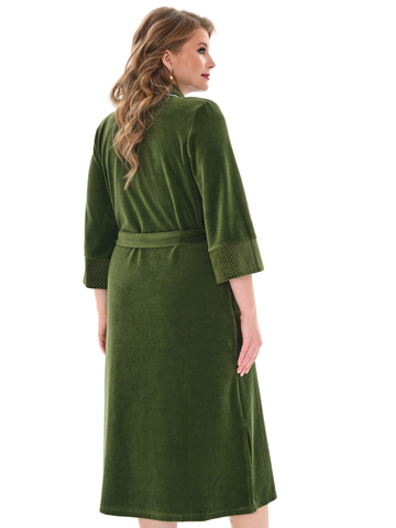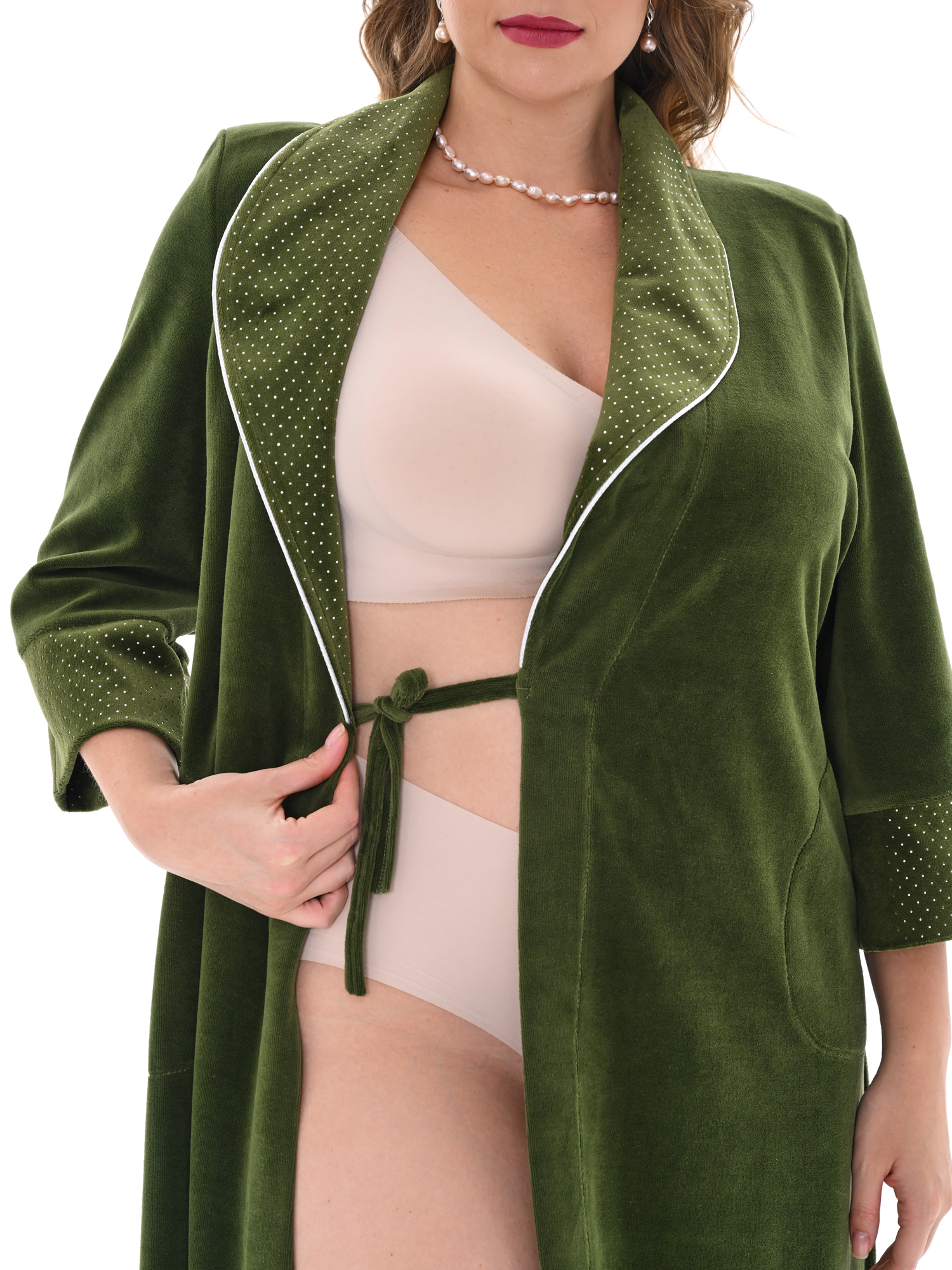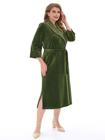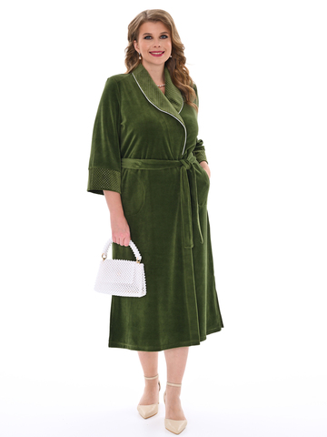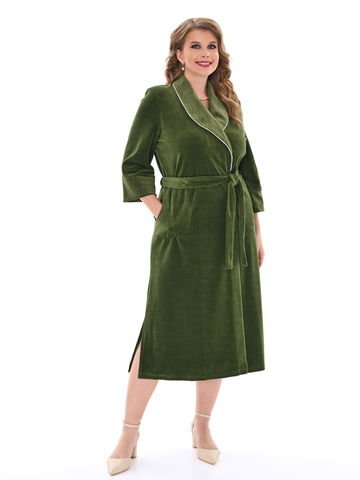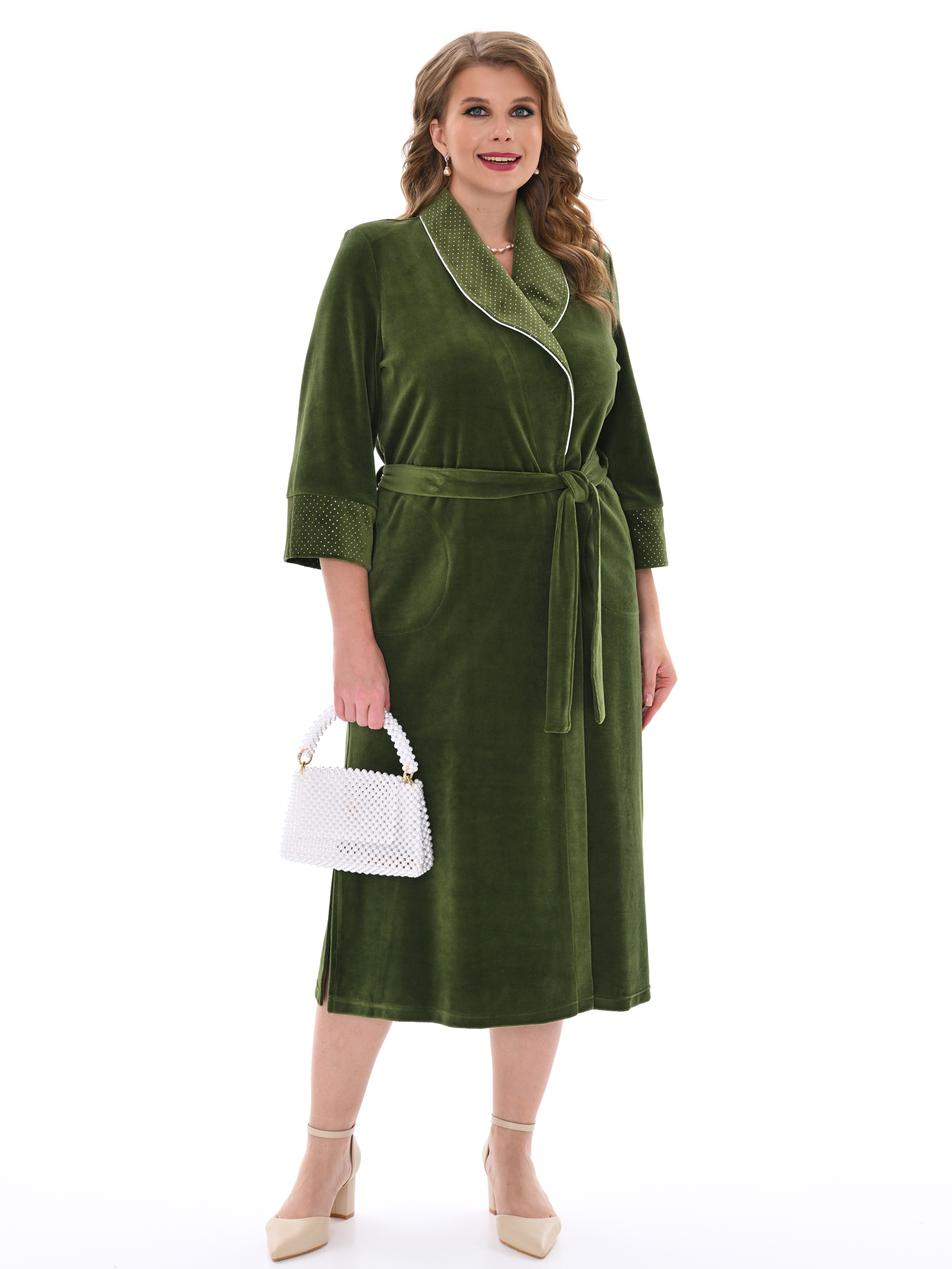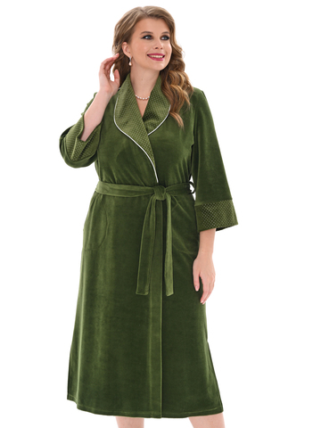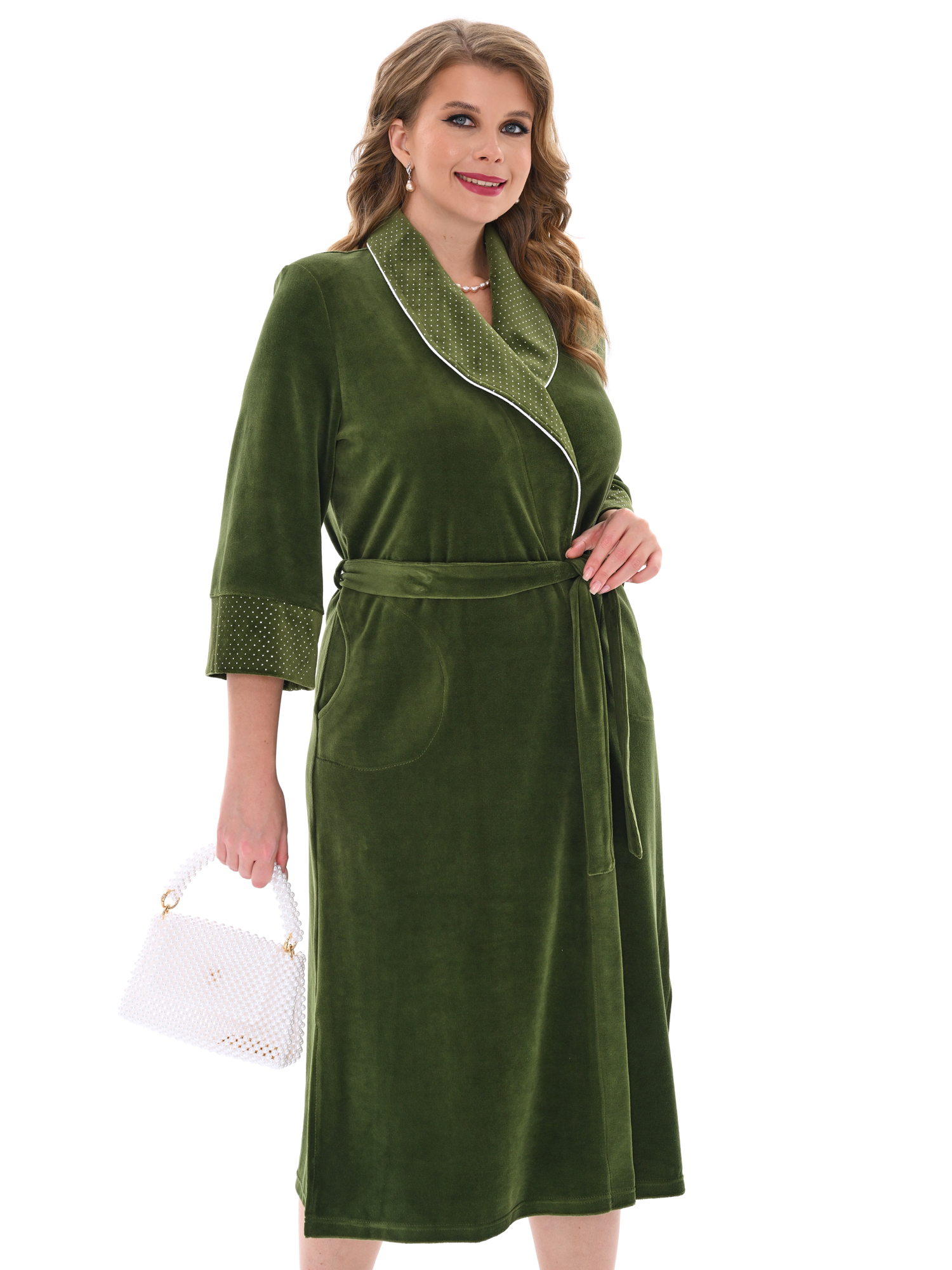 Невероятно мягкий и уютный халат из велюра пенье с добавлением полиэстера, декоративной отделкой глиттер. Модель прямого силуэта на запахе, талию подчеркивает съемный пояс. Рукав 3/4, боковые разрезы, имеются карманы и декоративная отделка воротника и манжетов рукавов однотонным велюром. Утонченный дизайн в сочетании с оригинальным цветовым решением создают изумительный образ,