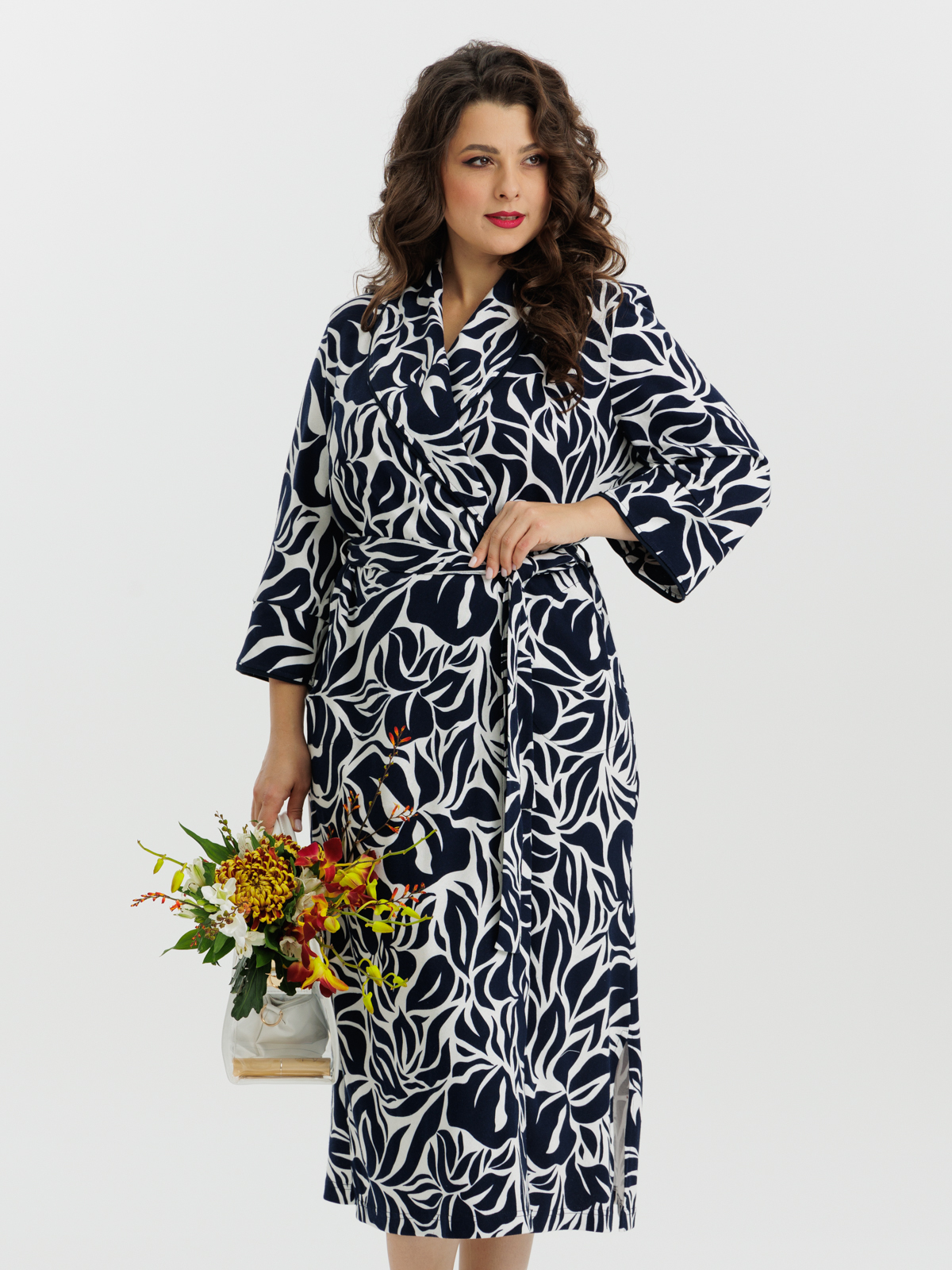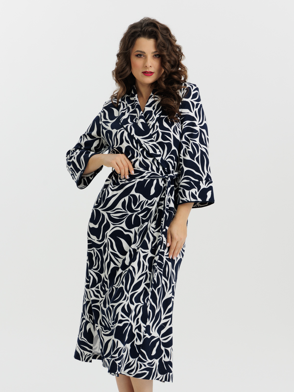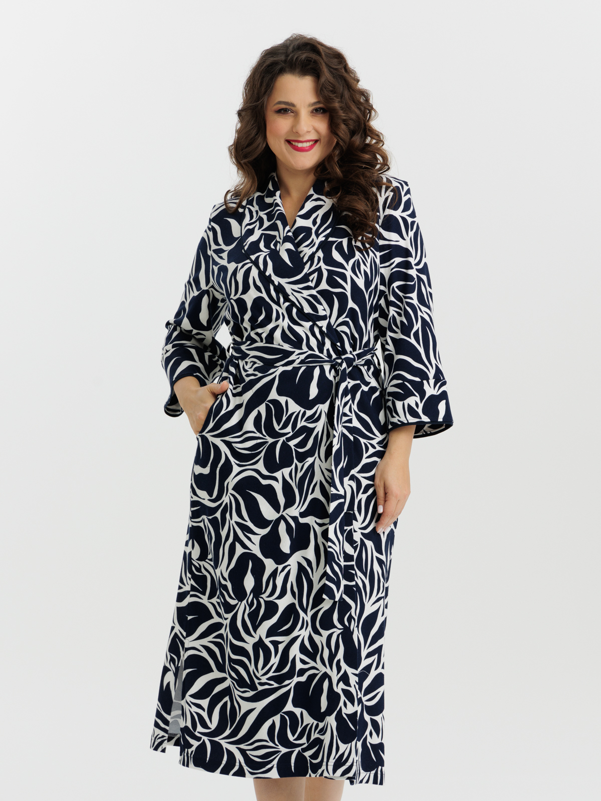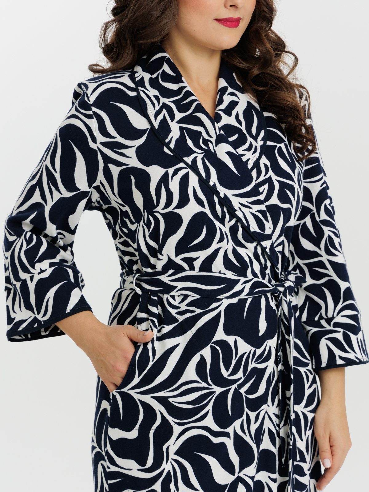 Стильный и уютный халат с карманами, боковыми разрезами и рукавом 3/4. Модель прямого силуэта на запахе, талию подчеркивает съемный пояс. Воротник и манжеты рукавов отдекорированы контрастным кантом. Утонченный дизайн в сочетании с оригинальным цветовым решением создают изумительный образ.