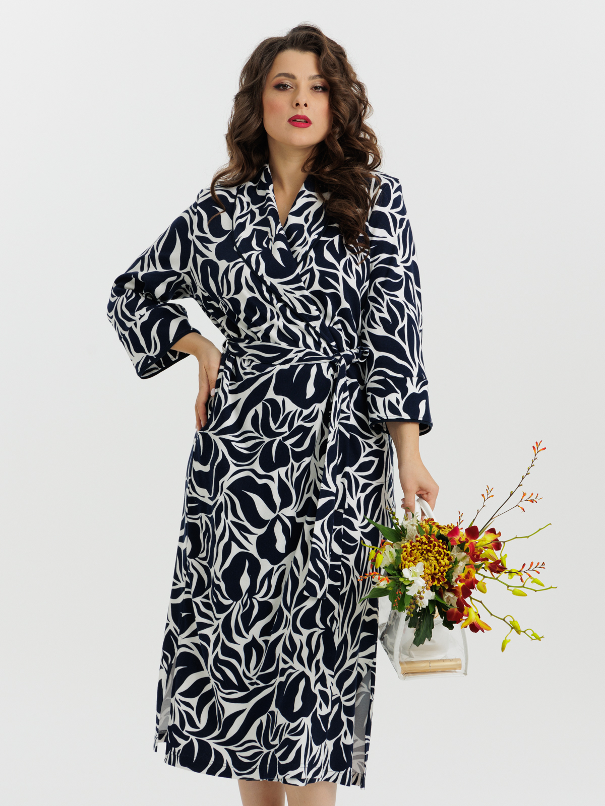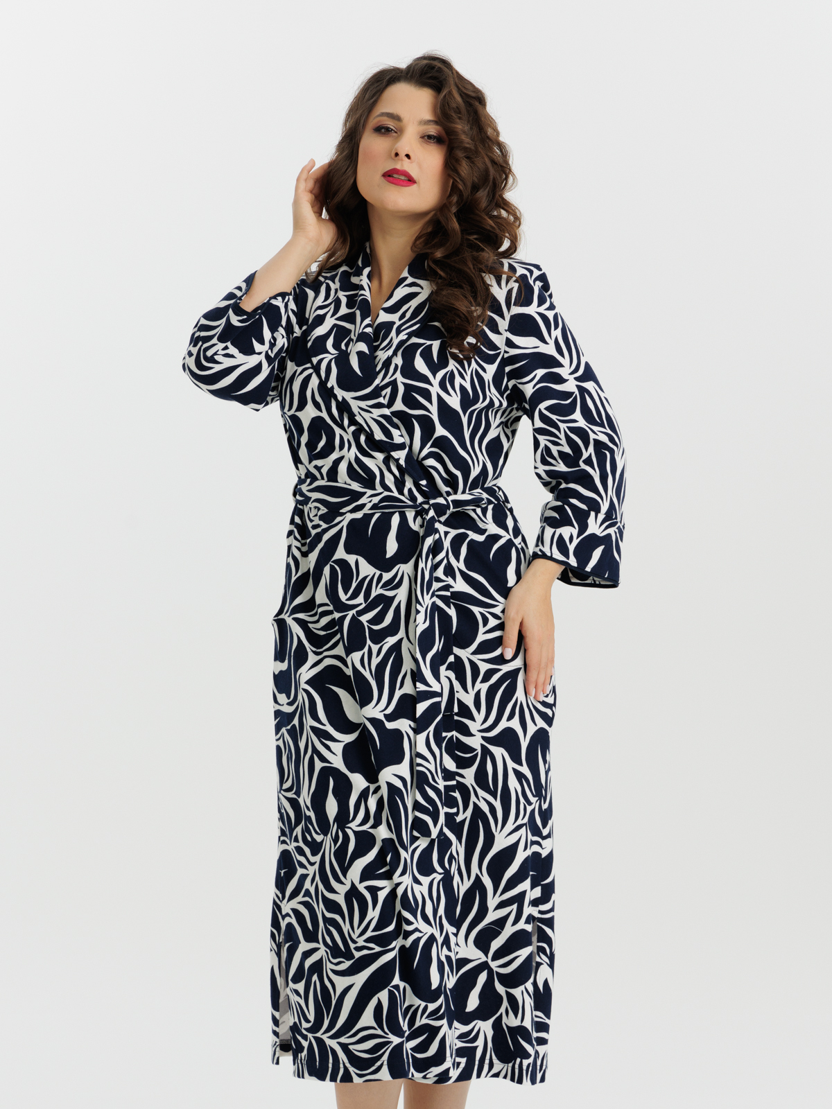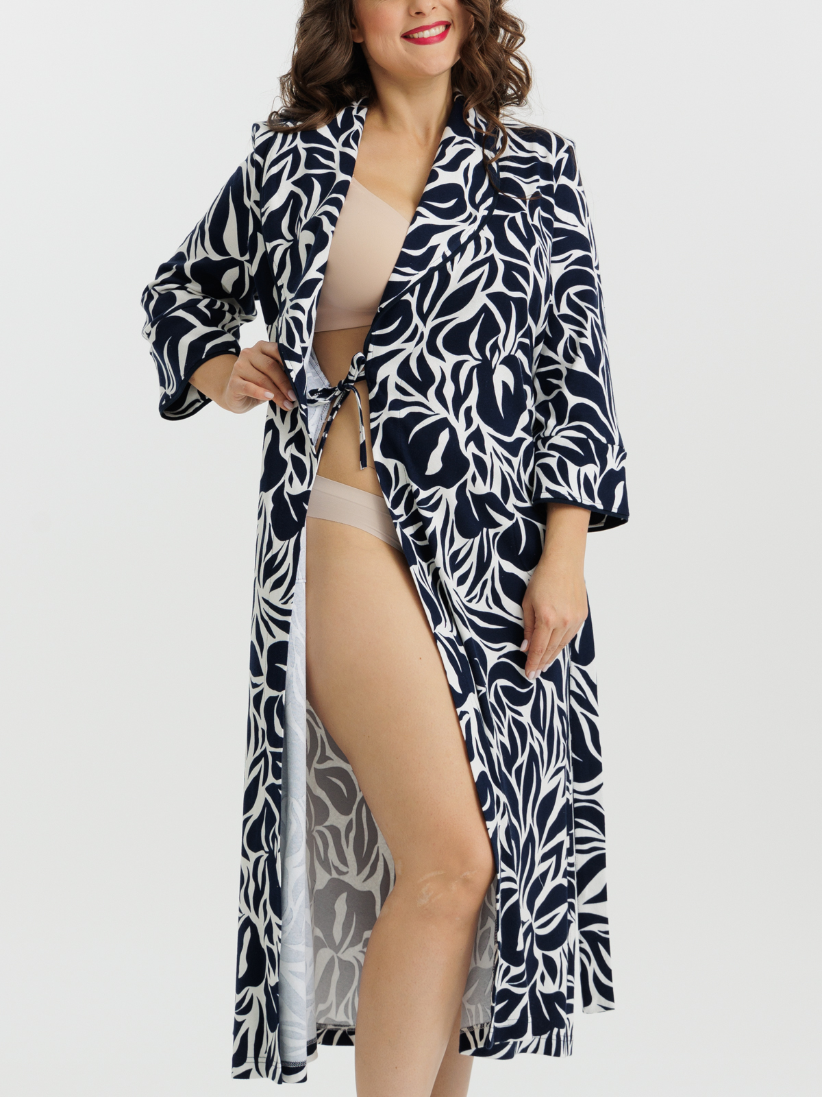 Стильный и уютный халат с карманами, боковыми разрезами и рукавом 3/4. Модель прямого силуэта на запахе, талию подчеркивает съемный пояс. Воротник и манжеты рукавов отдекорированы контрастным кантом. Утонченный дизайн в сочетании с оригинальным цветовым решением создают изумительный образ.