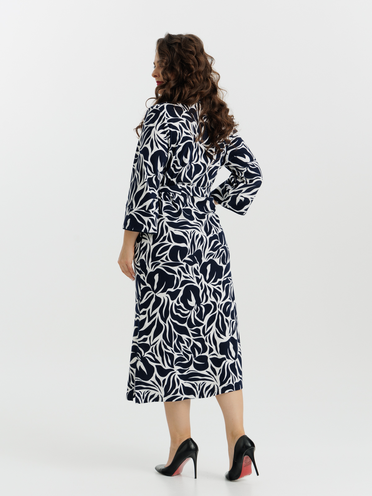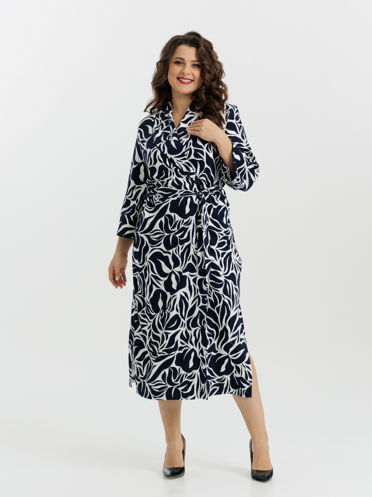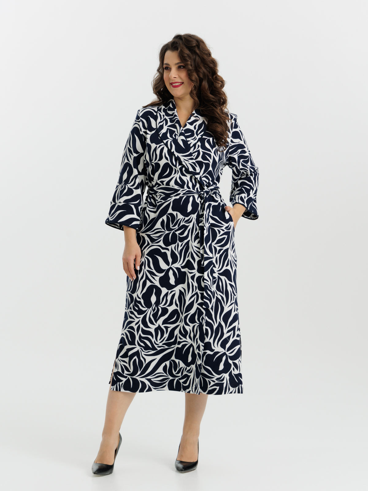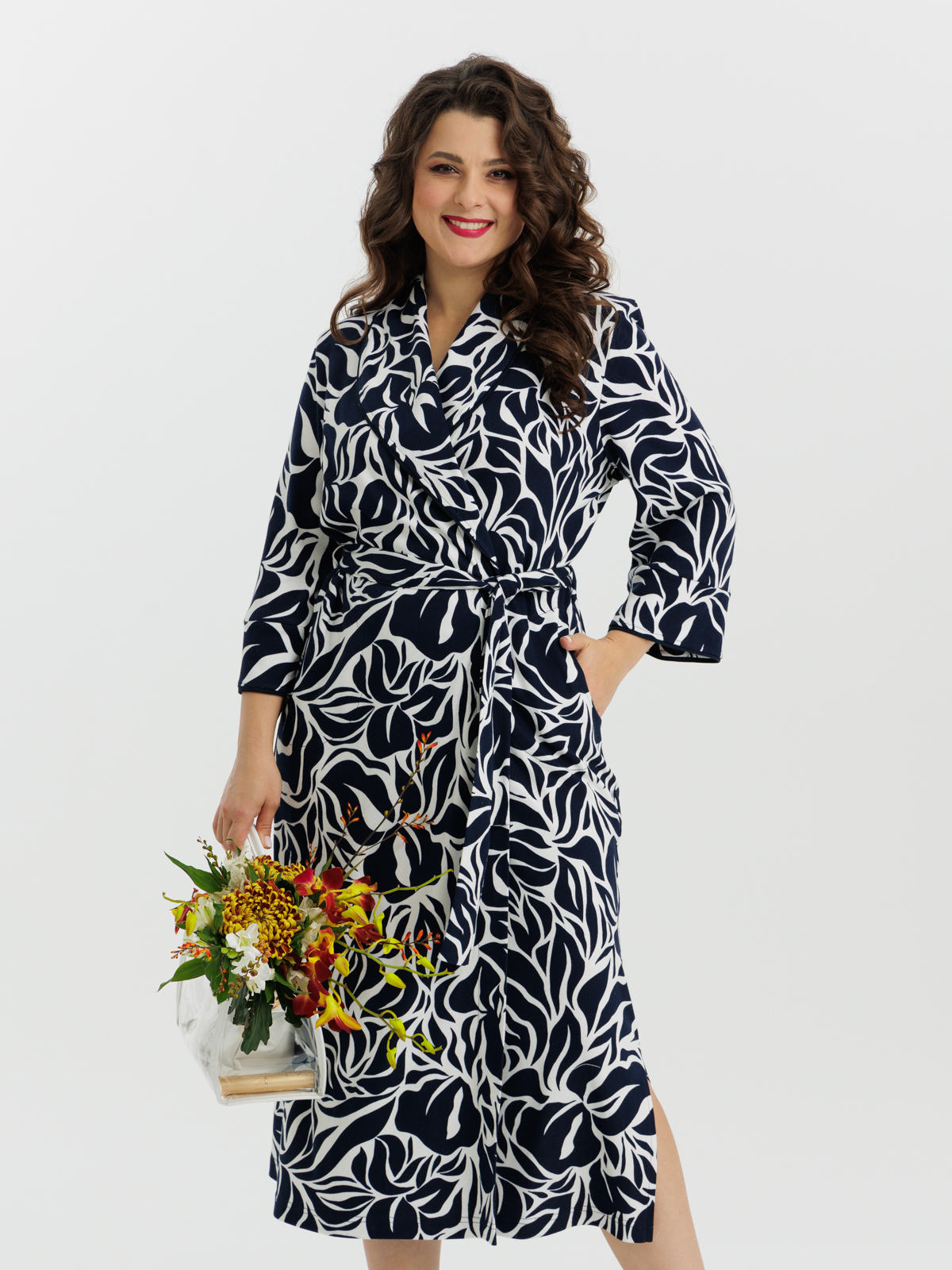 Стильный и уютный халат с карманами, боковыми разрезами и рукавом 3/4. Модель прямого силуэта на запахе, талию подчеркивает съемный пояс. Воротник и манжеты рукавов отдекорированы контрастным кантом. Утонченный дизайн в сочетании с оригинальным цветовым решением создают изумительный образ.