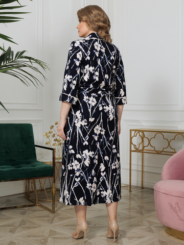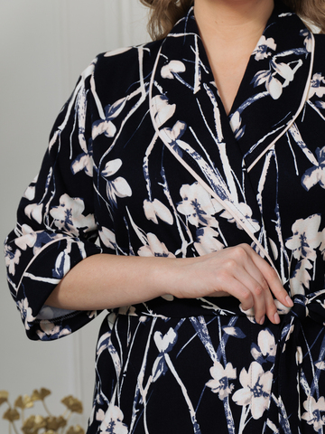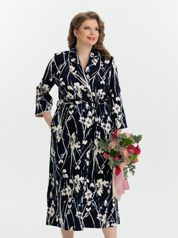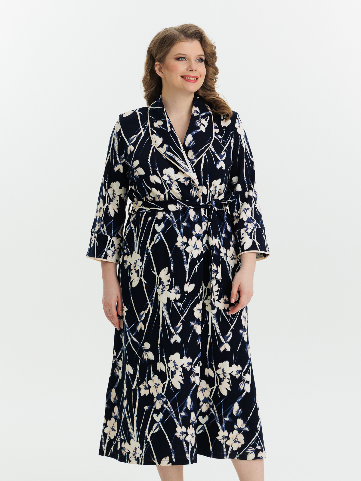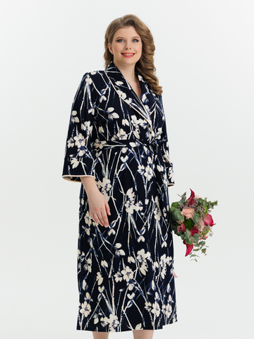 Стильный и уютный халат с карманами, боковыми разрезами и рукавом 3/4. Модель прямого силуэта на запахе, талию подчеркивает съемный пояс. Воротник и манжеты рукавов отдекорированы контрастным кантом. Утонченный дизайн в сочетании с оригинальным цветовым решением создают изумительный образ.