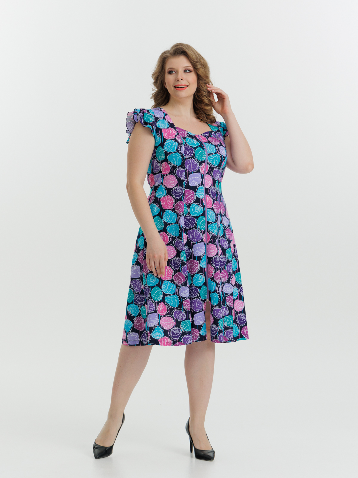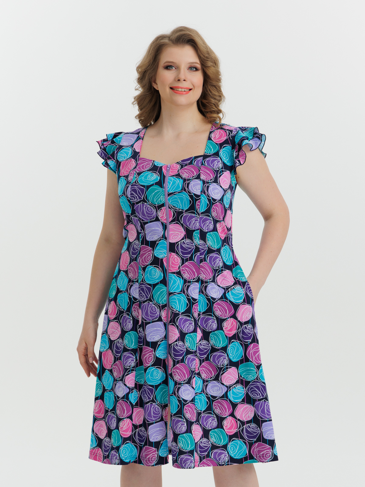 Стильный и комфортный халат. Модель на молнии с боковыми карманами и коротким рукавом, имеется декоративная отделка в виде двойного крыла на рукавах, а пояс в боковых швах аккуратно подчеркивает талию. Утонченный и современный дизайн с изящным приталенным силуэтом создает изумительный и молодежный образ.
