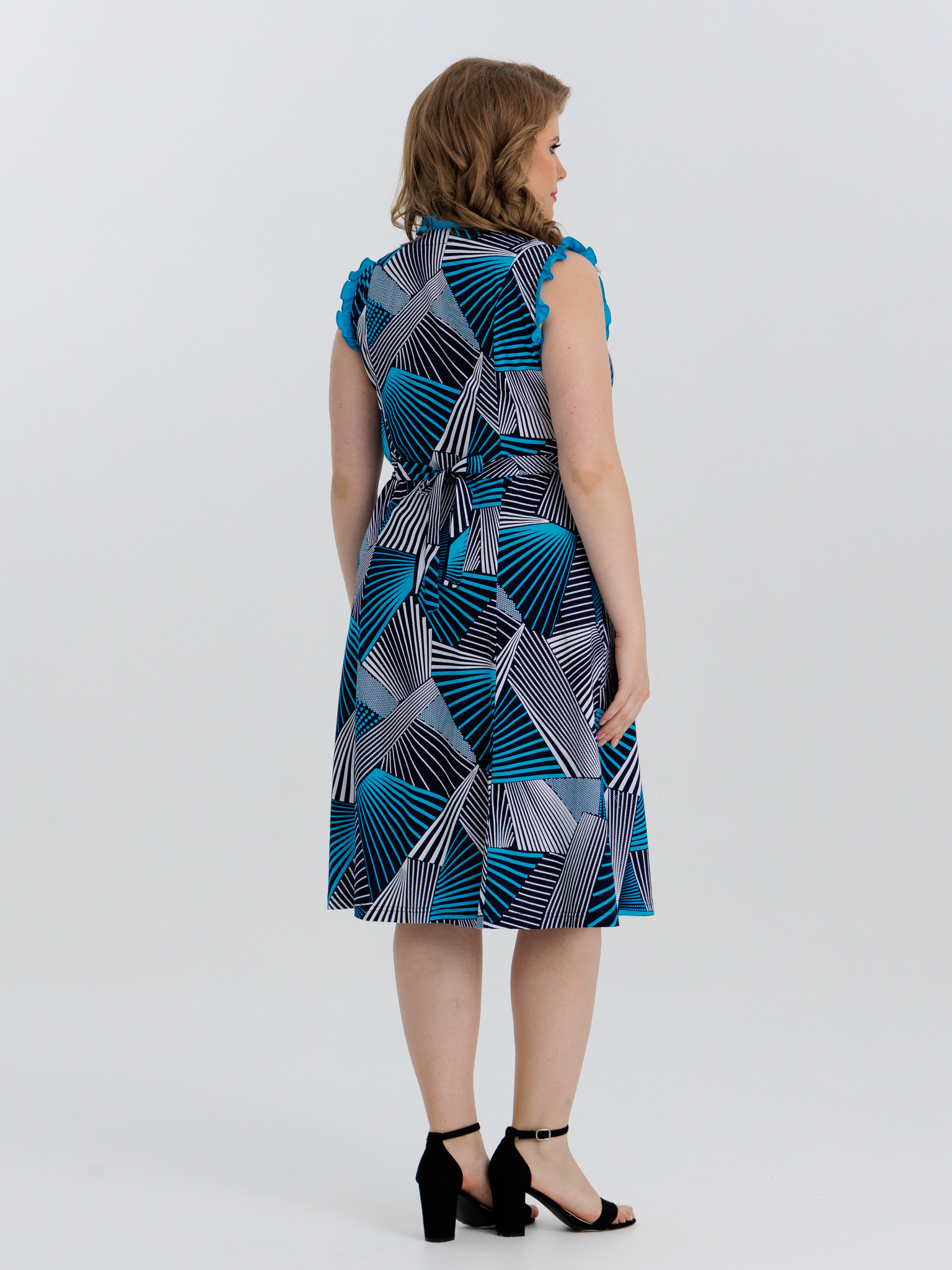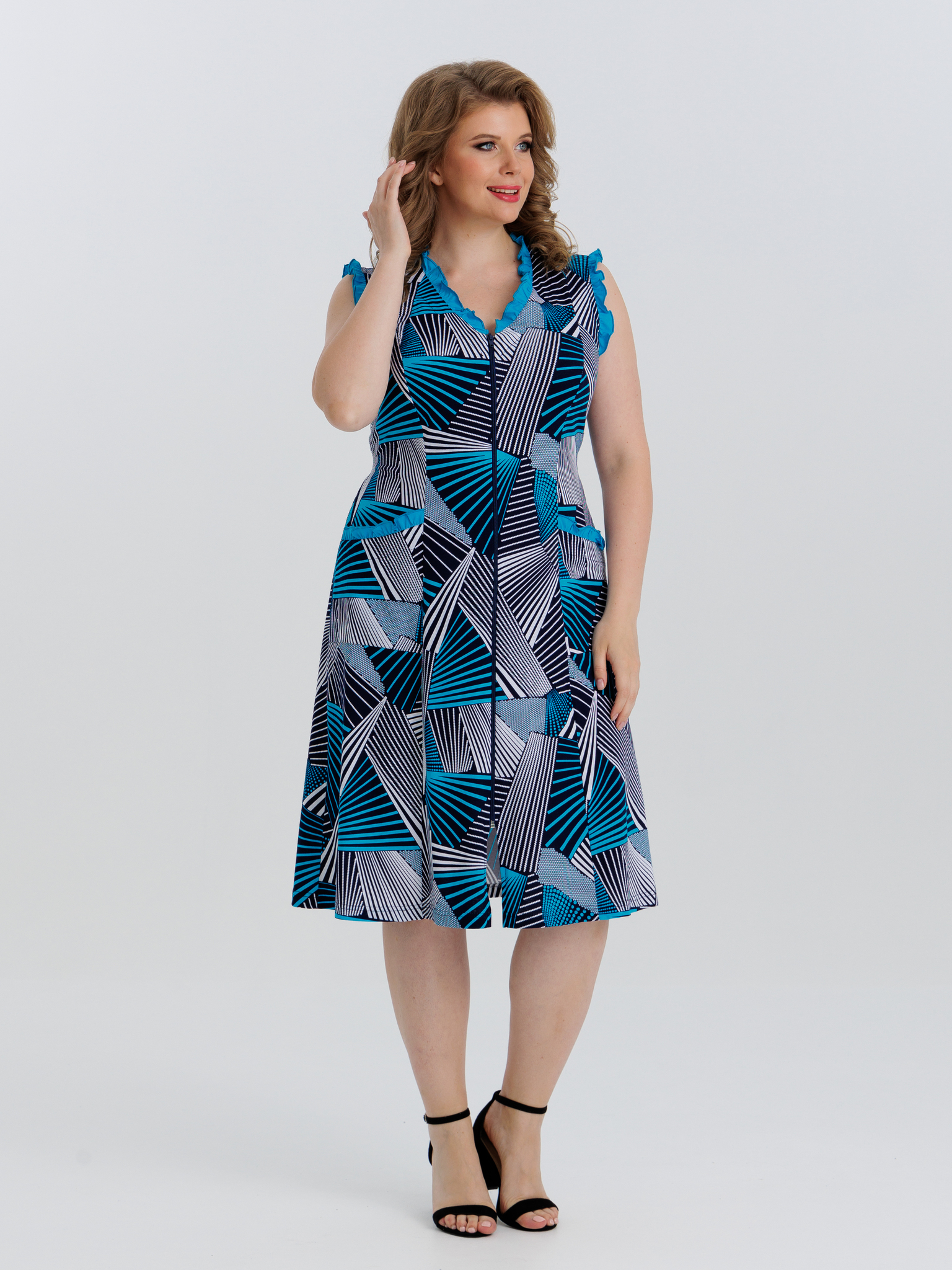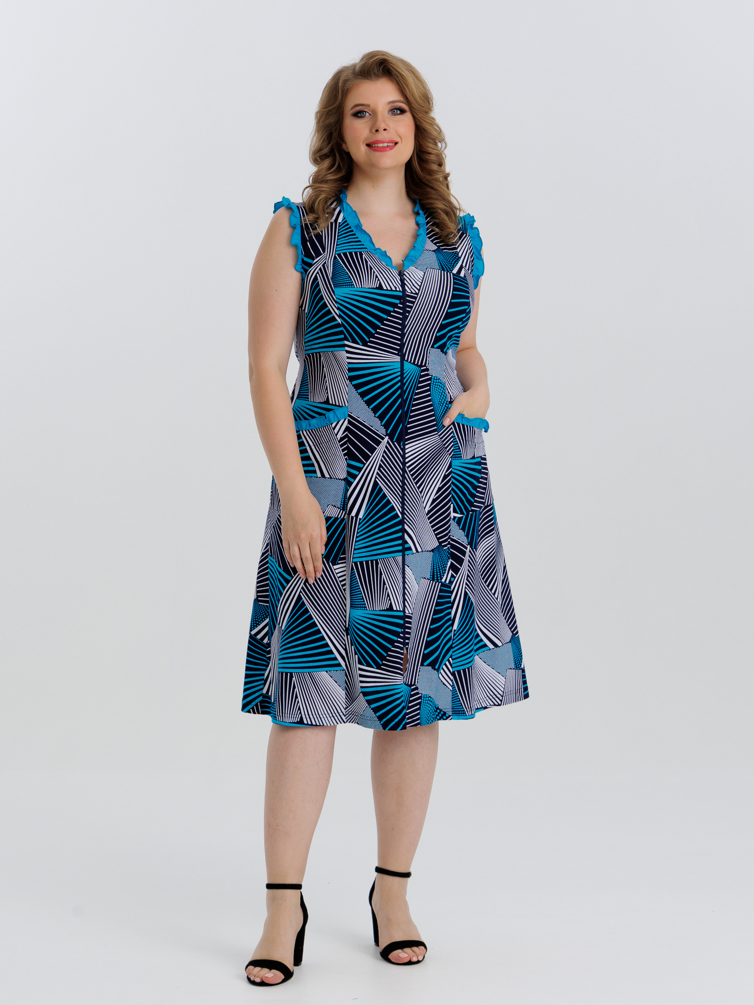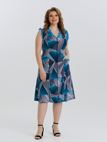 Стильный сарафан на молнии отлично подойдет как для дома, так и отдыха. Яркие цвета и декоративная отделка по V-образной горловине, пройме и карманам придают изделию изысканный вид, а пояс в боковых швах аккуратно подчеркивает талию.