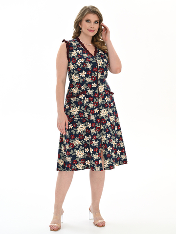 Стильный сарафан на молнии отлично подойдет как для дома, так и отдыха. Яркие цвета и декоративная отделка по V-образной горловине, пройме и карманам придают изделию изысканный вид, а пояс в боковых швах аккуратно подчеркивает талию.