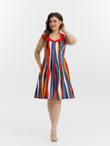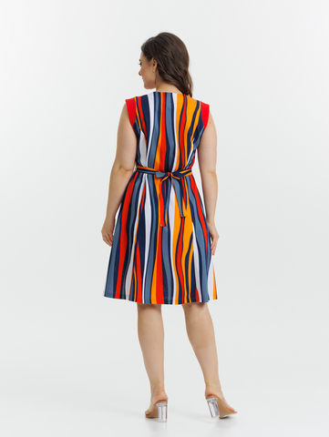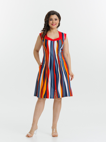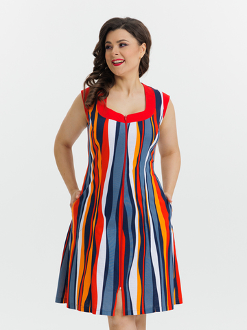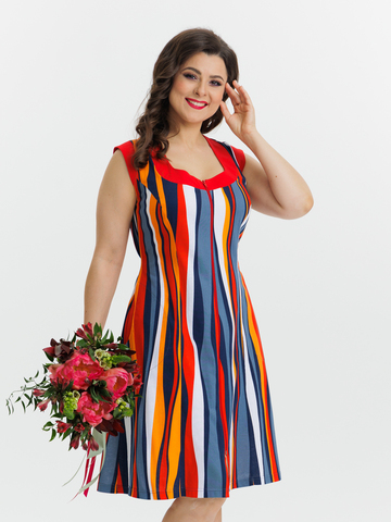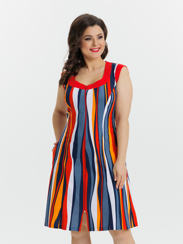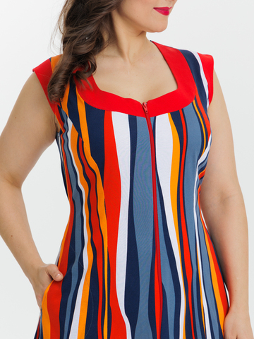 Стильный сарафан на молнии отлично подойдет как для дома, так и отдыха. Яркие цвета и декоративная отделка по горловине и плечам придают изделию изысканный вид, а пояс в боковых швах аккуратно подчеркивает талию.