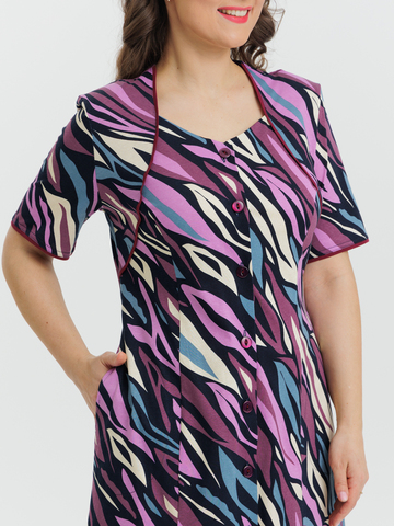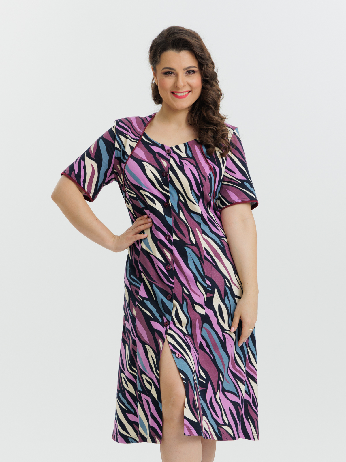 Стильный халат на пуговицах с карманами. Яркие цвета и декоративная отделка придают изделию изысканный вид. Халат отлично подойдет как для дома, отдыха.