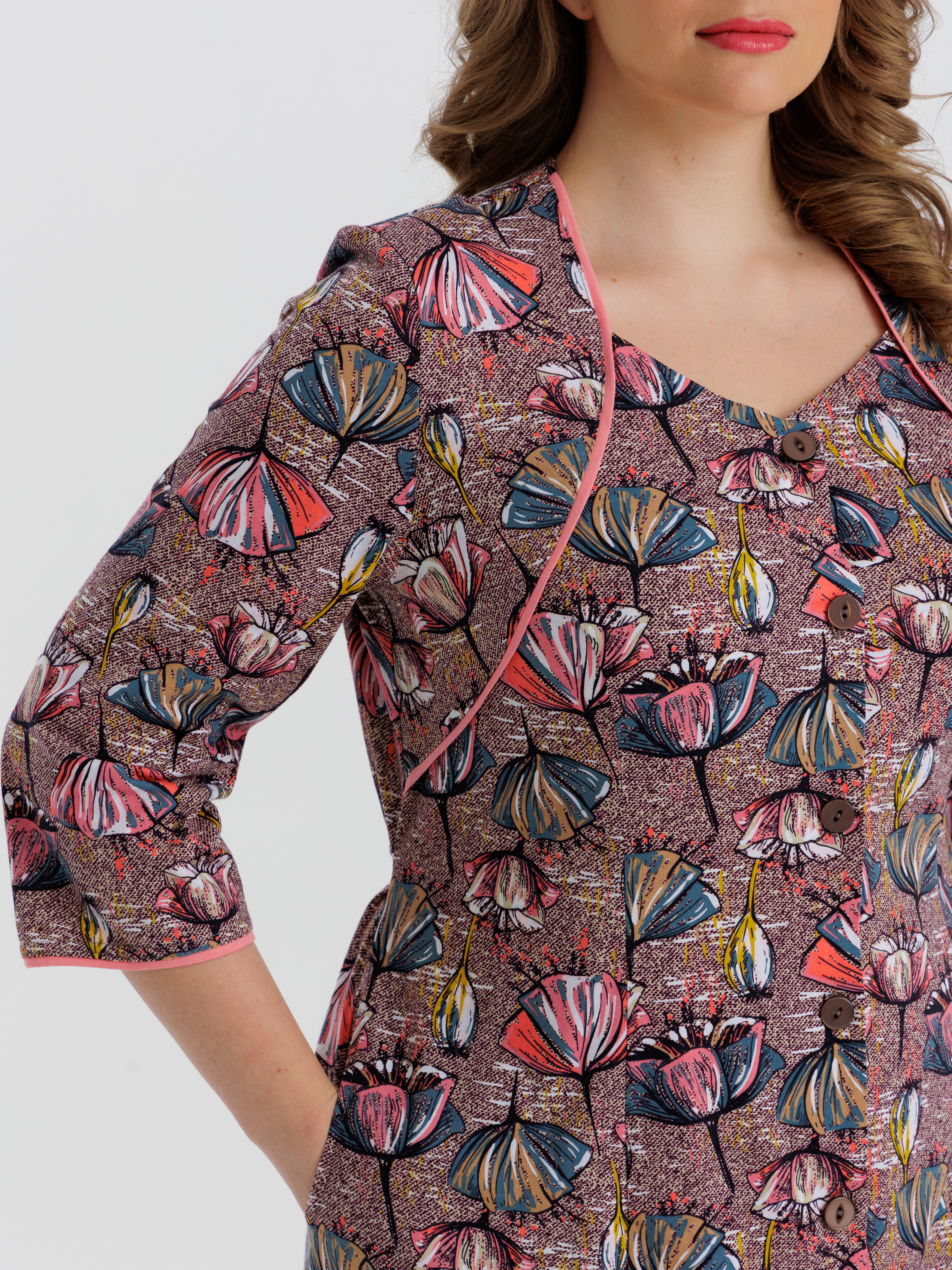 Стильный халат на пуговицах с карманами. Яркие цвета и декоративная отделка придают изделию изысканный вид. Халат отлично подойдет как для дома, отдыха.