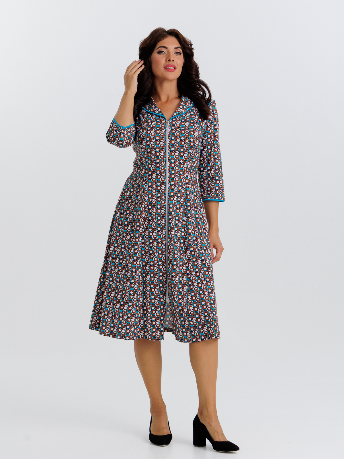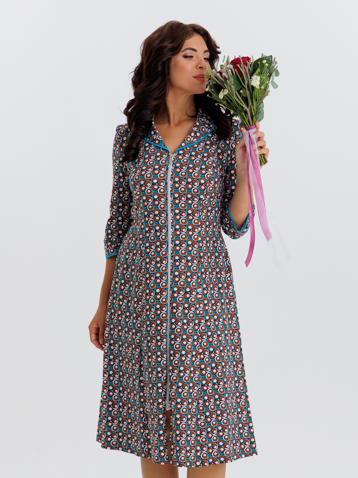 Стильный халат на молнии с карманами, отлично подойдет как для дома, так и отдыха. Яркие цвета и кант по воротнику, рукавам 3/4 придают изделию изысканный вид, а пояс в боковых швах аккуратно подчеркивает талию.
