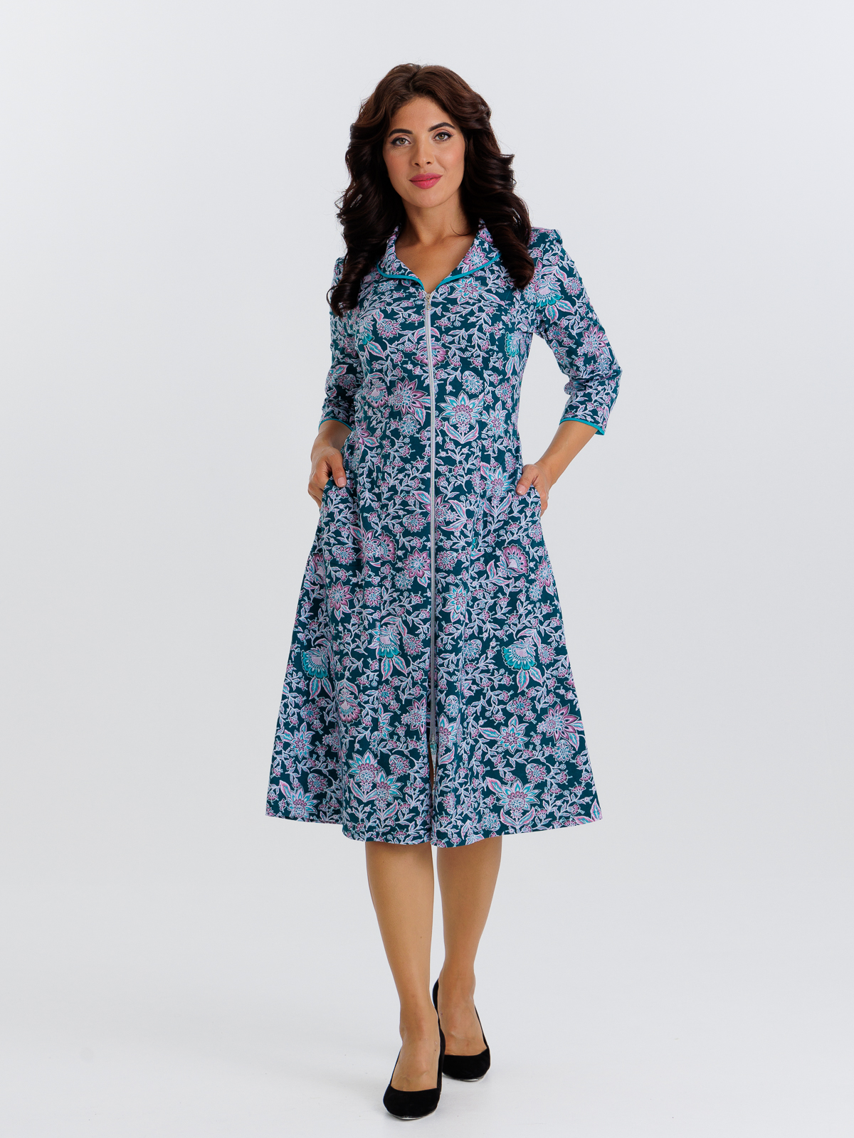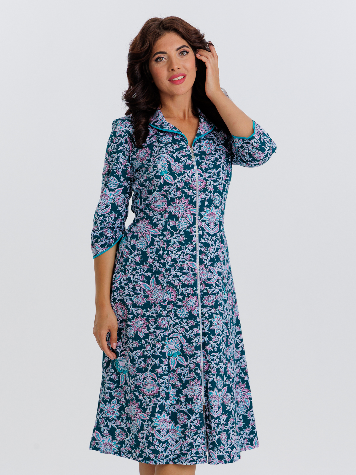 Стильный халат на молнии с карманами, отлично подойдет как для дома, так и отдыха. Яркие цвета и кант по воротнику, рукавам 3/4 придают изделию изысканный вид, а пояс в боковых швах аккуратно подчеркивает талию.