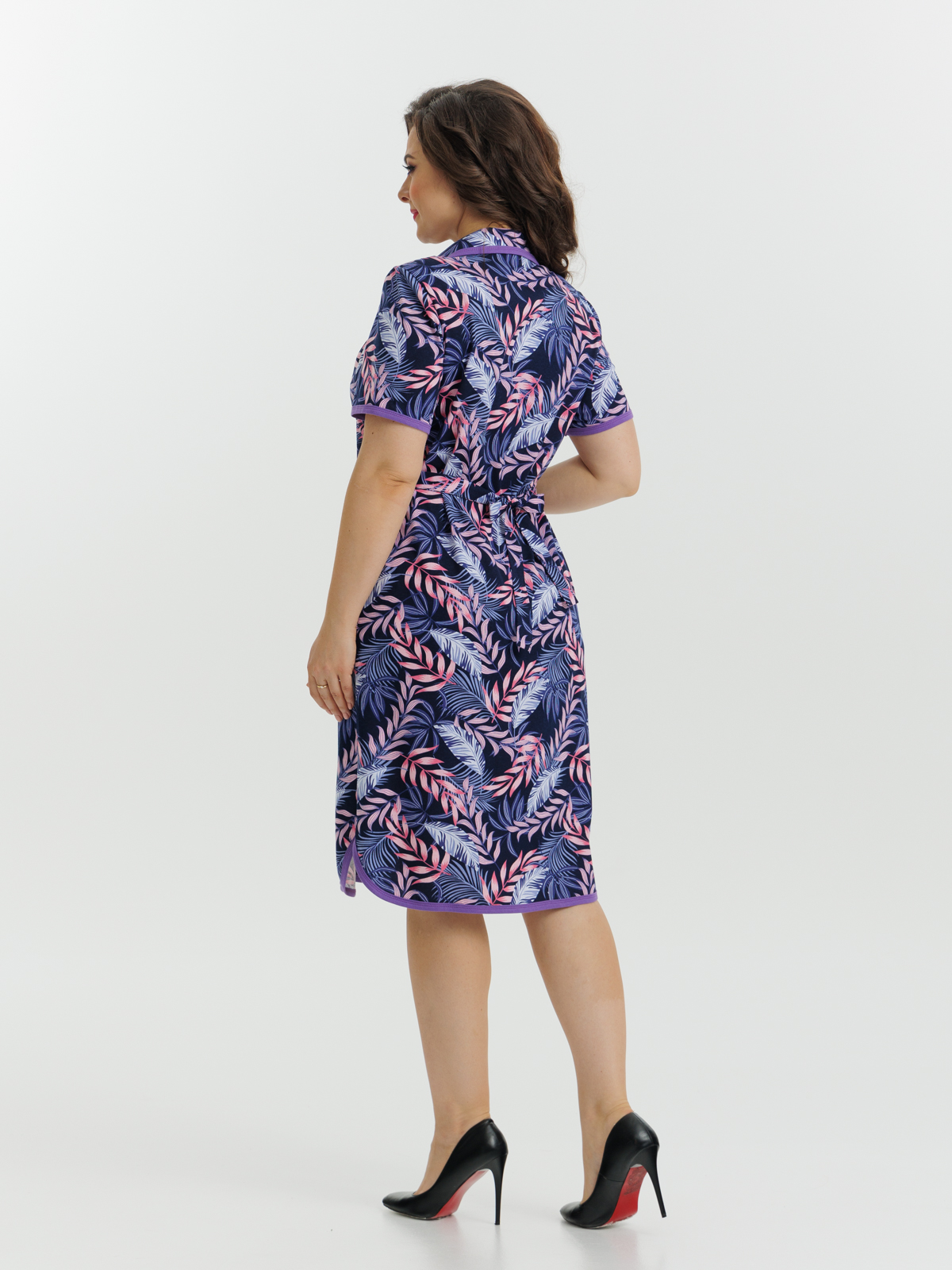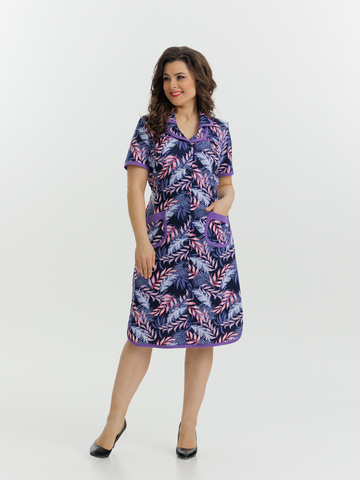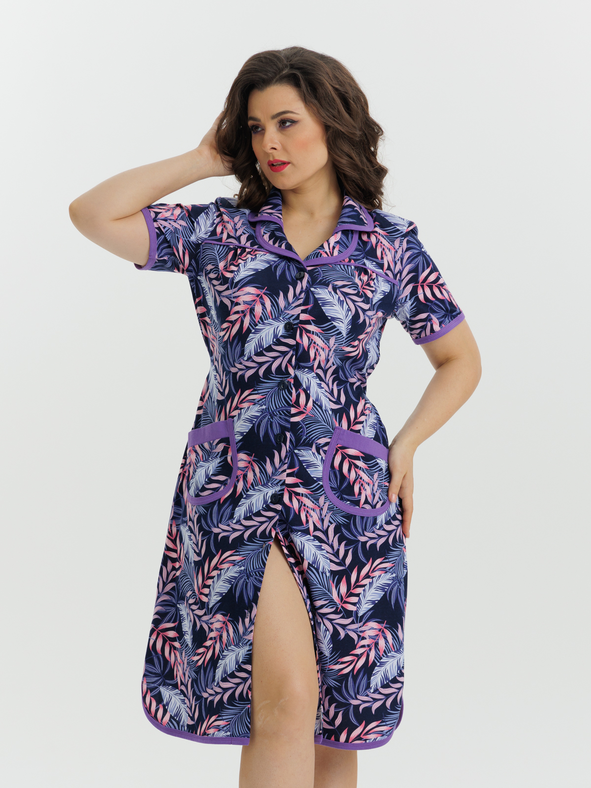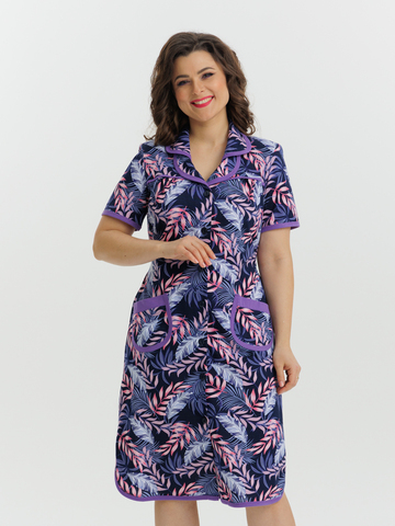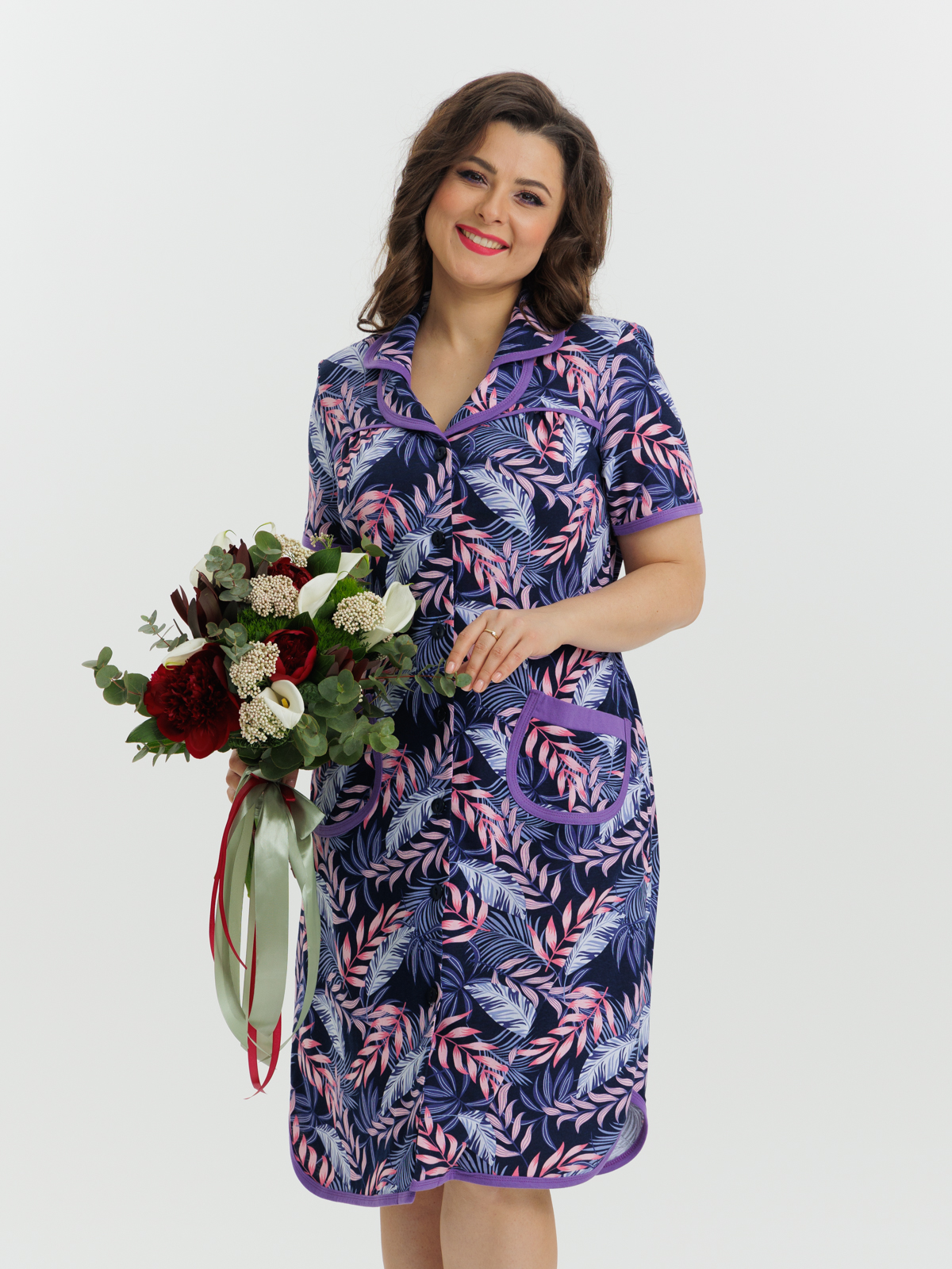 Стильный и комфортный халат прямого силуэта на пуговицах. Двойной воротник, короткие рукава, карманы, боковые разрезы и низ изделия отдекорированы бейкой. Пояс в боковых швах элегантно подчеркивает талию и создает изумительный образ.