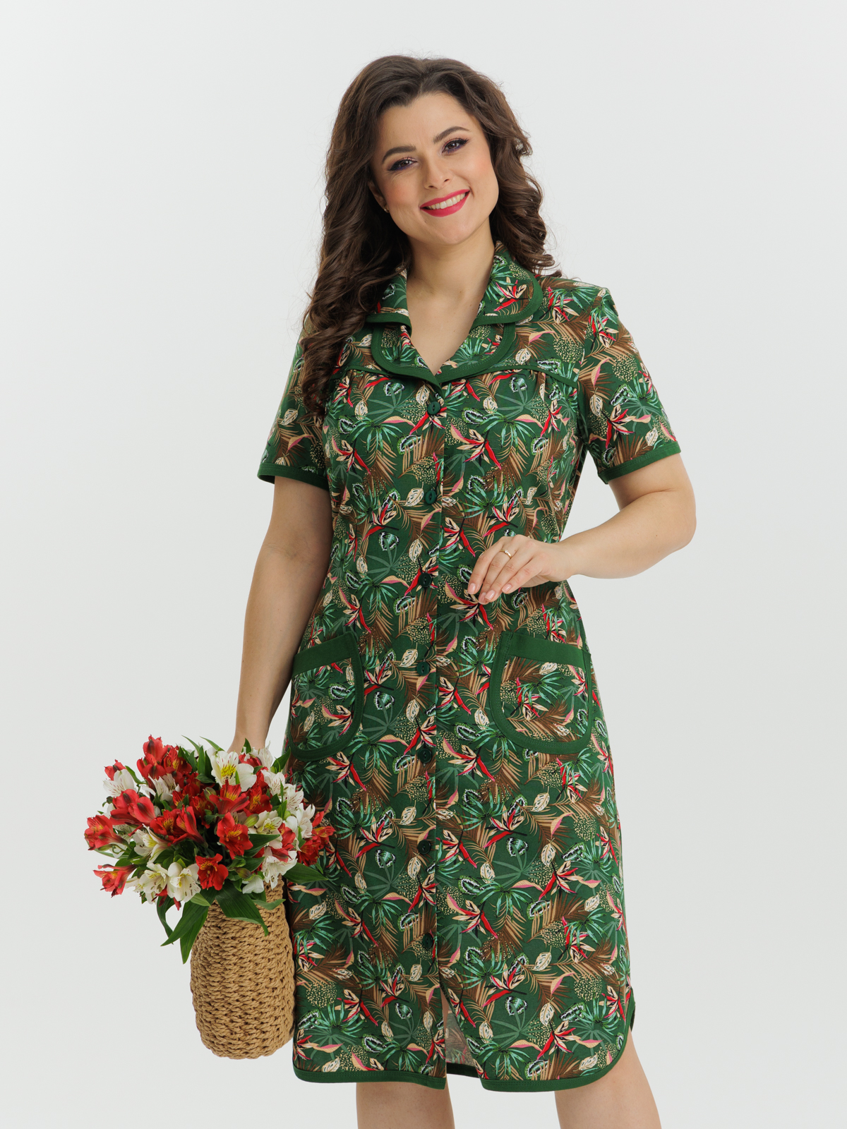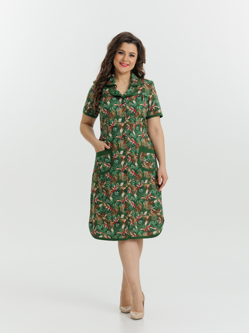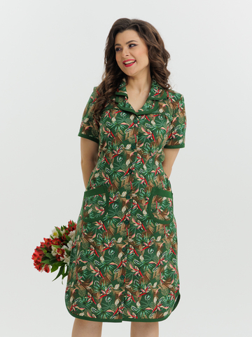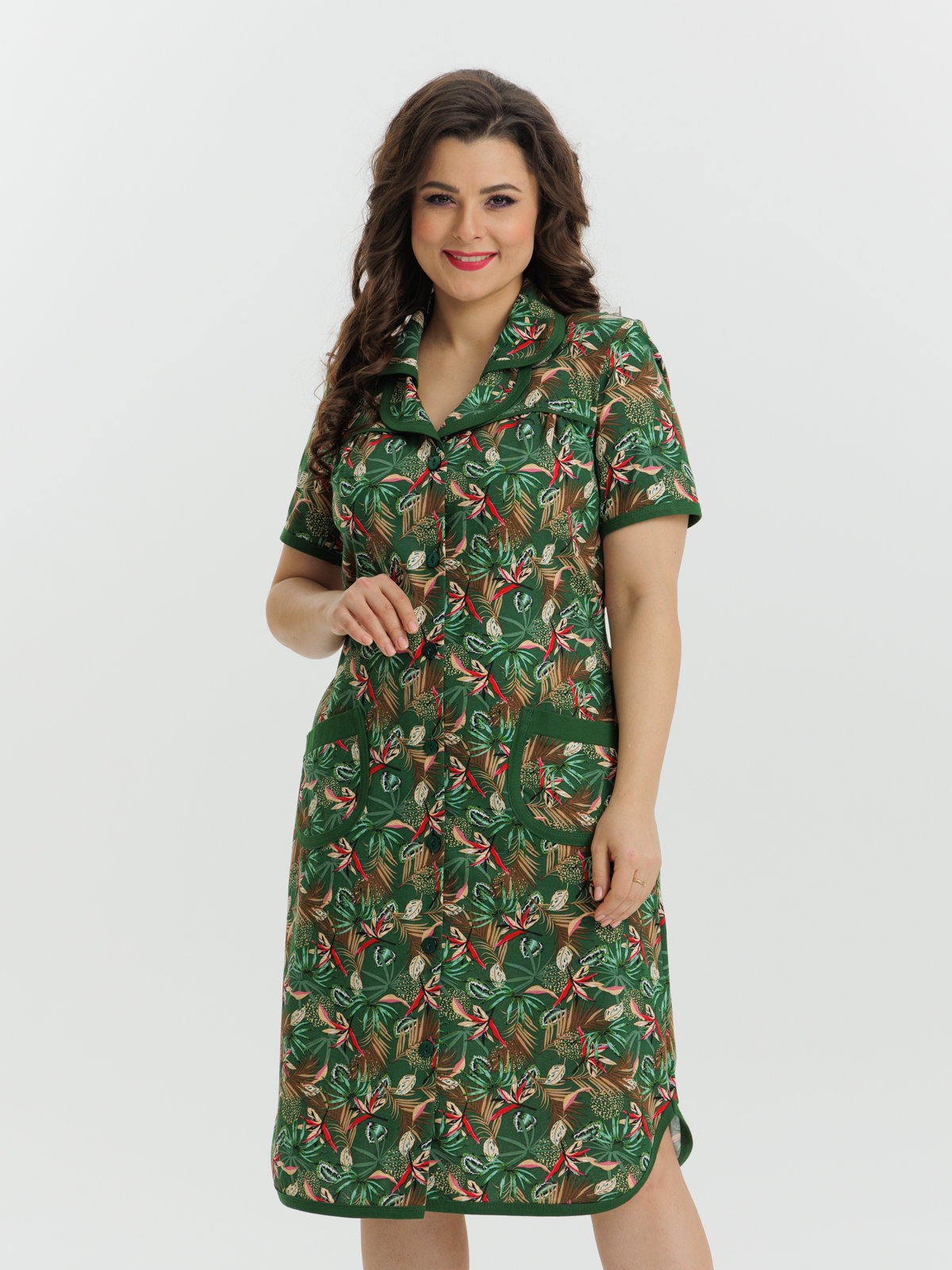 Стильный и комфортный халат прямого силуэта на пуговицах. Двойной воротник, короткие рукава, карманы, боковые разрезы и низ изделия отдекорированы бейкой. Пояс в боковых швах элегантно подчеркивает талию и создает изумительный образ.