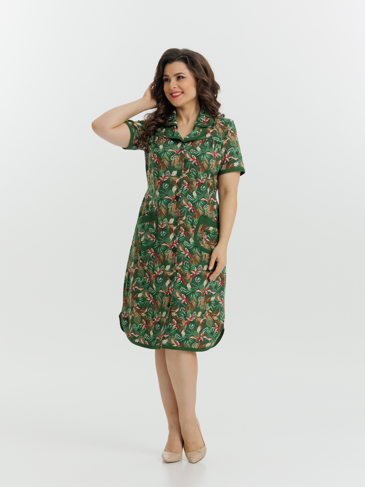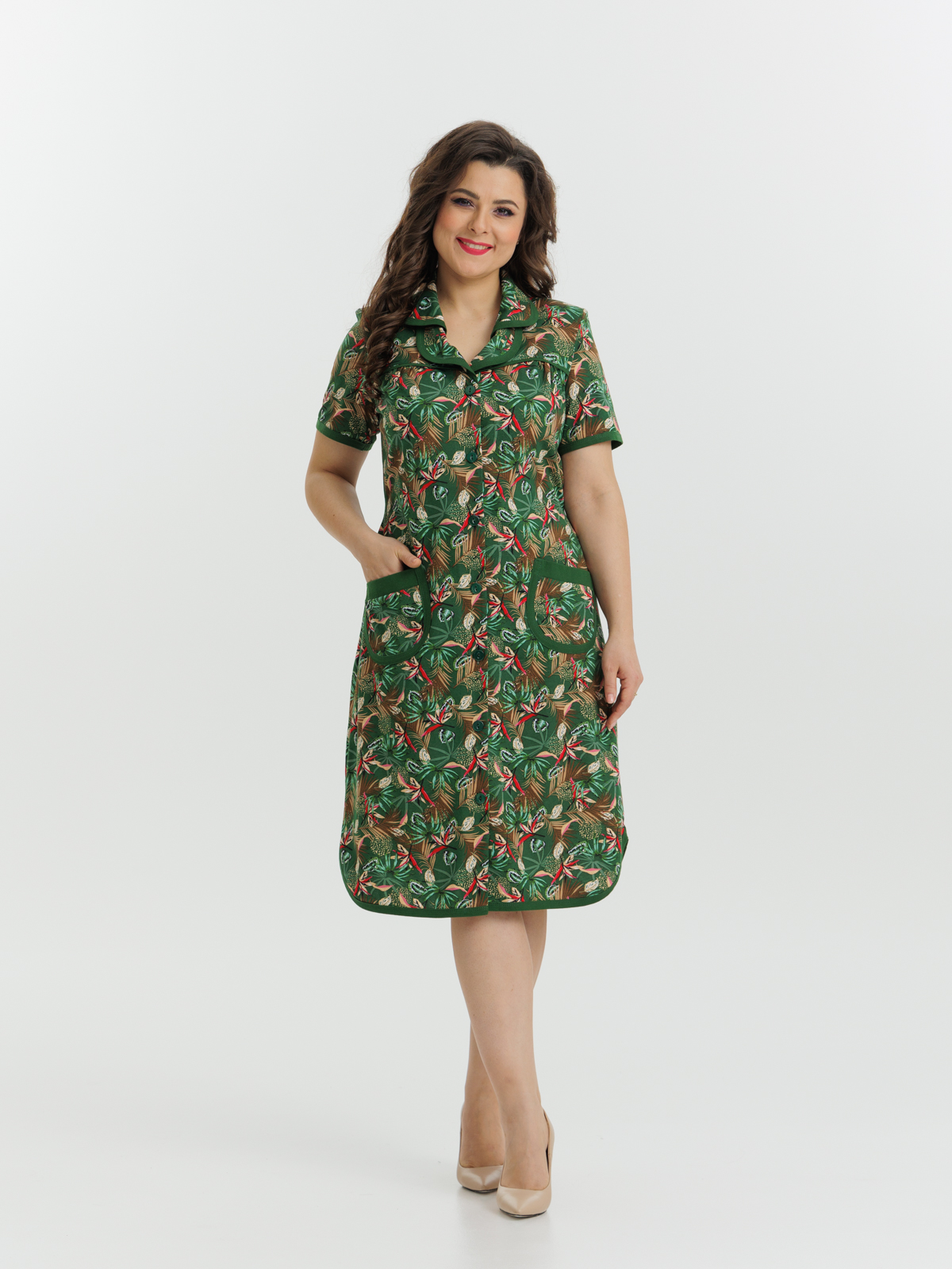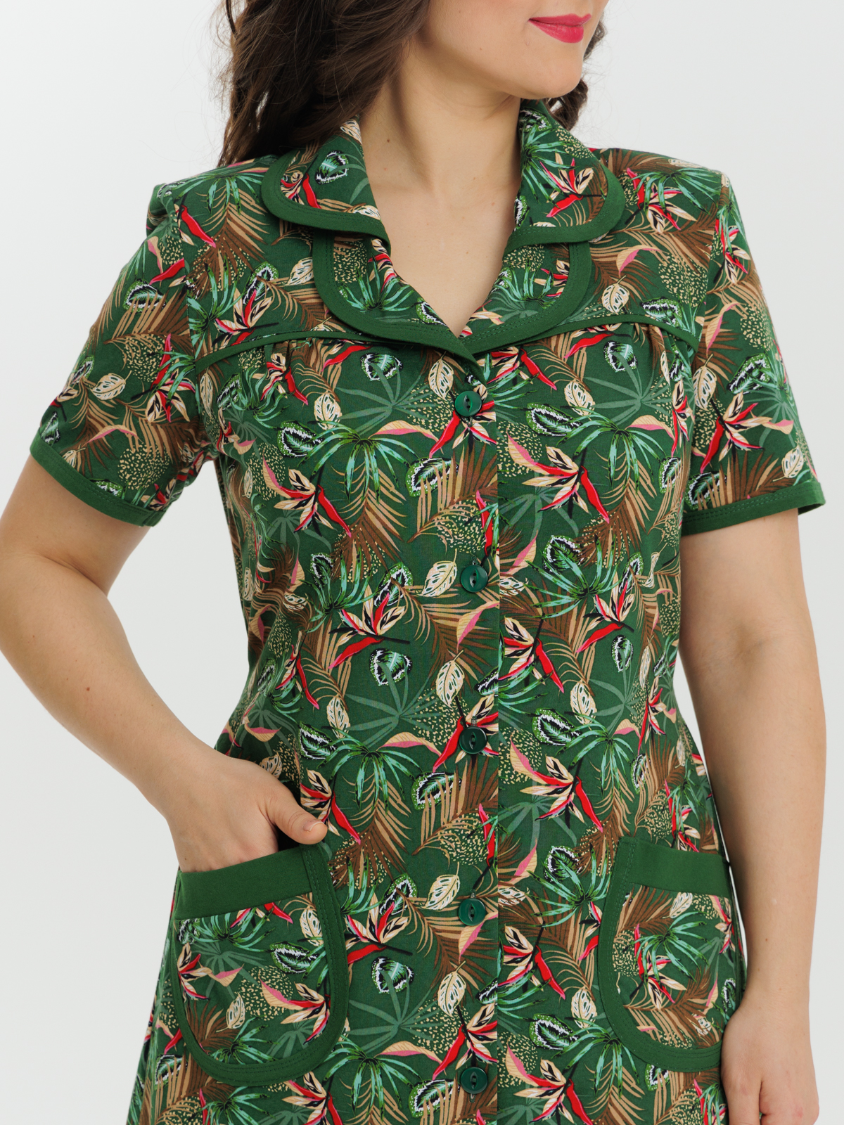 Стильный и комфортный халат прямого силуэта на пуговицах. Двойной воротник, короткие рукава, карманы, боковые разрезы и низ изделия отдекорированы бейкой. Пояс в боковых швах элегантно подчеркивает талию и создает изумительный образ.