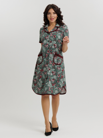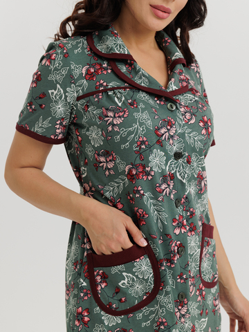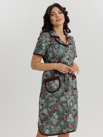 Стильный и комфортный халат прямого силуэта на пуговицах. Двойной воротник, короткие рукава, карманы, боковые разрезы и низ изделия отдекорированы бейкой. Пояс в боковых швах элегантно подчеркивает талию и создает изумительный образ.
