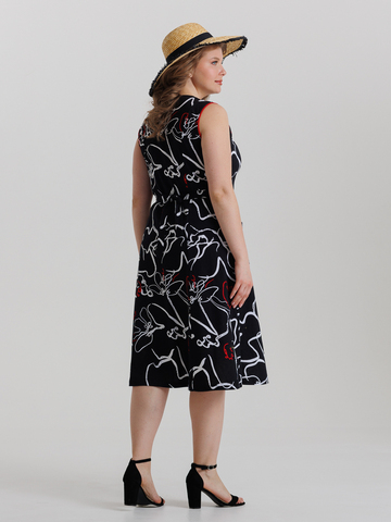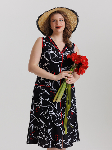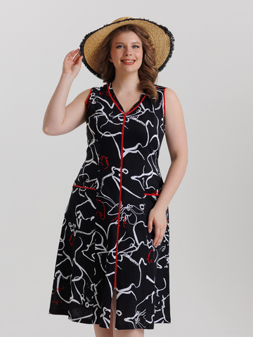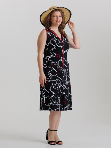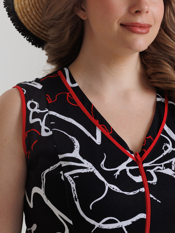 Стильный сарафан на молнии отлично подойдет как для дома, так и отдыха. Яркие цвета и декоративная отделка по V-образной горловине, пройме и карманам придают изделию изысканный вид, а пояс в боковых швах аккуратно подчеркивает талию.
