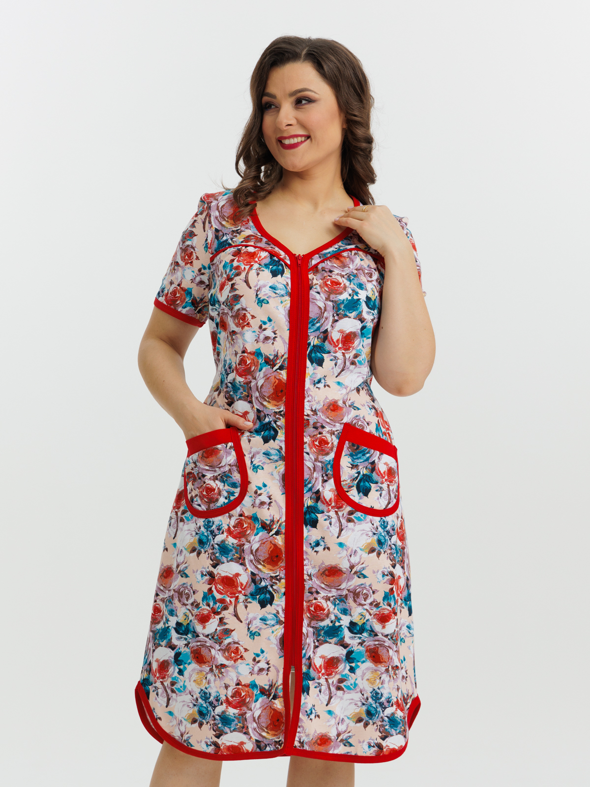 Стильный и яркий халат на молнии, карманами, коротким рукавом и длиной ниже колена, что придает свободу движению. Модель прямого силуэта, полукруглые разрезы по бокам придают изделию изысканный и неотразимый вид, а пояс в боковых швах аккуратно подчеркивает талию. Выполнен из натурального материала хлопка, что создает комфорт в любой день.