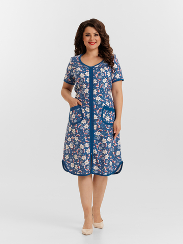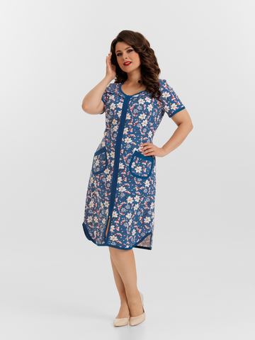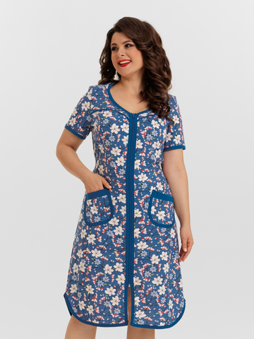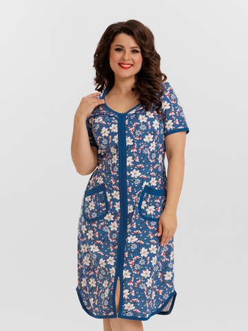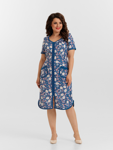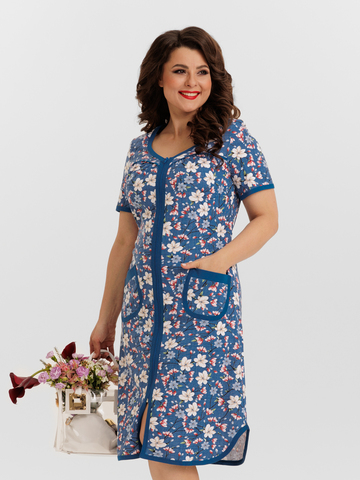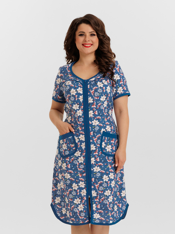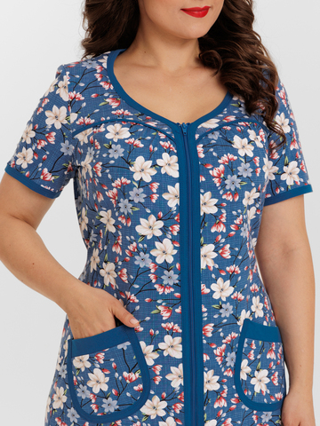 Стильный и яркий халат на молнии, карманами, коротким рукавом и длиной ниже колена, что придает свободу движению. Модель прямого силуэта, полукруглые разрезы по бокам придают изделию изысканный и неотразимый вид, а пояс в боковых швах аккуратно подчеркивает талию. Выполнен из натурального материала хлопка, что создает комфорт в любой день.