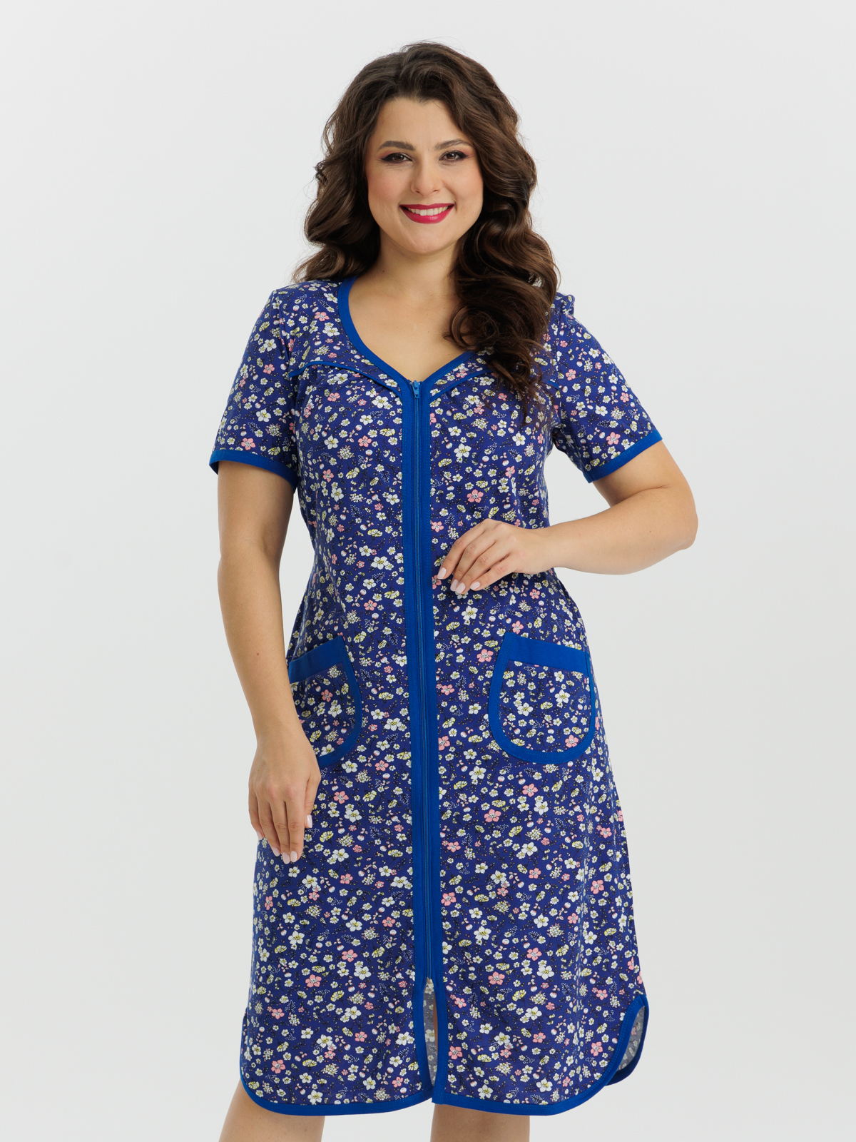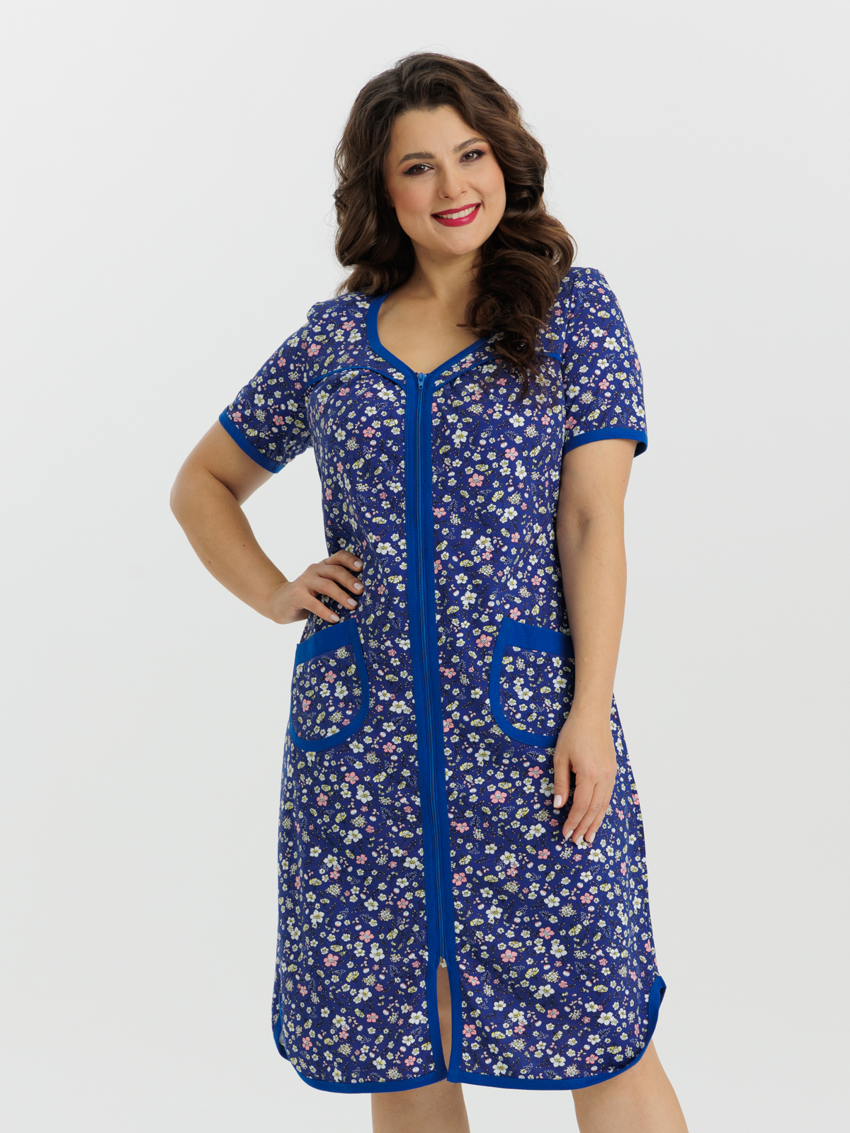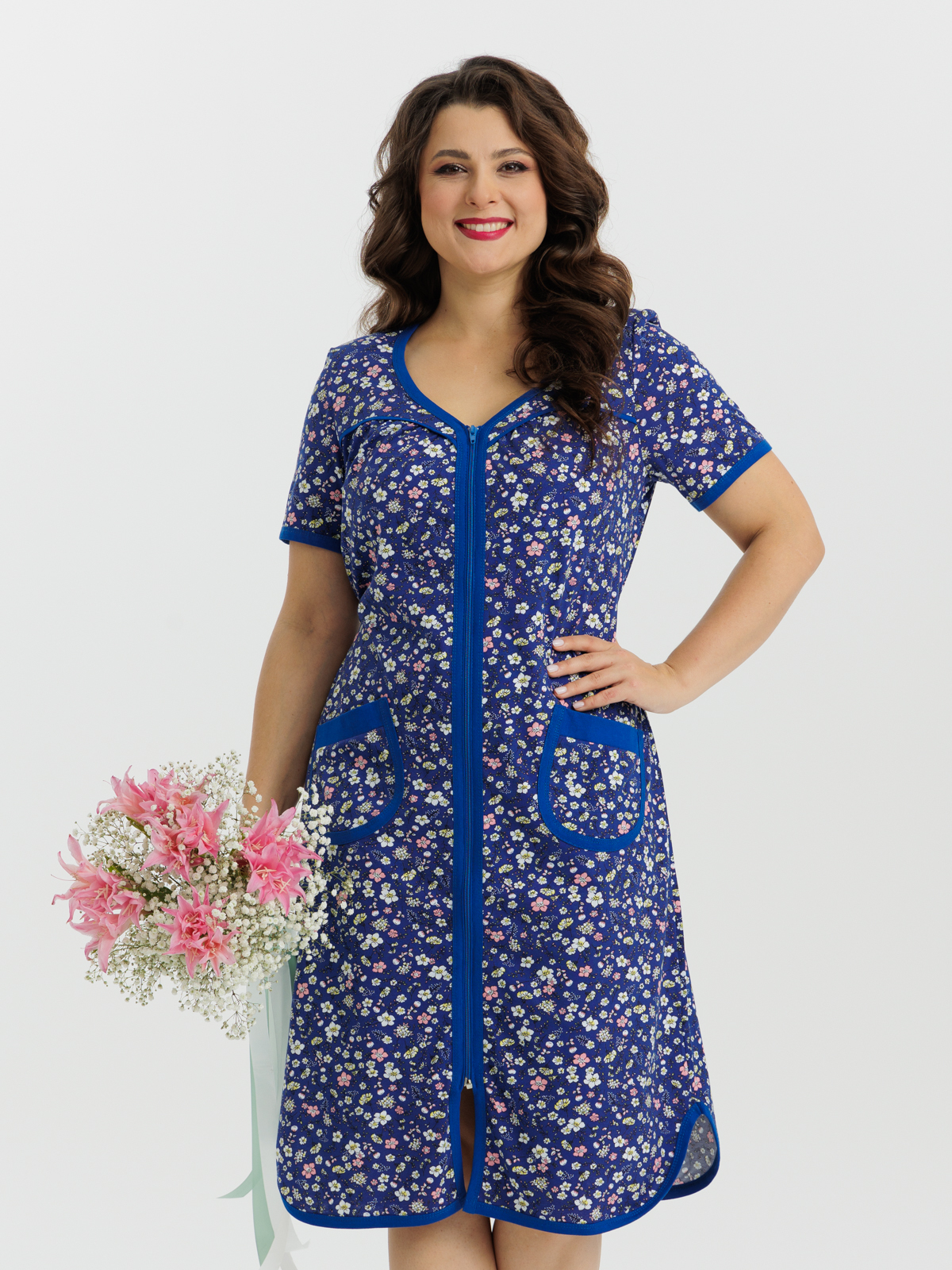 Стильный и яркий халат на молнии, карманами, коротким рукавом и длиной ниже колена, что придает свободу движению. Модель прямого силуэта, полукруглые разрезы по бокам придают изделию изысканный и неотразимый вид, а пояс в боковых швах аккуратно подчеркивает талию. Выполнен из натурального материала хлопка, что создает комфорт в любой день.