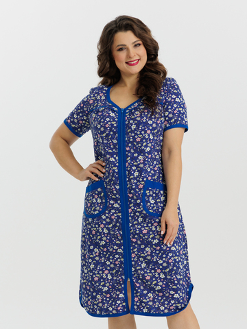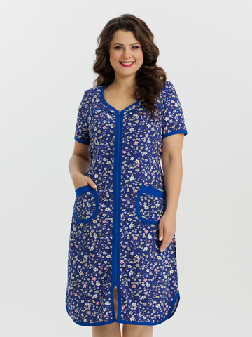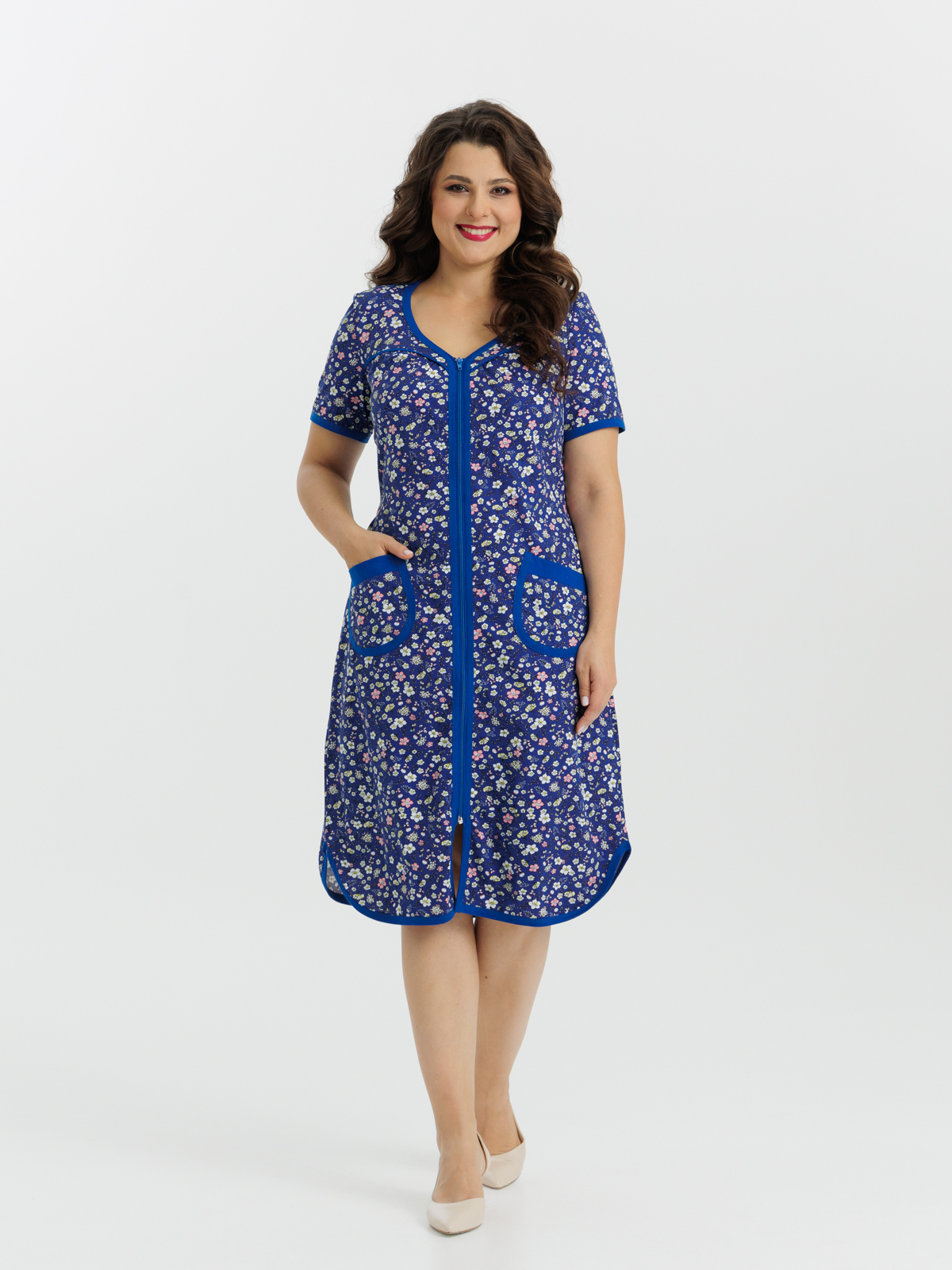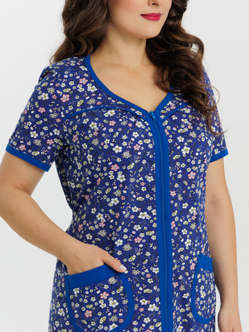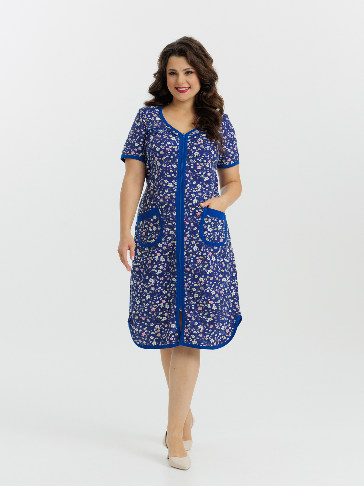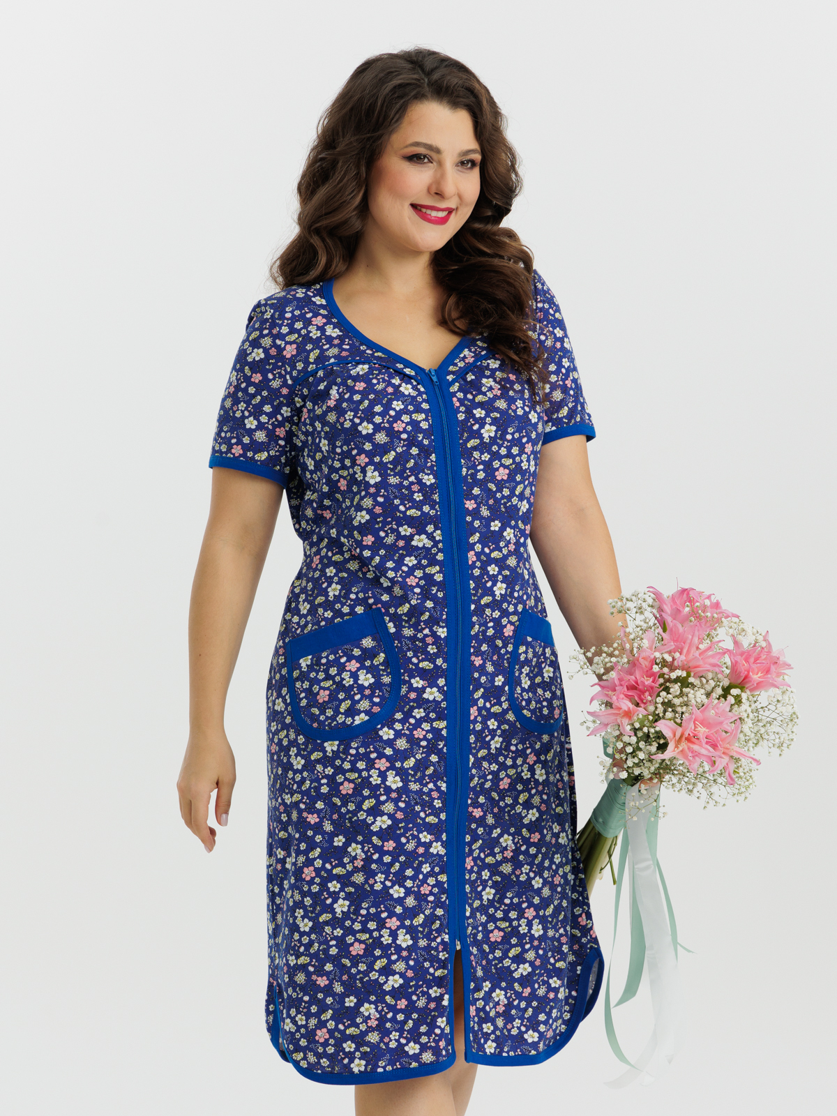 Стильный и яркий халат на молнии, карманами, коротким рукавом и длиной ниже колена, что придает свободу движению. Модель прямого силуэта, полукруглые разрезы по бокам придают изделию изысканный и неотразимый вид, а пояс в боковых швах аккуратно подчеркивает талию. Выполнен из натурального материала хлопка, что создает комфорт в любой день.