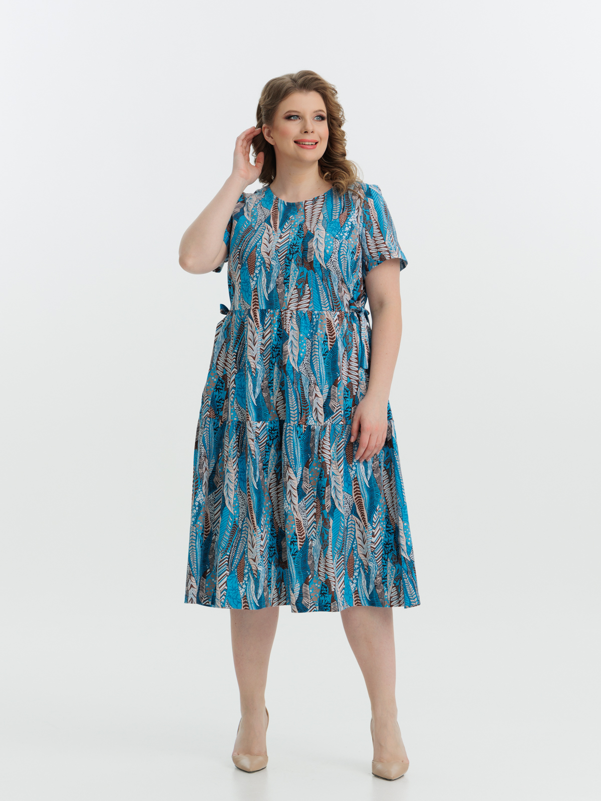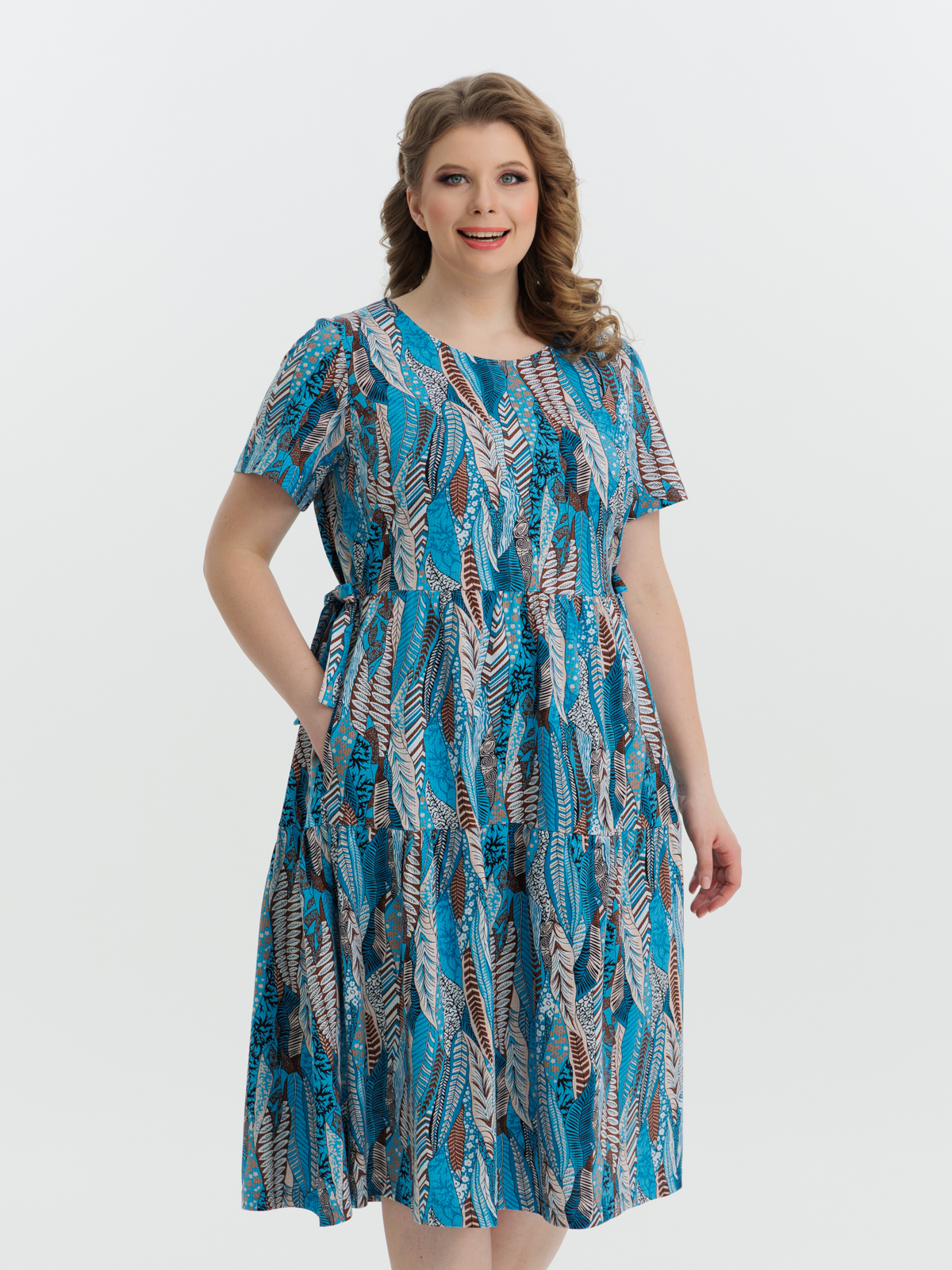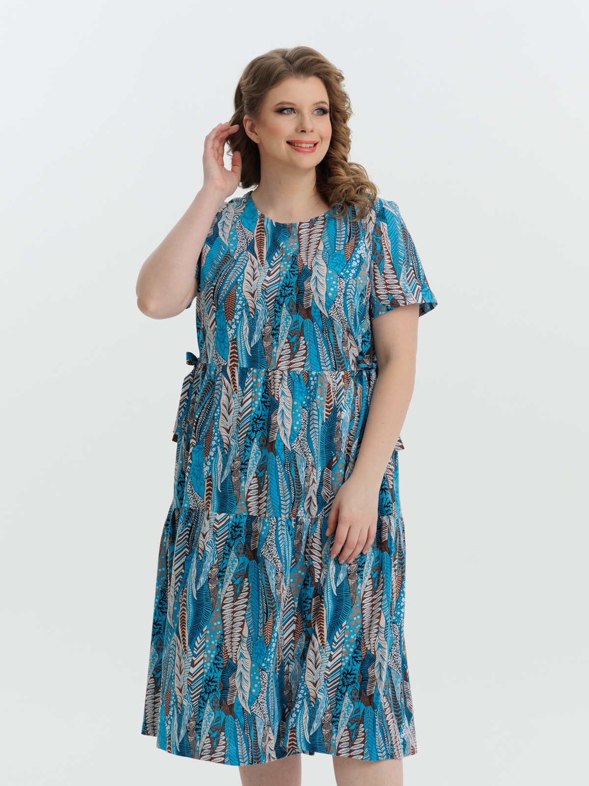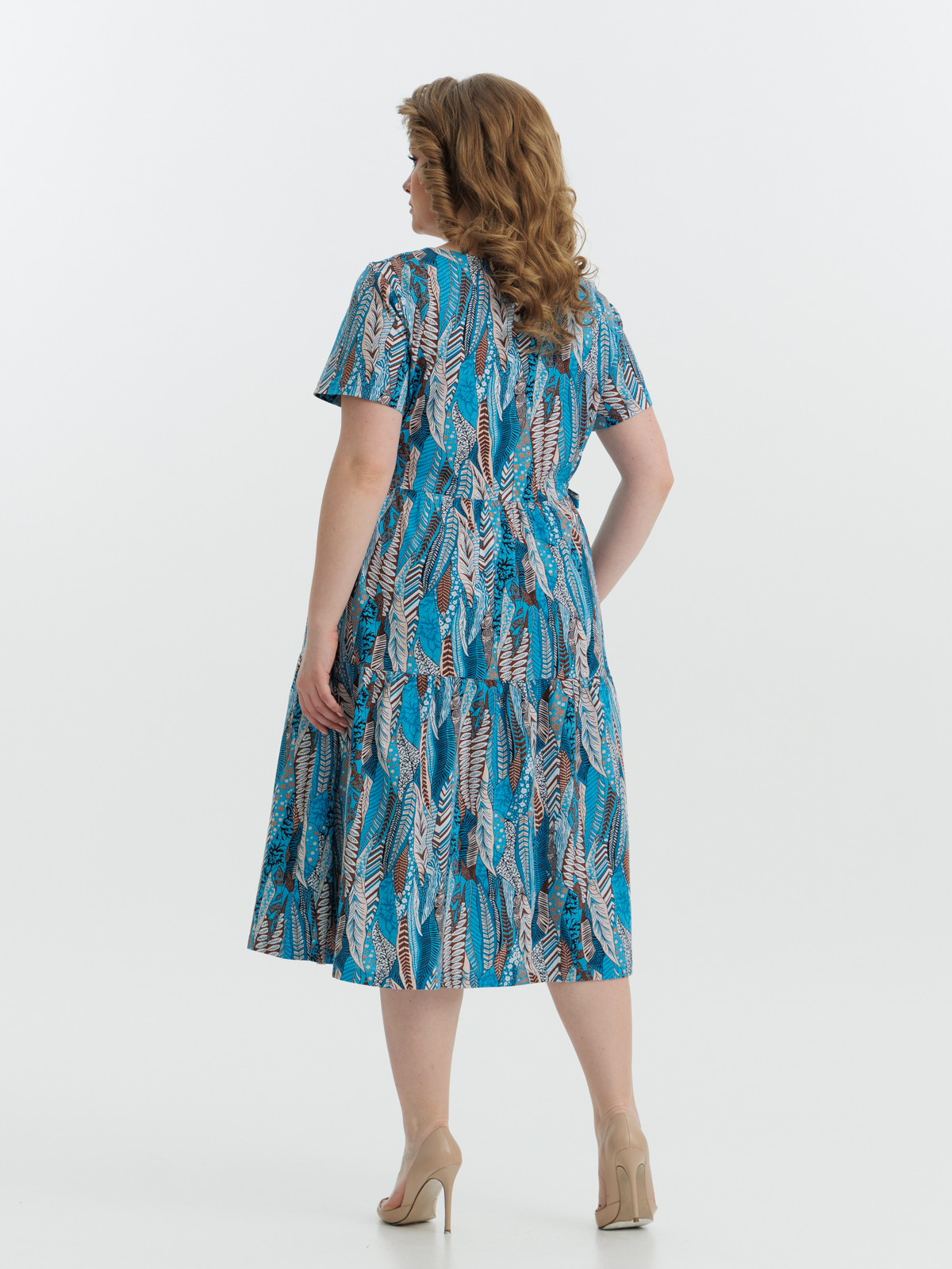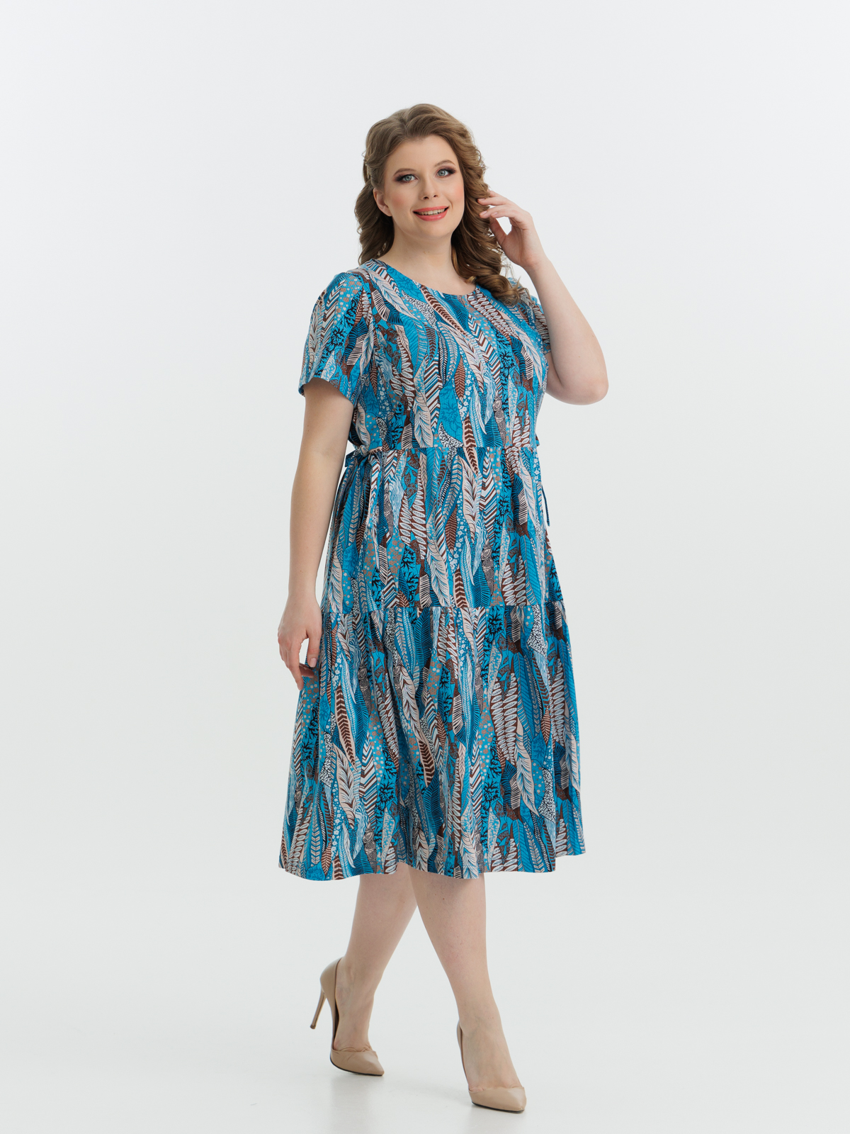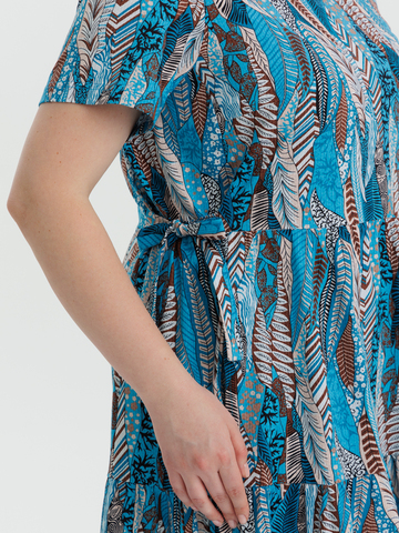 Стильное платье полуприлегающего силуэта, короткий рукав, длиной ниже колен, отрезное по линии завышенной талии. Нижняя часть платья состоит из двух деталей, собирающихся на сборку. Круглый вырез горловины и проймы обработаны тонкой бейкой. Идеальный стильный летний наряд для любого случая.