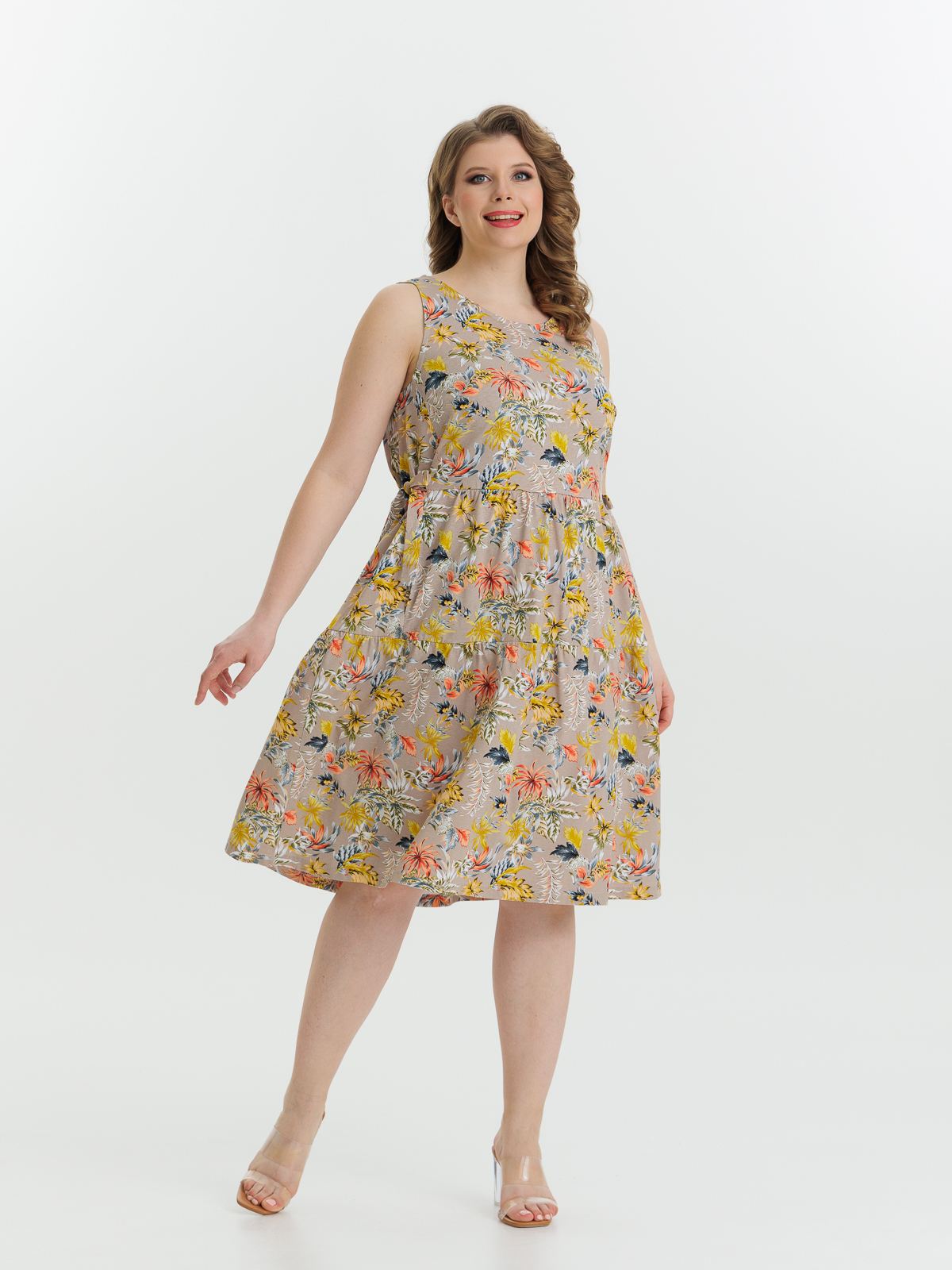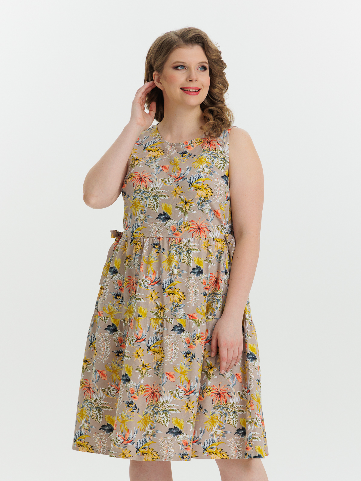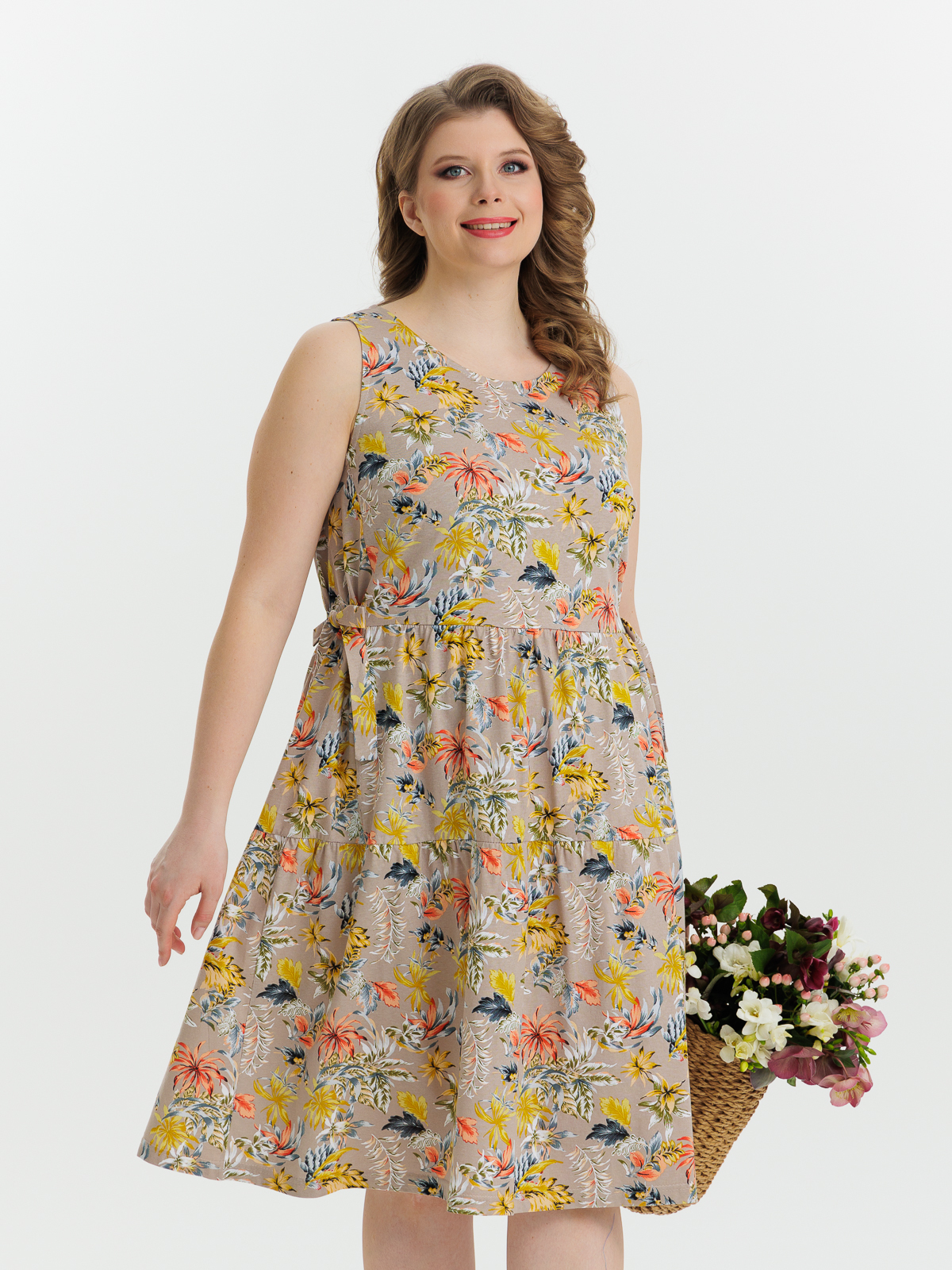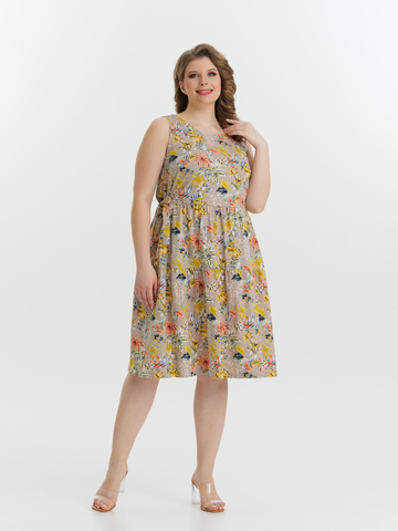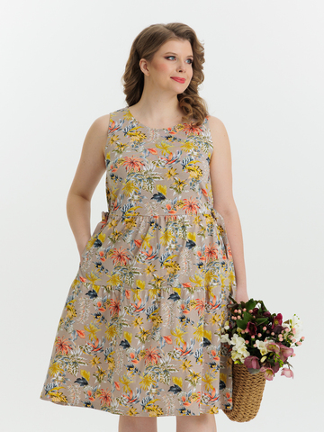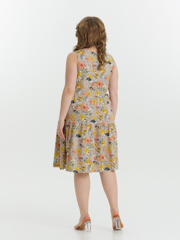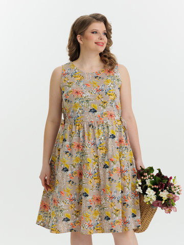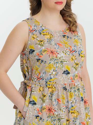 Стильный сарафан полуприлегающего силуэта, без рукава, длиной ниже колен, отрезное по линии завышенной талии. Нижняя часть сарафан состоит из двух деталей, собирающихся на сборку. Круглый вырез горловины и проймы обработаны тонкой бейкой. Идеальный стильный летний наряд для любого случая.