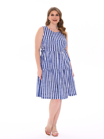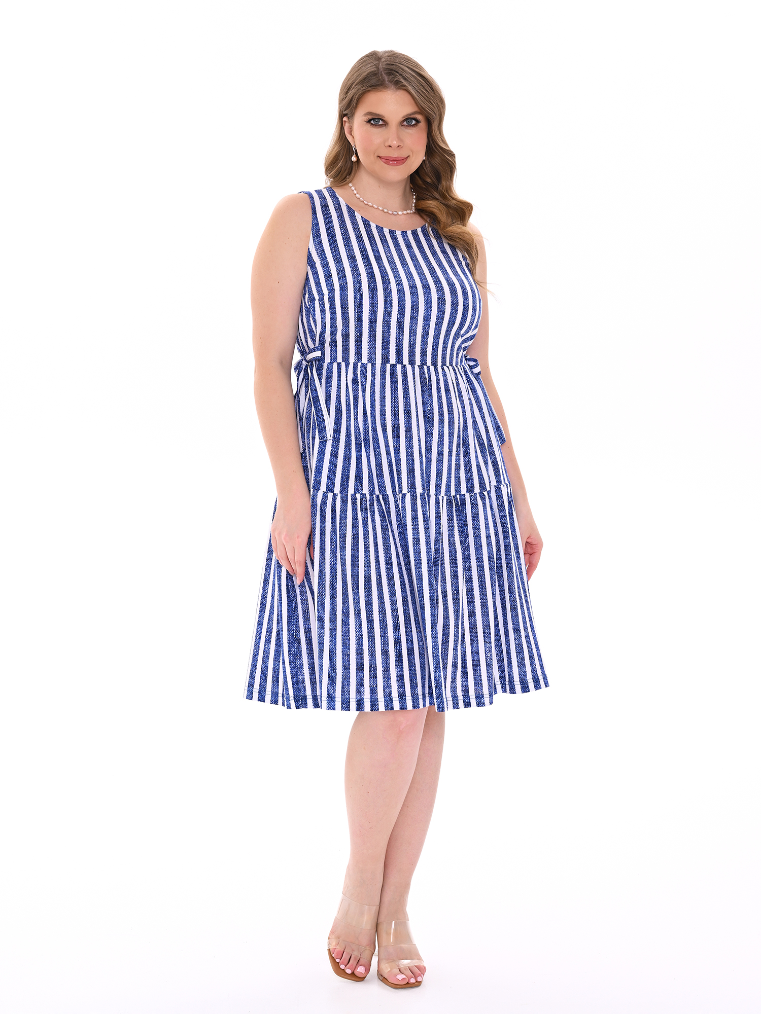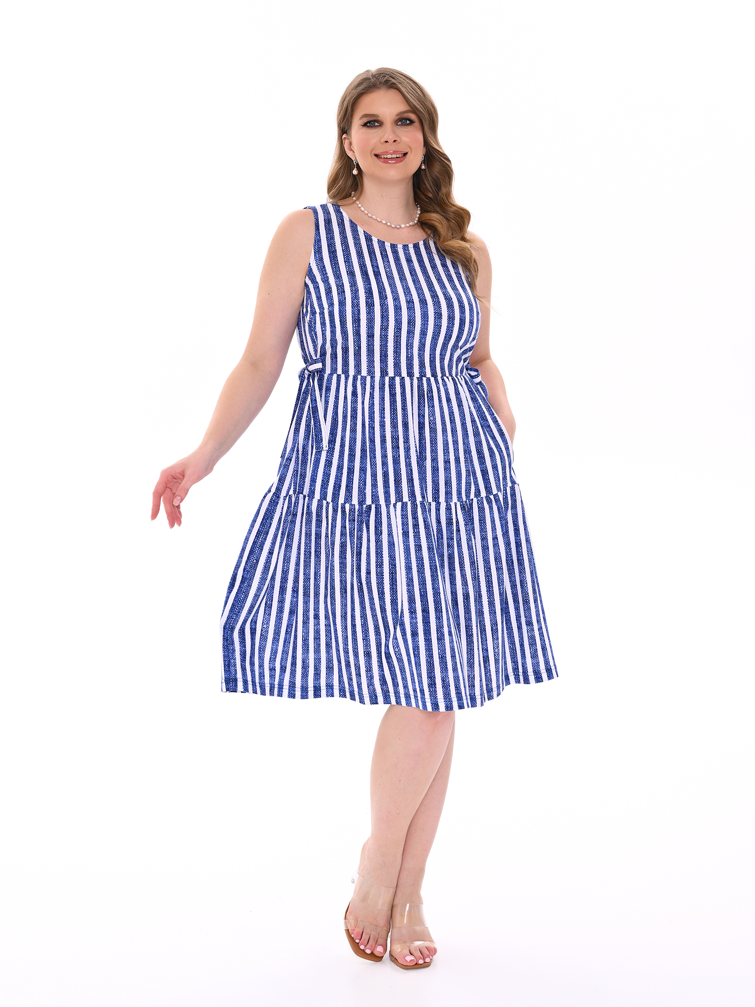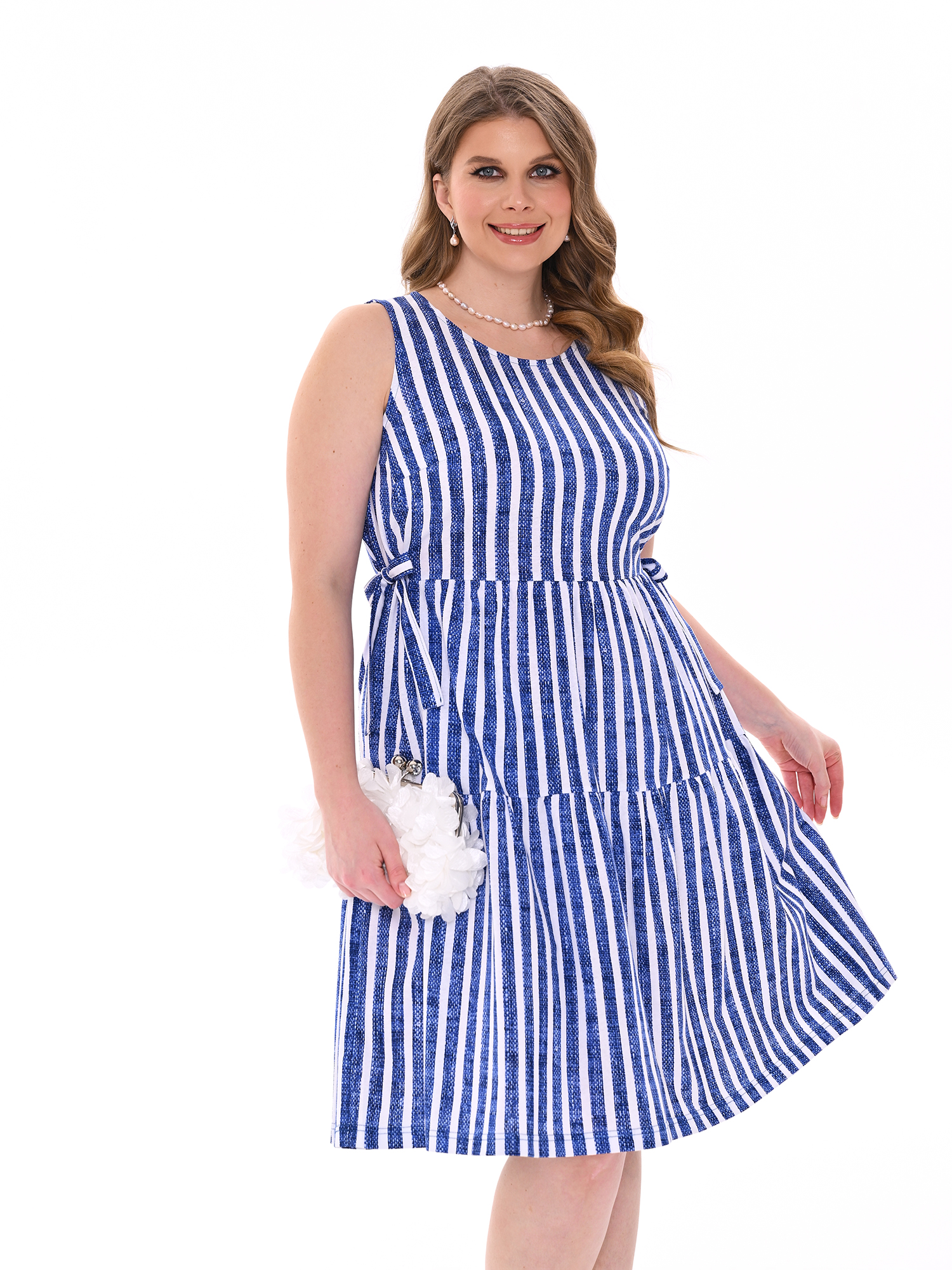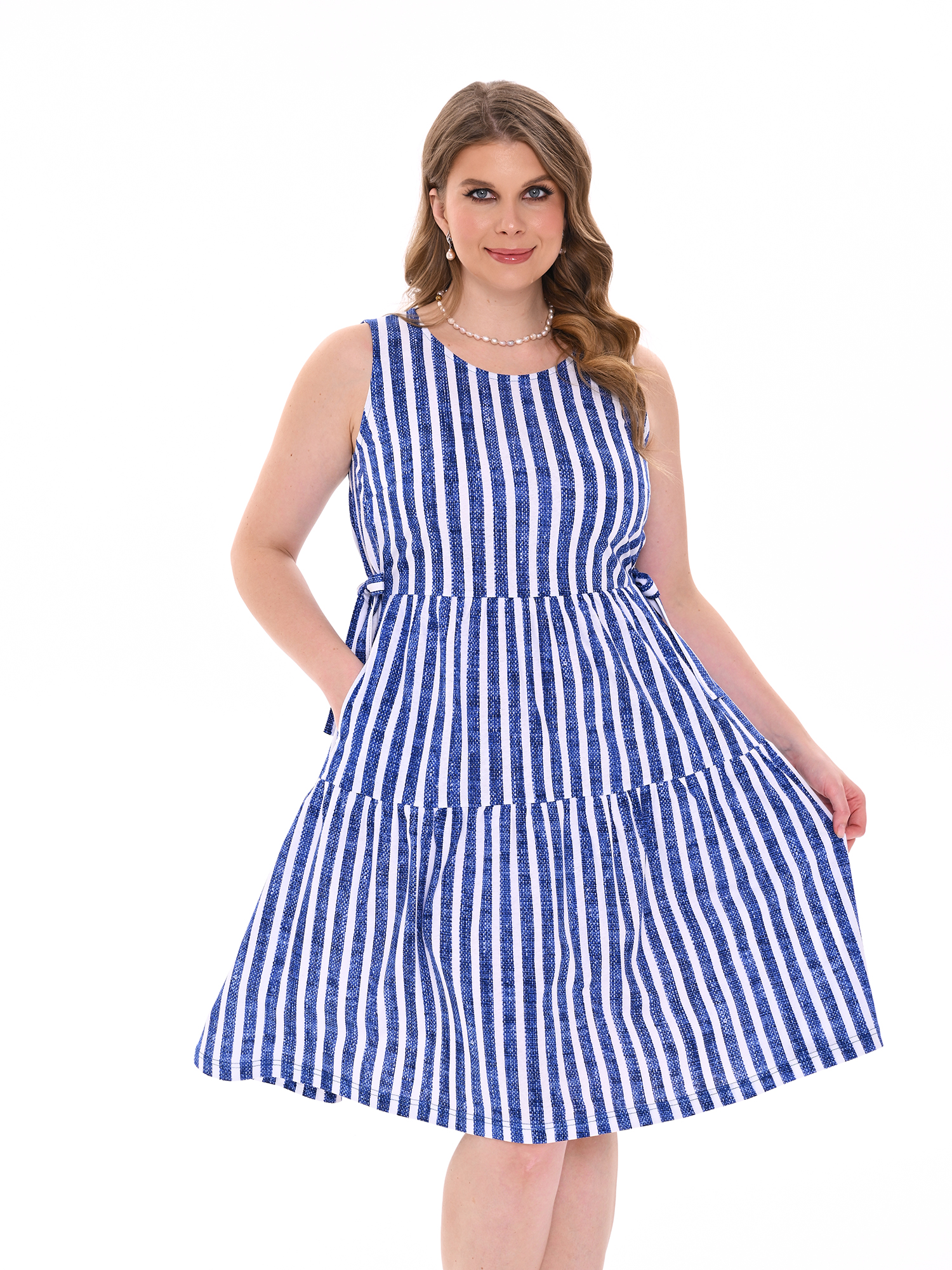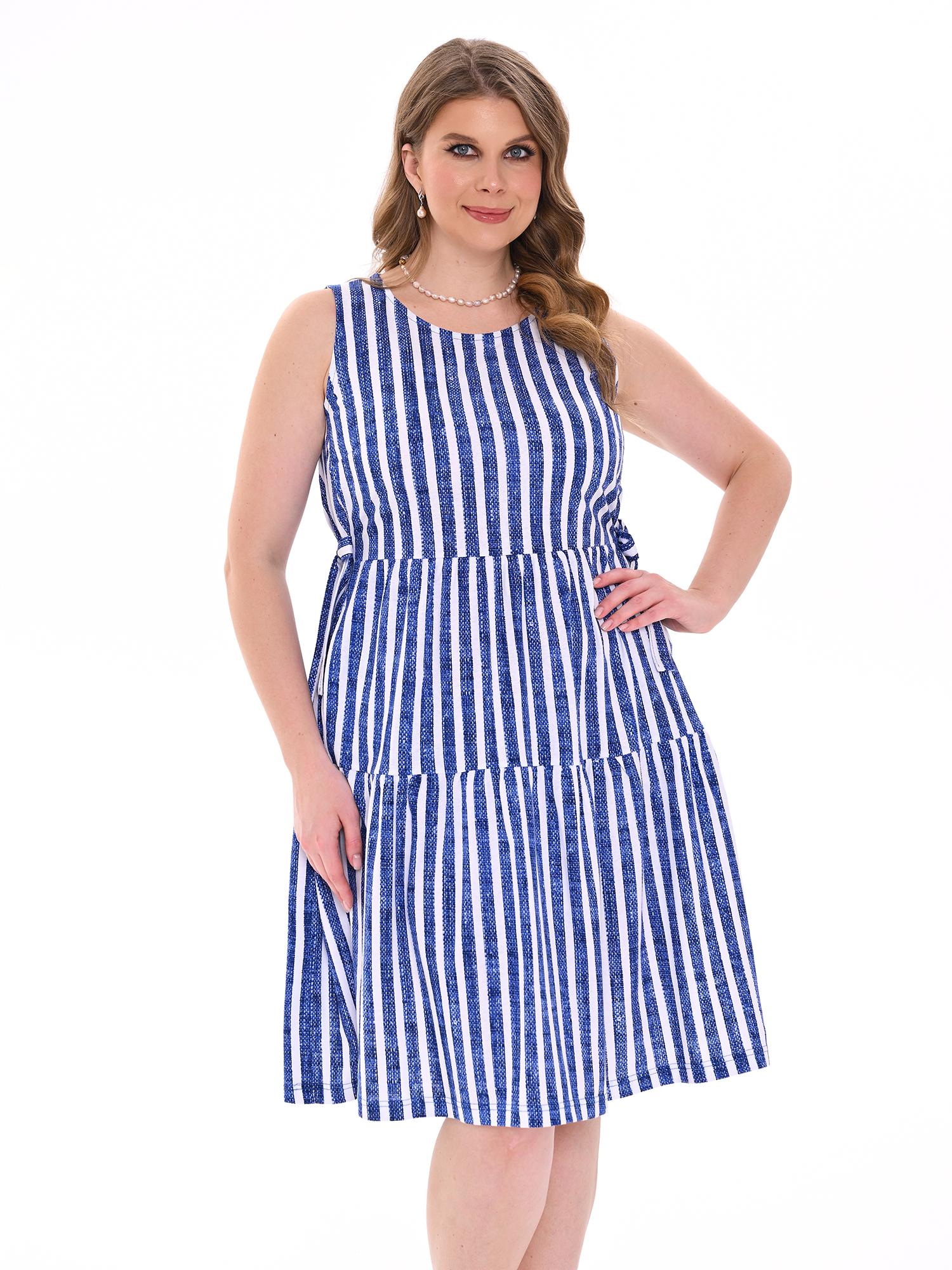 Стильный сарафан полуприлегающего силуэта, без рукава, длиной ниже колен, отрезное по линии завышенной талии. Нижняя часть сарафан состоит из двух деталей, собирающихся на сборку. Круглый вырез горловины и проймы обработаны тонкой бейкой. Идеальный стильный летний наряд для любого случая.