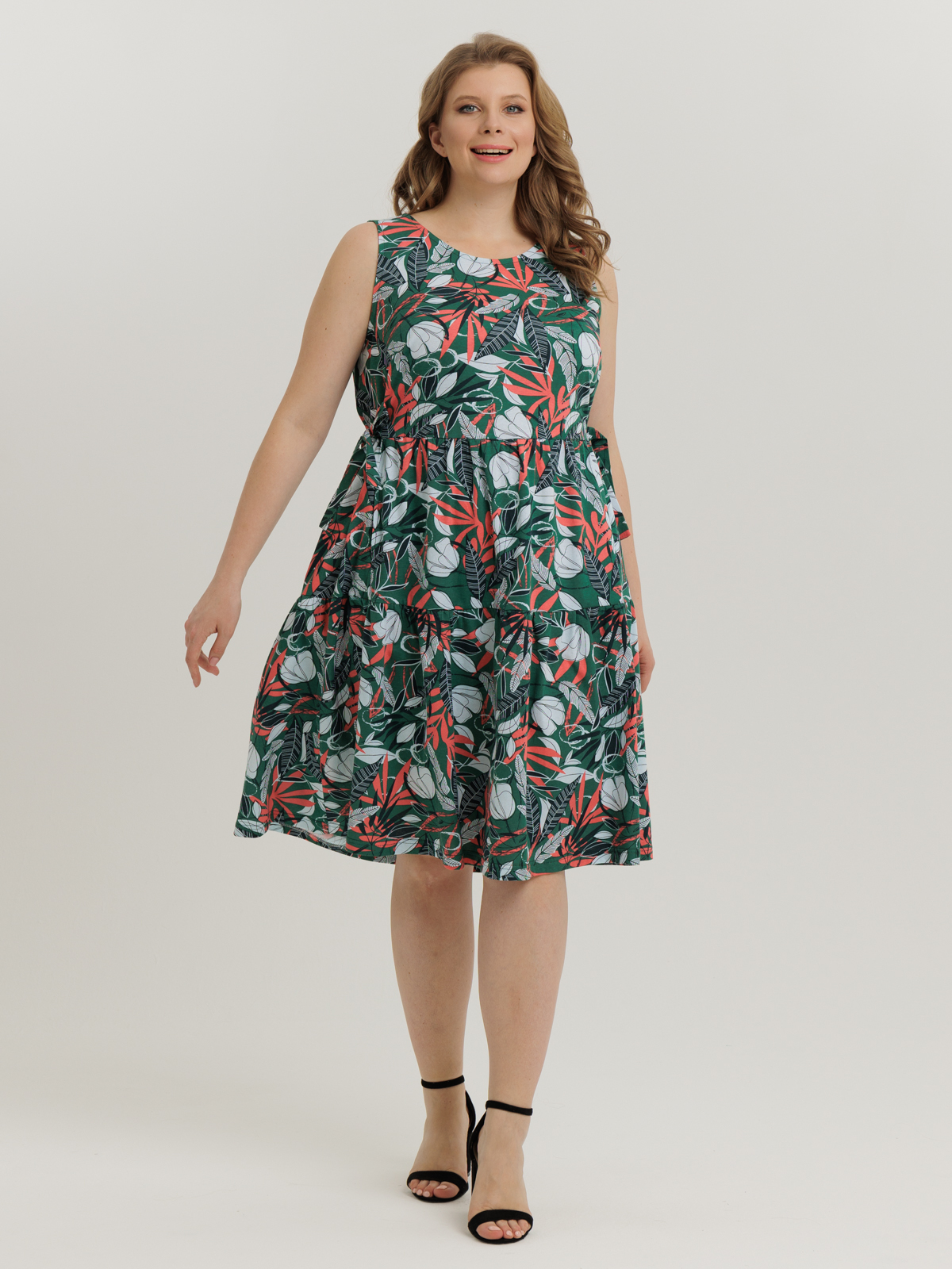 Стильный сарафан полуприлегающего силуэта, без рукава, длиной ниже колен, отрезное по линии завышенной талии. Нижняя часть сарафан состоит из двух деталей, собирающихся на сборку. Круглый вырез горловины и проймы обработаны тонкой бейкой. Идеальный стильный летний наряд для любого случая.