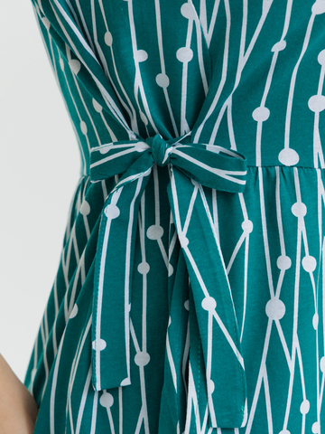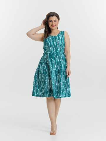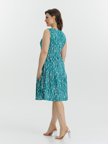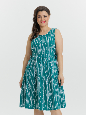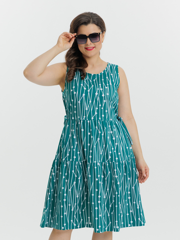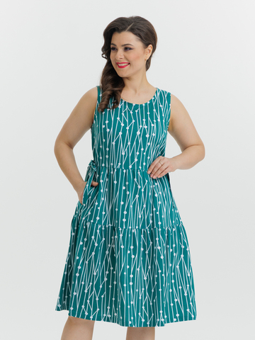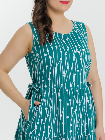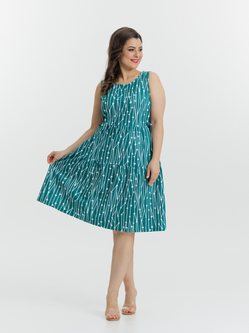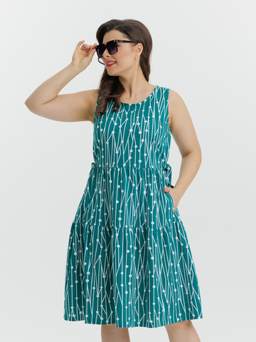 Стильный сарафан полуприлегающего силуэта, без рукава, длиной ниже колен, отрезное по линии завышенной талии. Нижняя часть сарафан состоит из двух деталей, собирающихся на сборку. Круглый вырез горловины и проймы обработаны тонкой бейкой. Идеальный стильный летний наряд для любого случая.