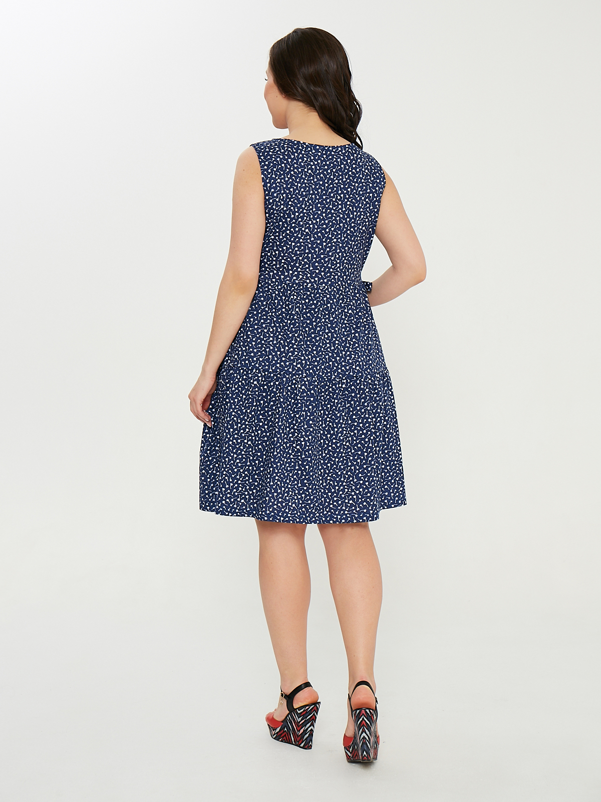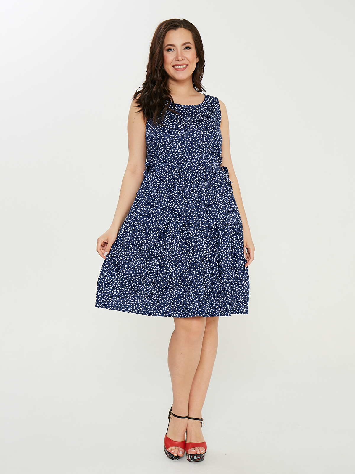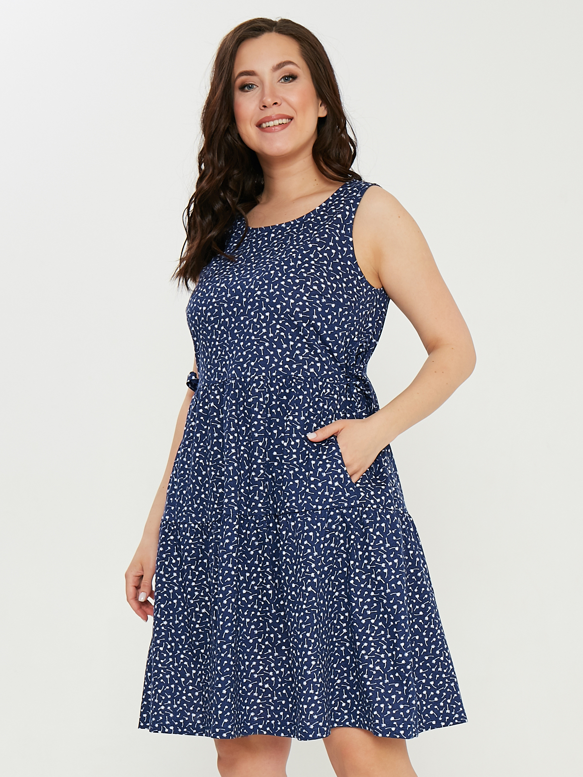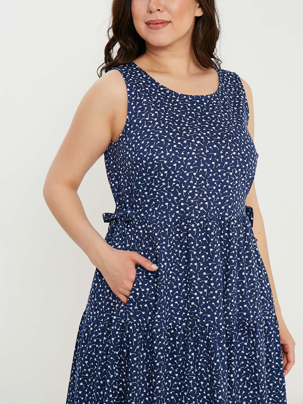 Стильный сарафан полуприлегающего силуэта, без рукава, длиной ниже колен, отрезное по линии завышенной талии. Нижняя часть сарафан состоит из двух деталей, собирающихся на сборку. Круглый вырез горловины и проймы обработаны тонкой бейкой. Идеальный стильный летний наряд для любого случая.