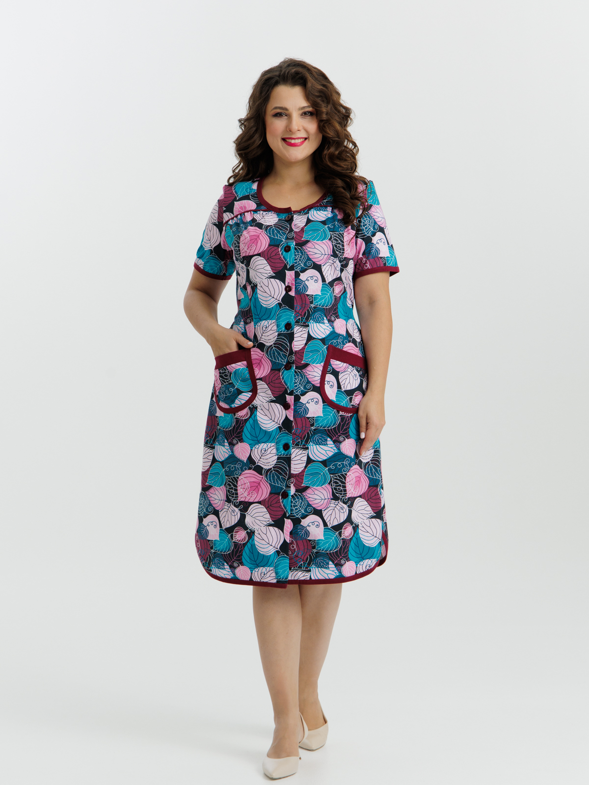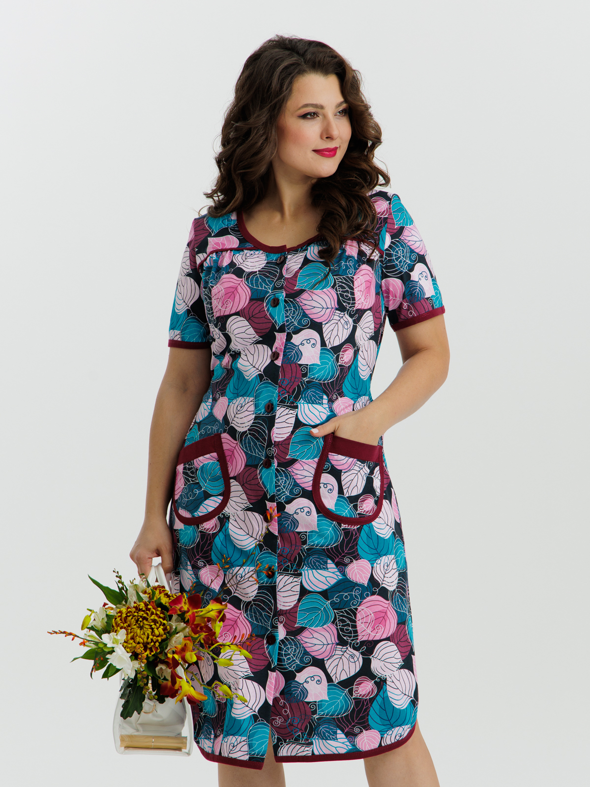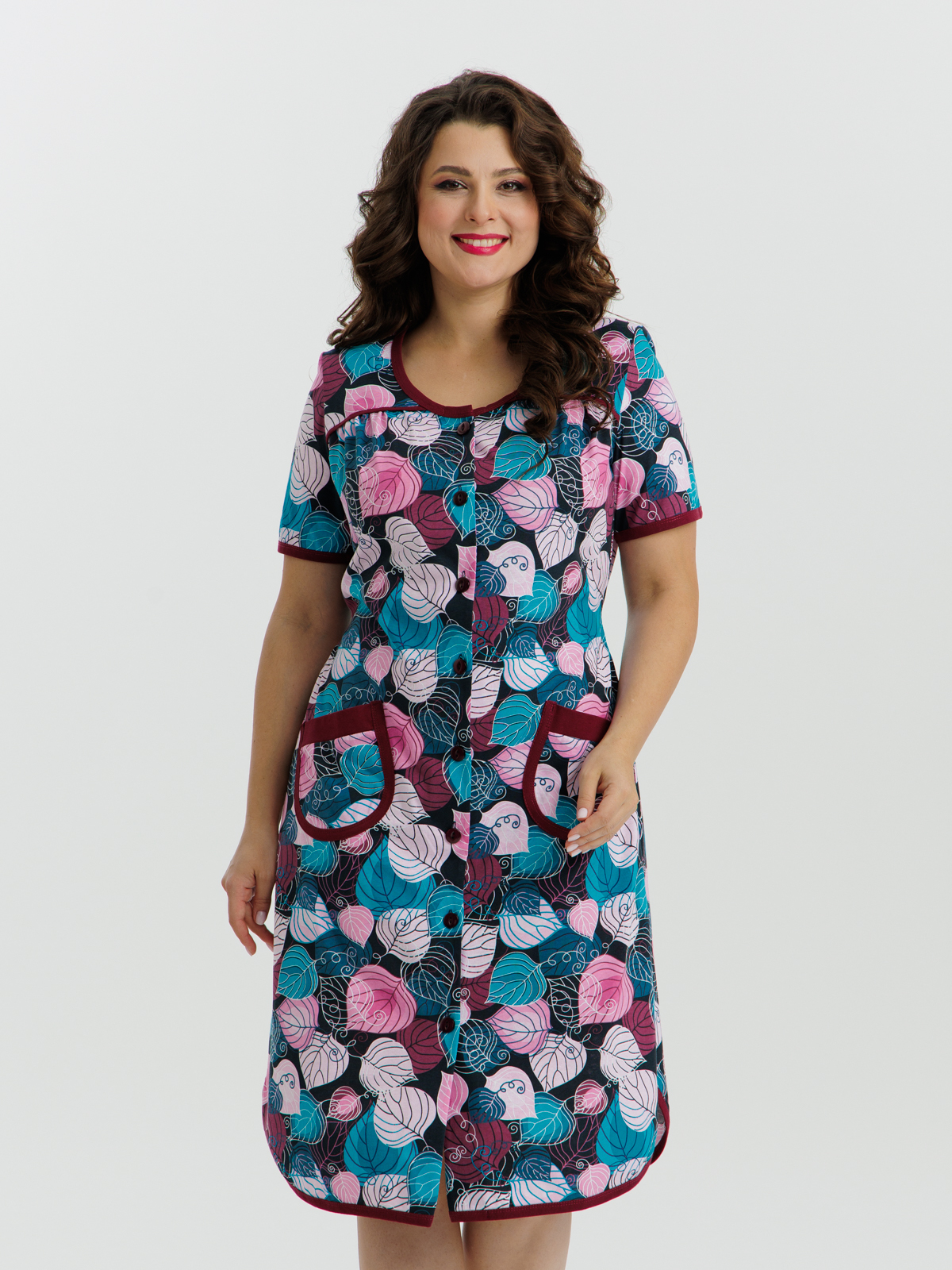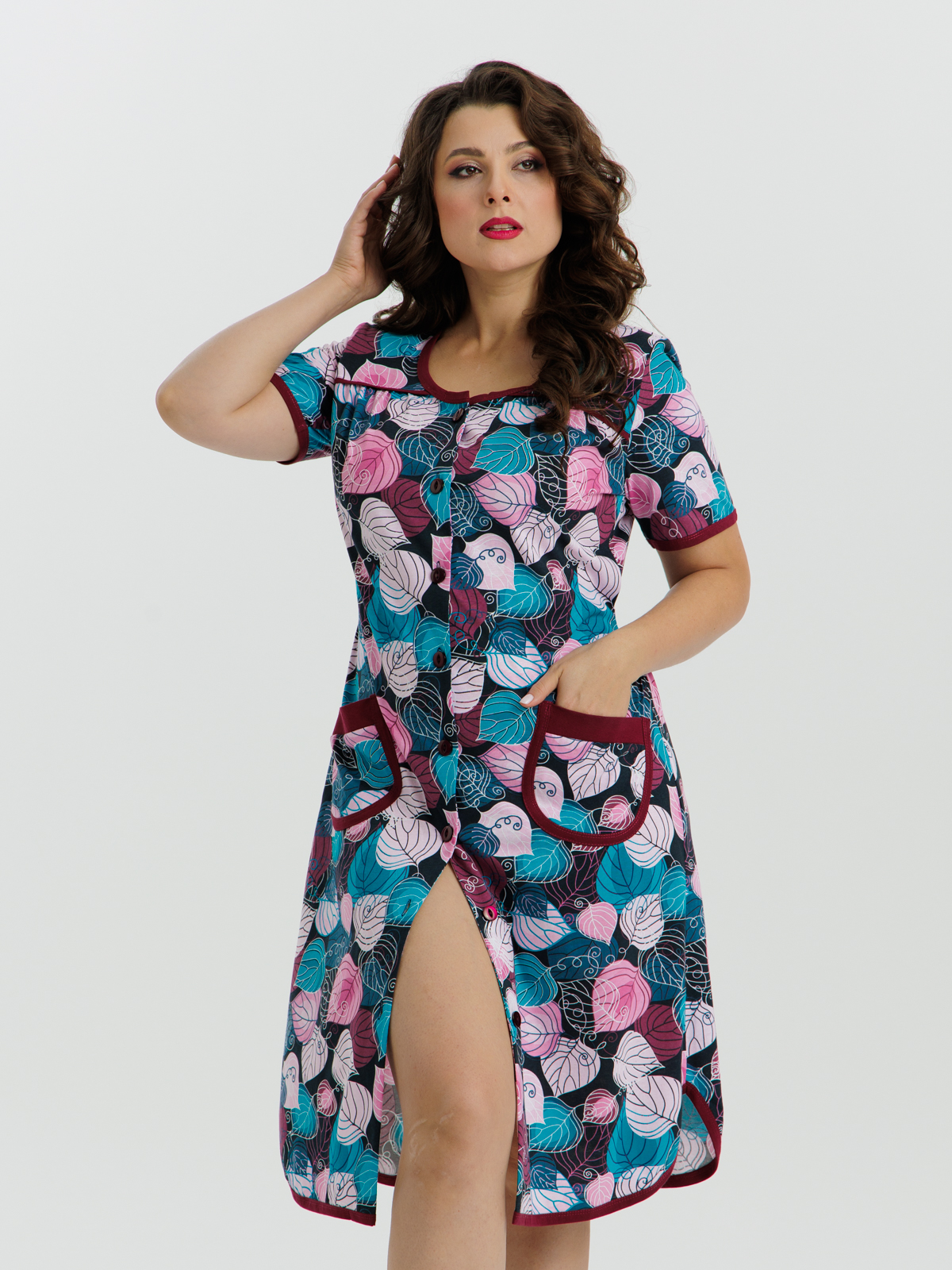 Стильный и яркий халат на пуговицах, карманами, рукавом 3/4 и длиной ниже колена, что придает свободу движению. Модель прямого силуэта, полукруглые разрезы по бокам придают изделию изысканный и неотразимый вид, а пояс в боковых швах аккуратно подчеркивает талию. Выполнен из натурального материала хлопка, что создает комфорт в любой день.
