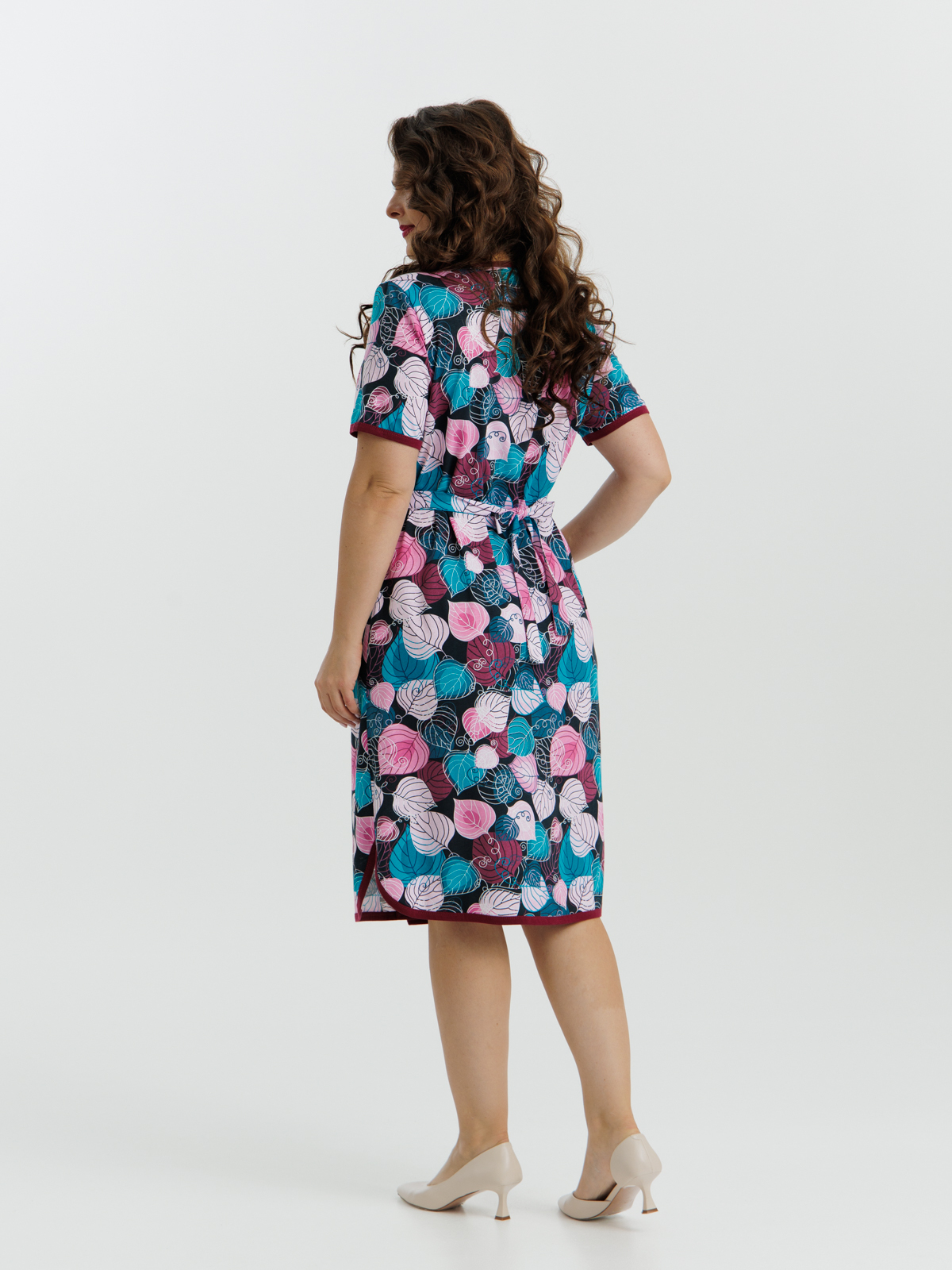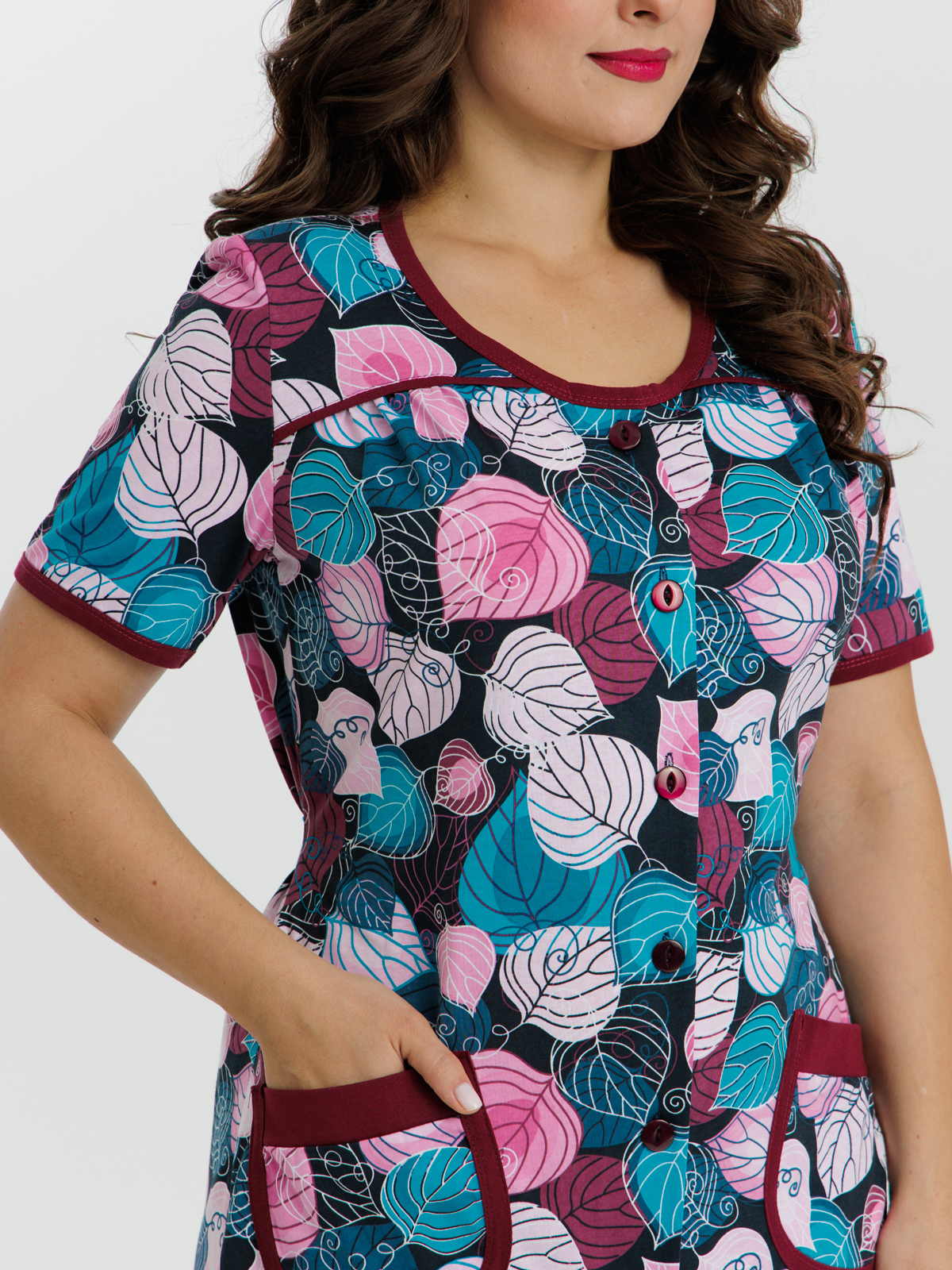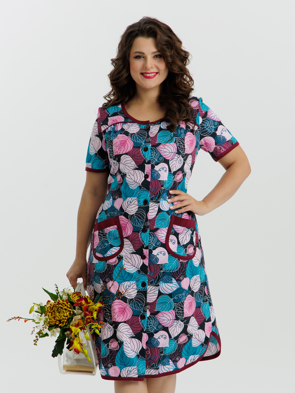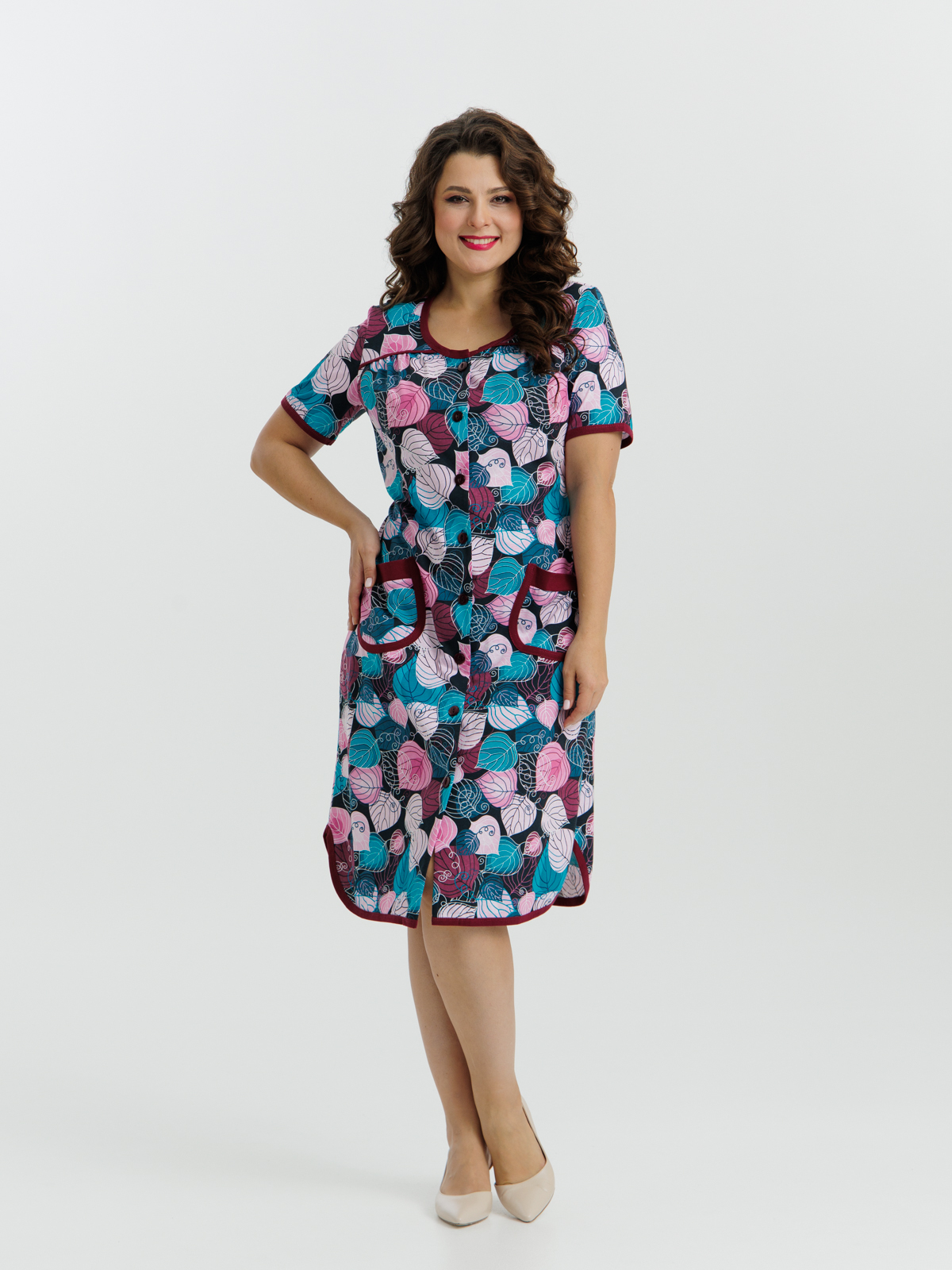 Стильный и яркий халат на пуговицах, карманами, рукавом 3/4 и длиной ниже колена, что придает свободу движению. Модель прямого силуэта, полукруглые разрезы по бокам придают изделию изысканный и неотразимый вид, а пояс в боковых швах аккуратно подчеркивает талию. Выполнен из натурального материала хлопка, что создает комфорт в любой день.