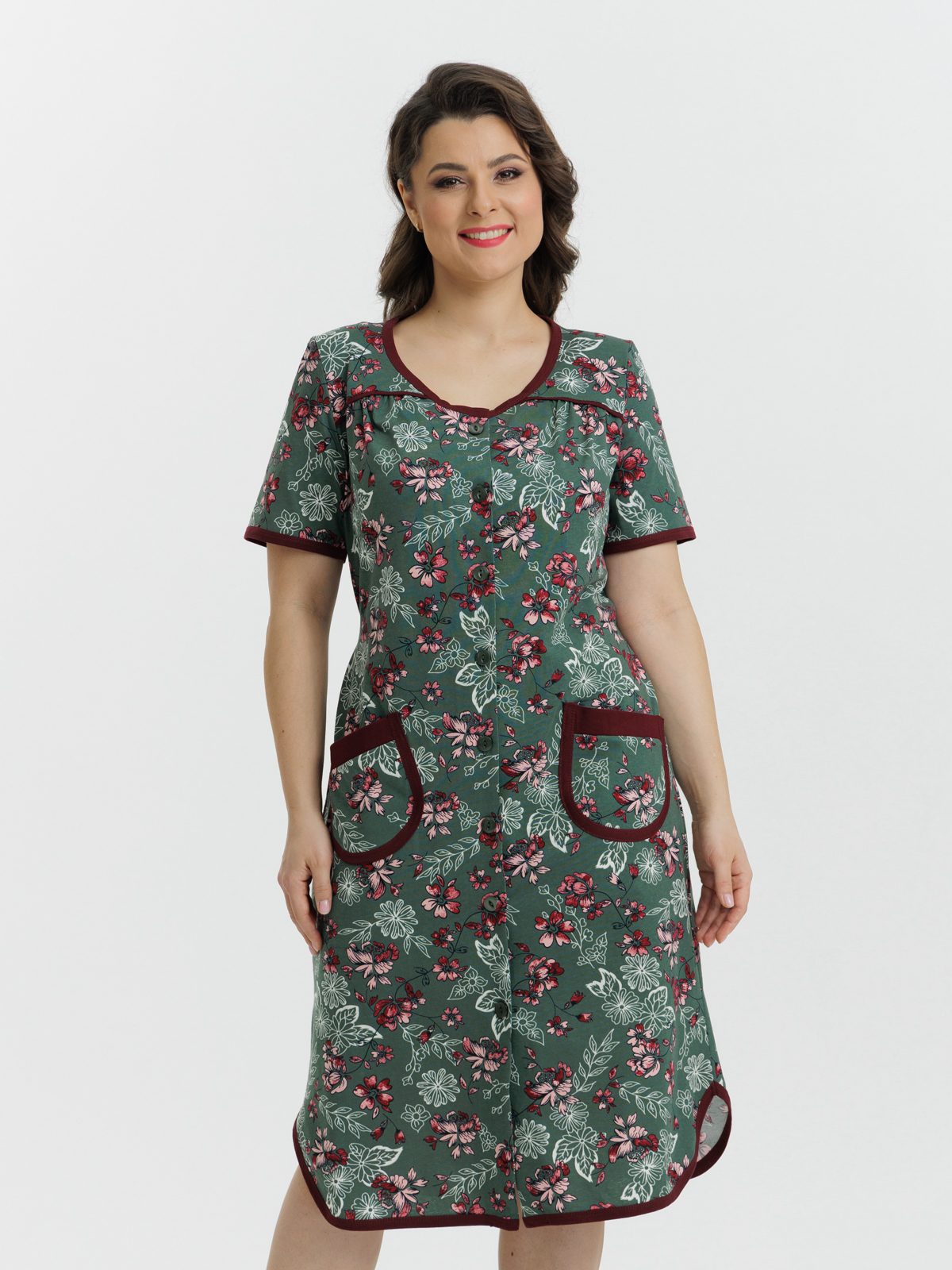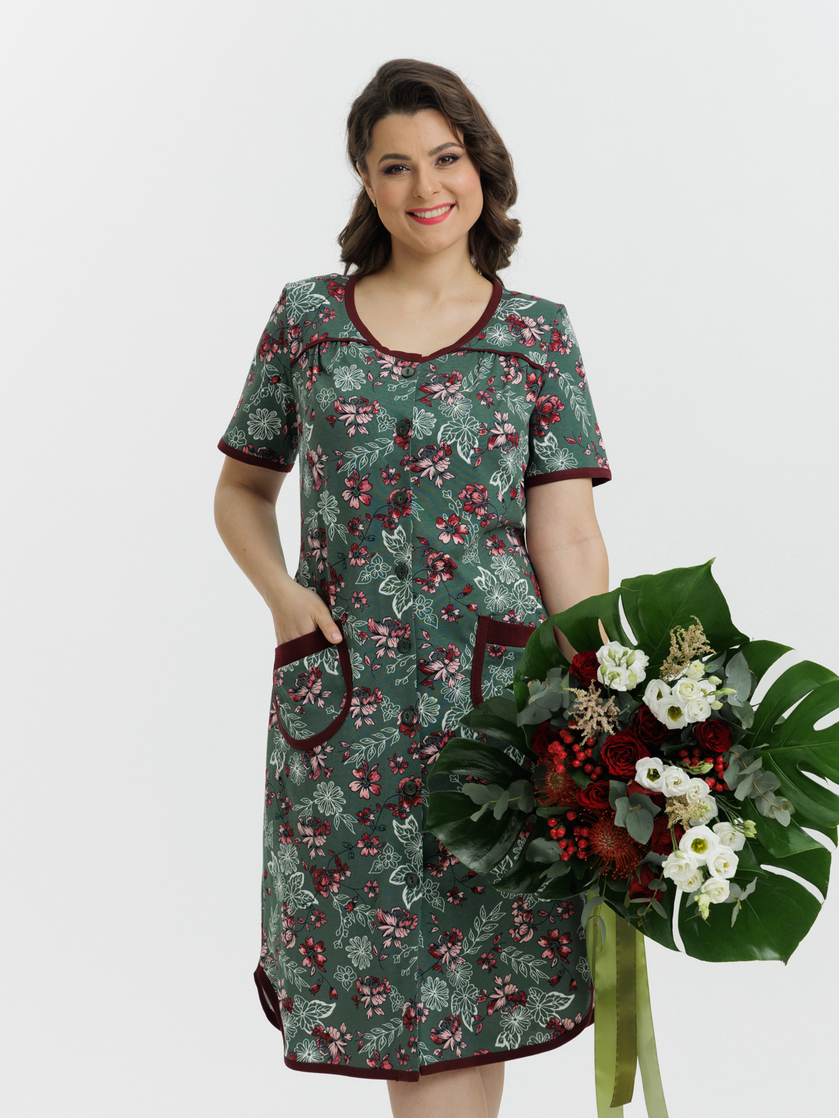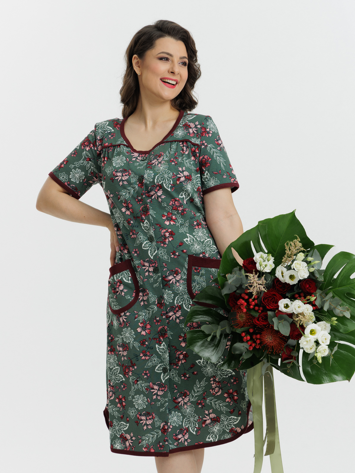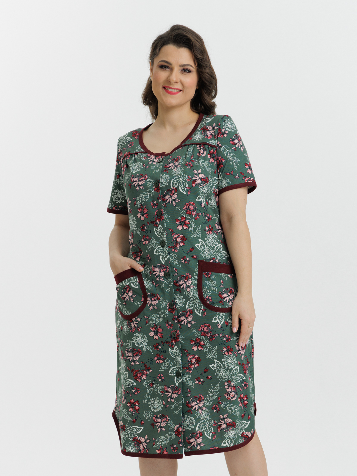 Стильный и яркий халат на пуговицах, карманами, рукавом 3/4 и длиной ниже колена, что придает свободу движению. Модель прямого силуэта, полукруглые разрезы по бокам придают изделию изысканный и неотразимый вид, а пояс в боковых швах аккуратно подчеркивает талию. Выполнен из натурального материала хлопка, что создает комфорт в любой день.