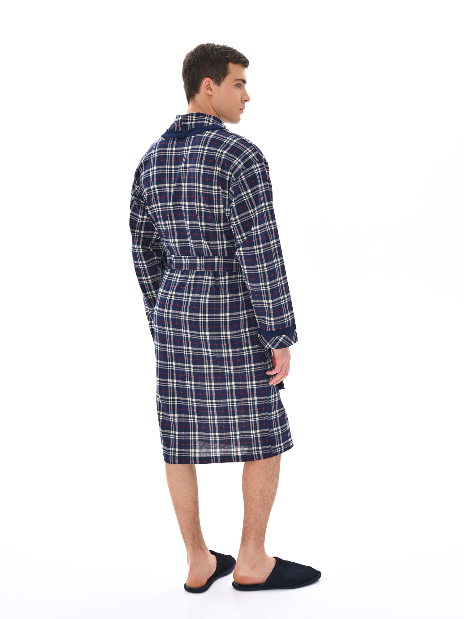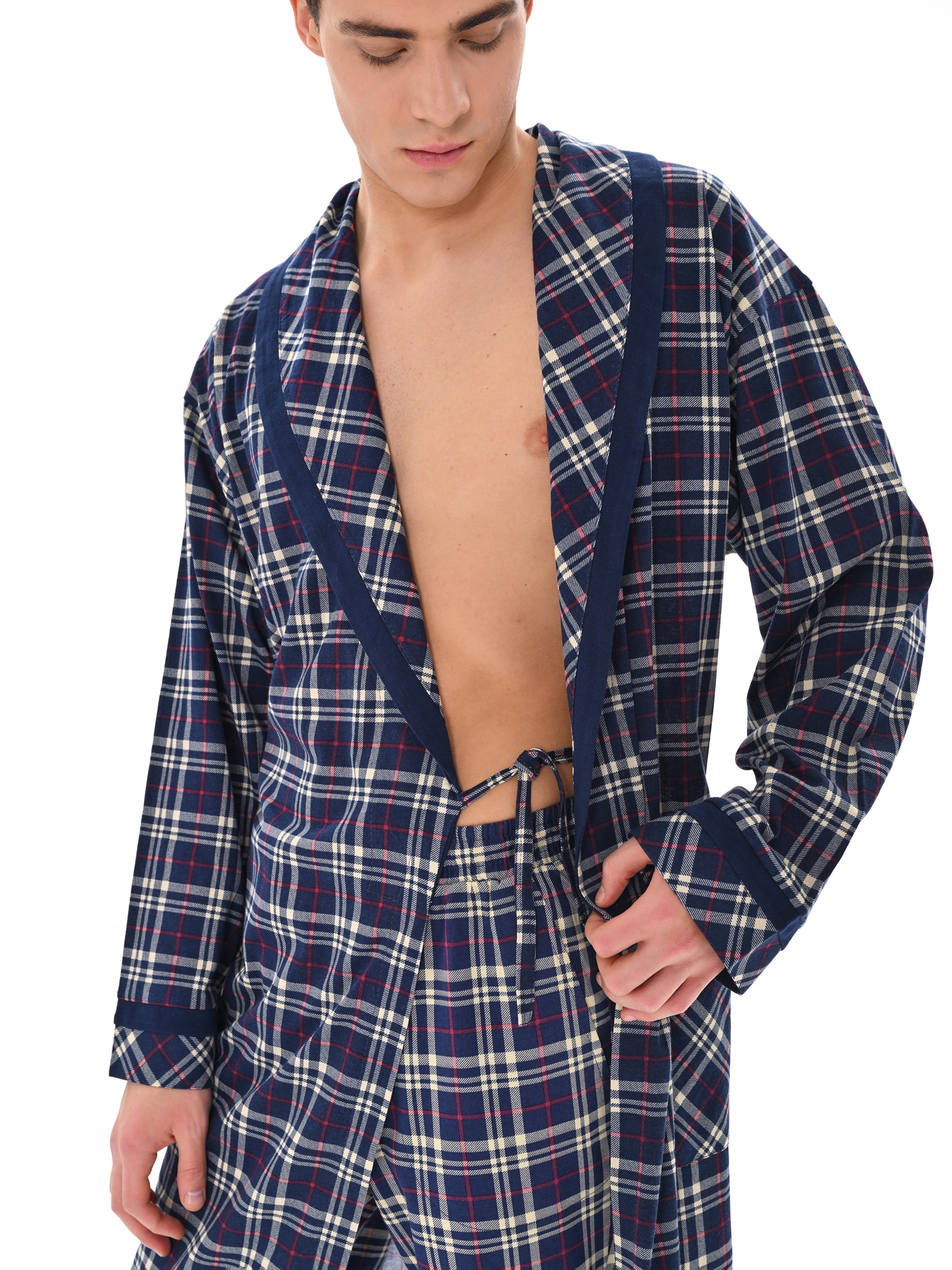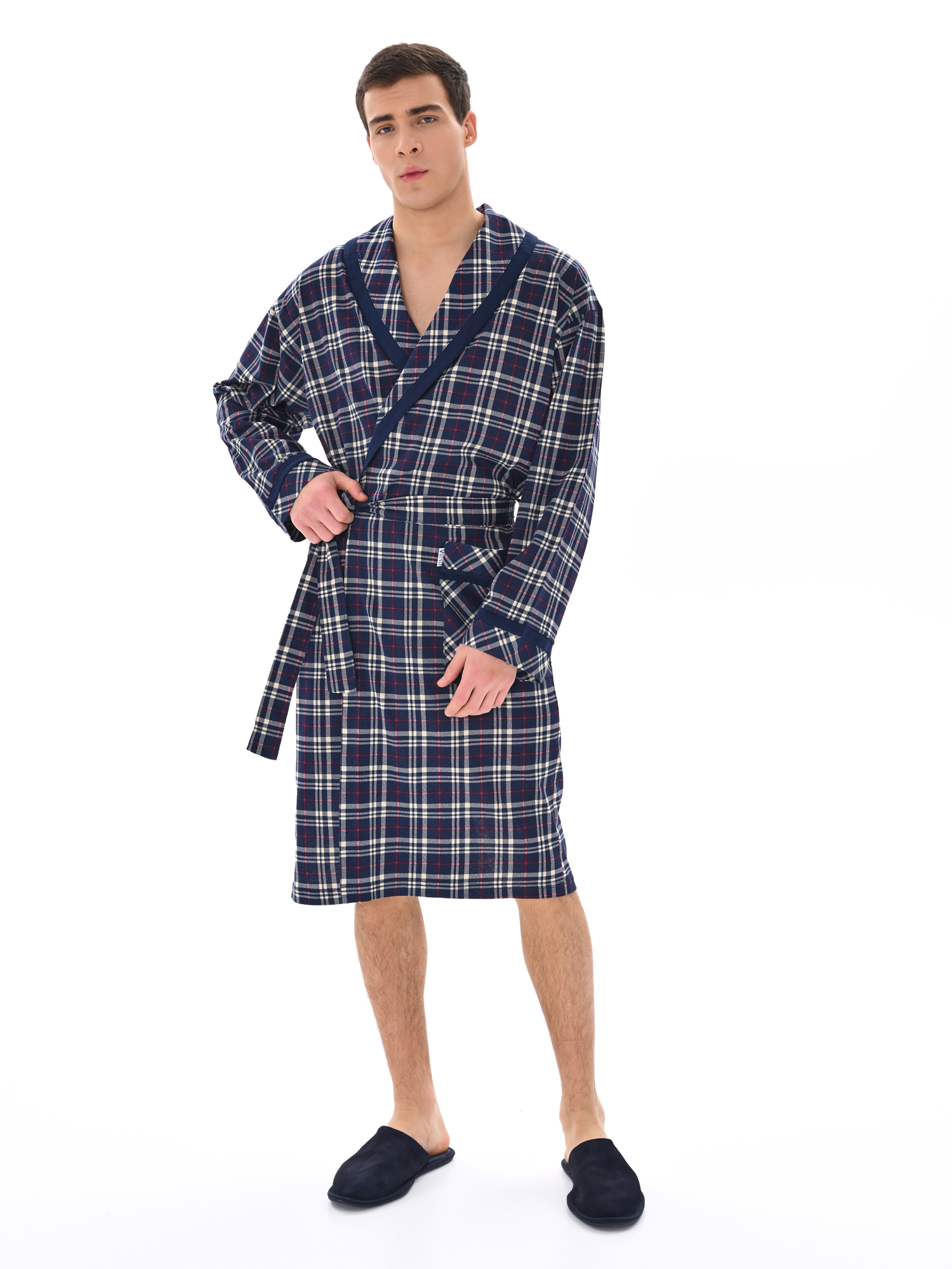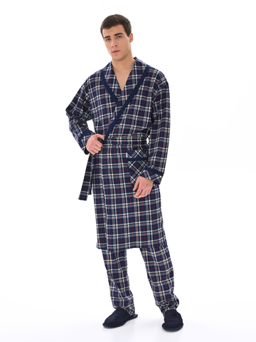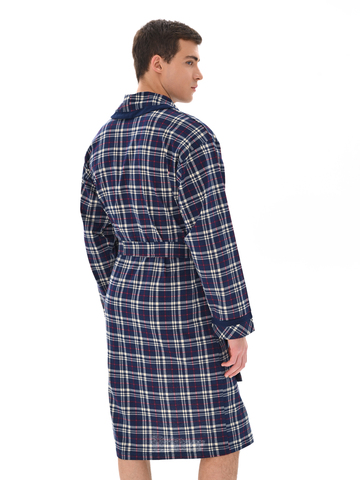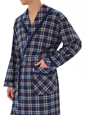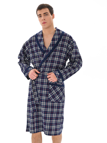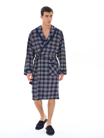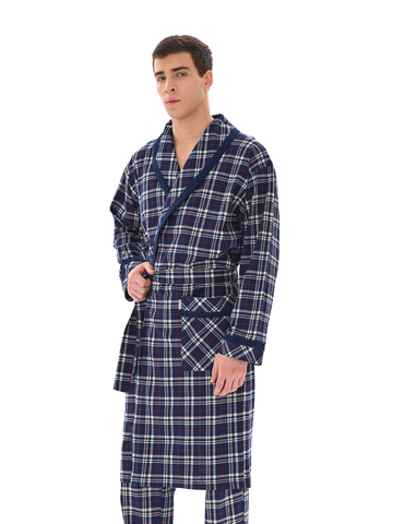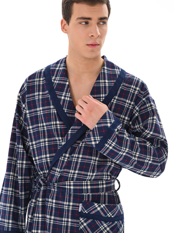 Классический и стильный мужской халат с поясом. Силуэт воротника шалька, один накладной карман и длинные рукава с манжетом отдекорированы однотонной отделкой. Длина до середины икры. Крой со слегка приспущенным плечом обеспечивает более свободную и комфортную посадку по телу.