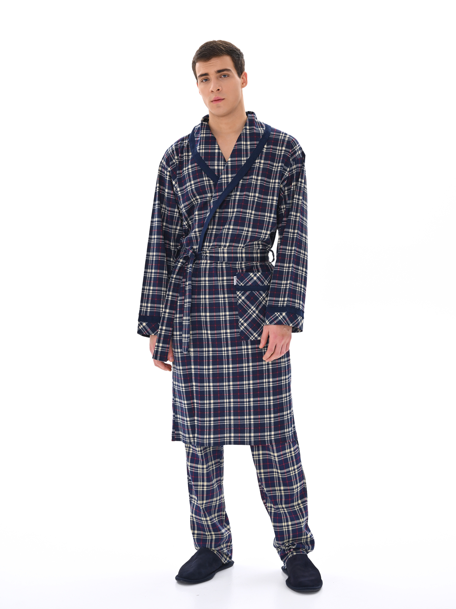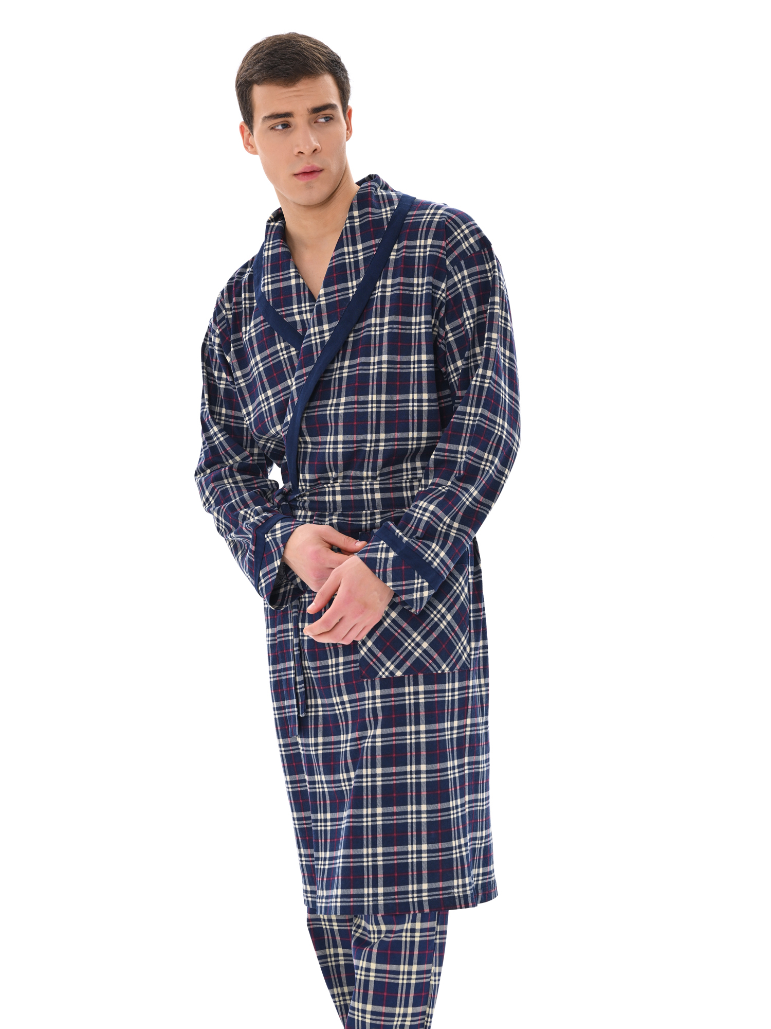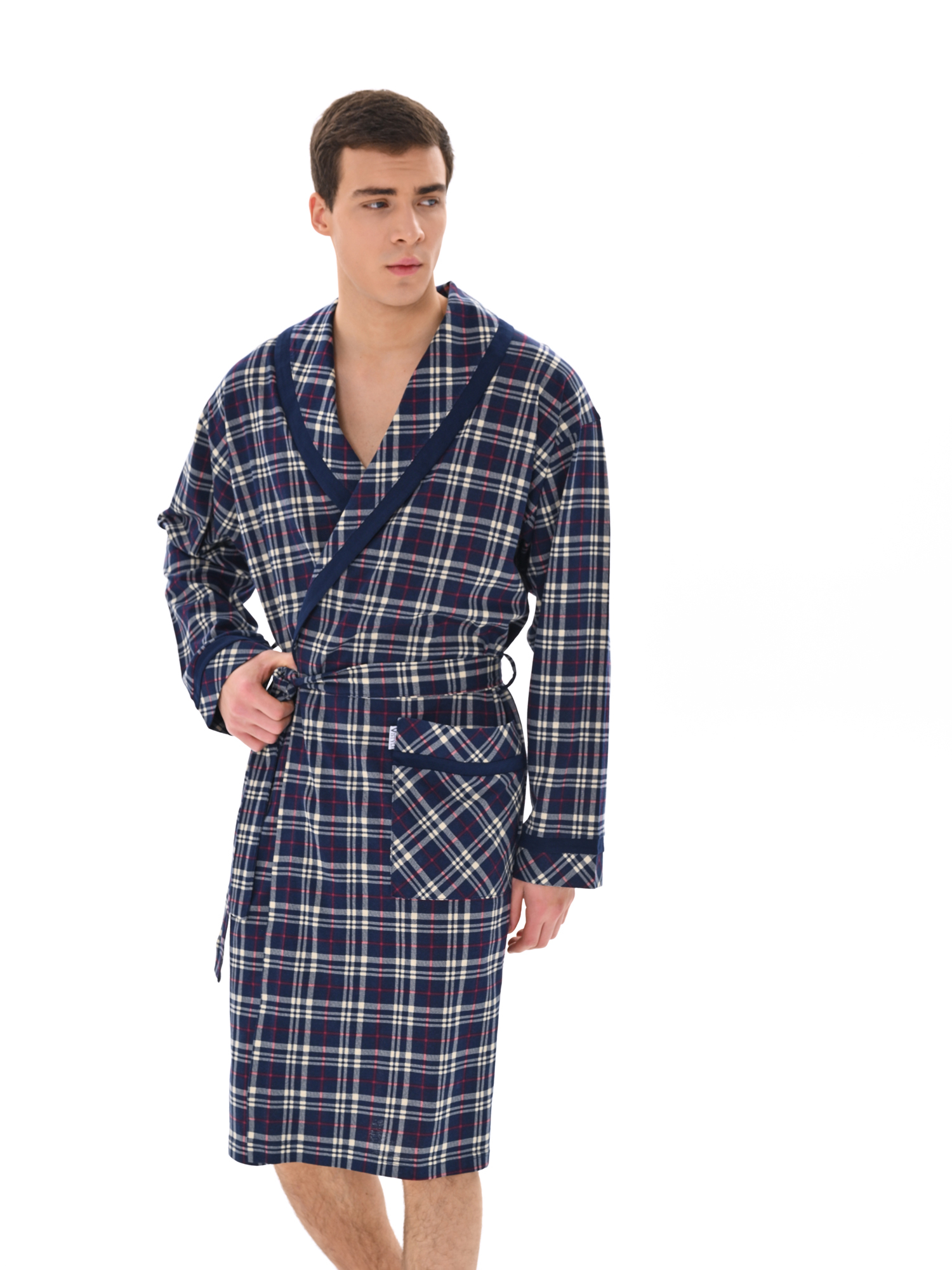 Классический и стильный мужской халат с поясом. Силуэт воротника шалька, один накладной карман и длинные рукава с манжетом отдекорированы однотонной отделкой. Длина до середины икры. Крой со слегка приспущенным плечом обеспечивает более свободную и комфортную посадку по телу.