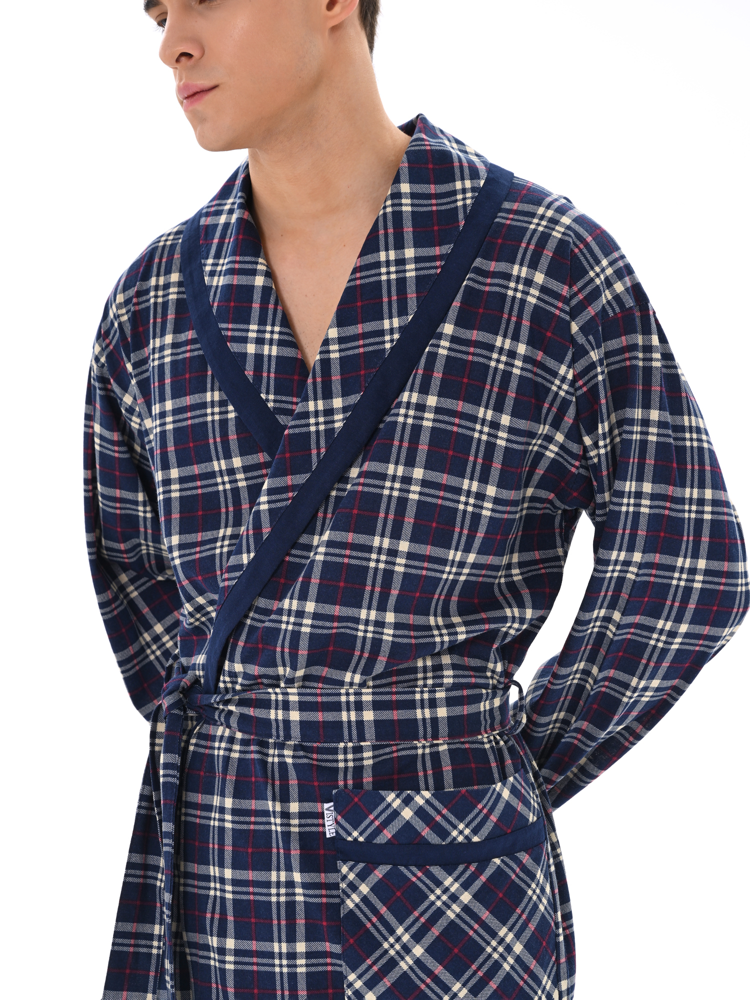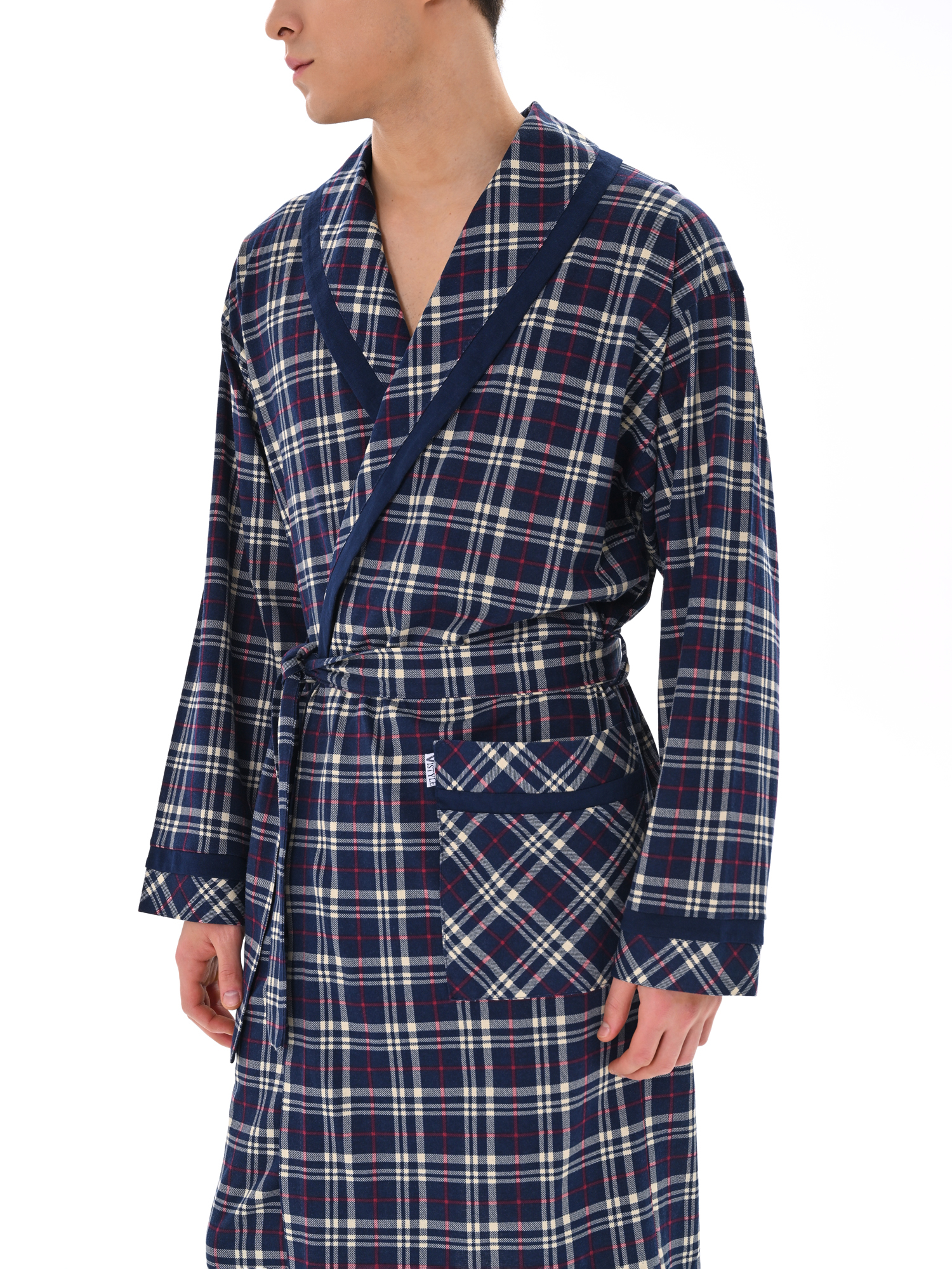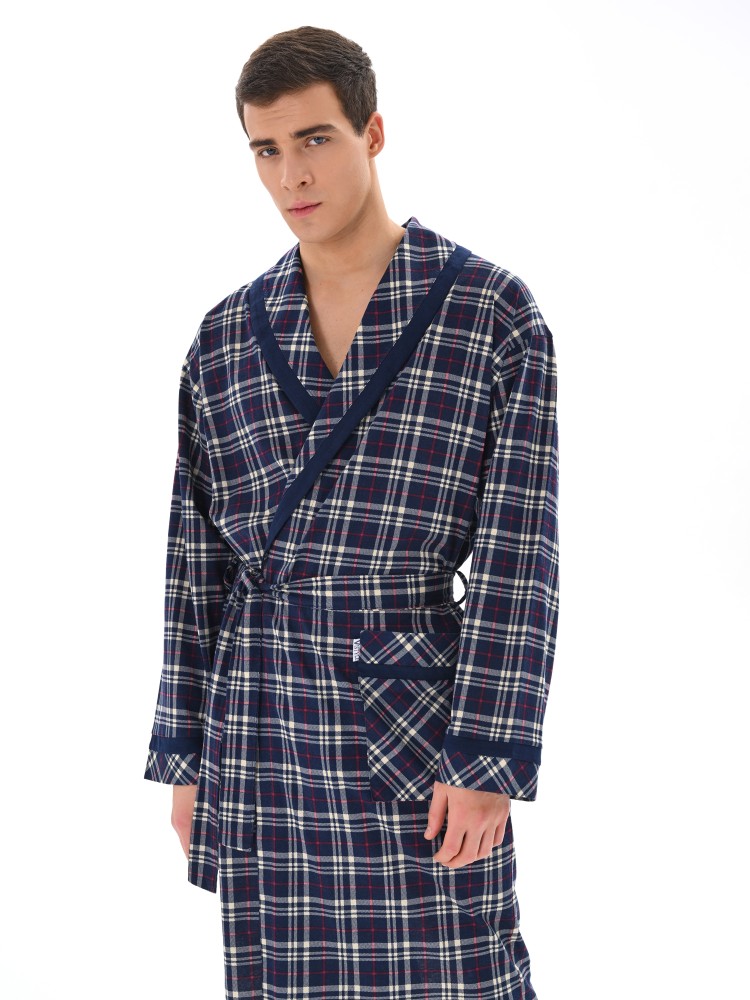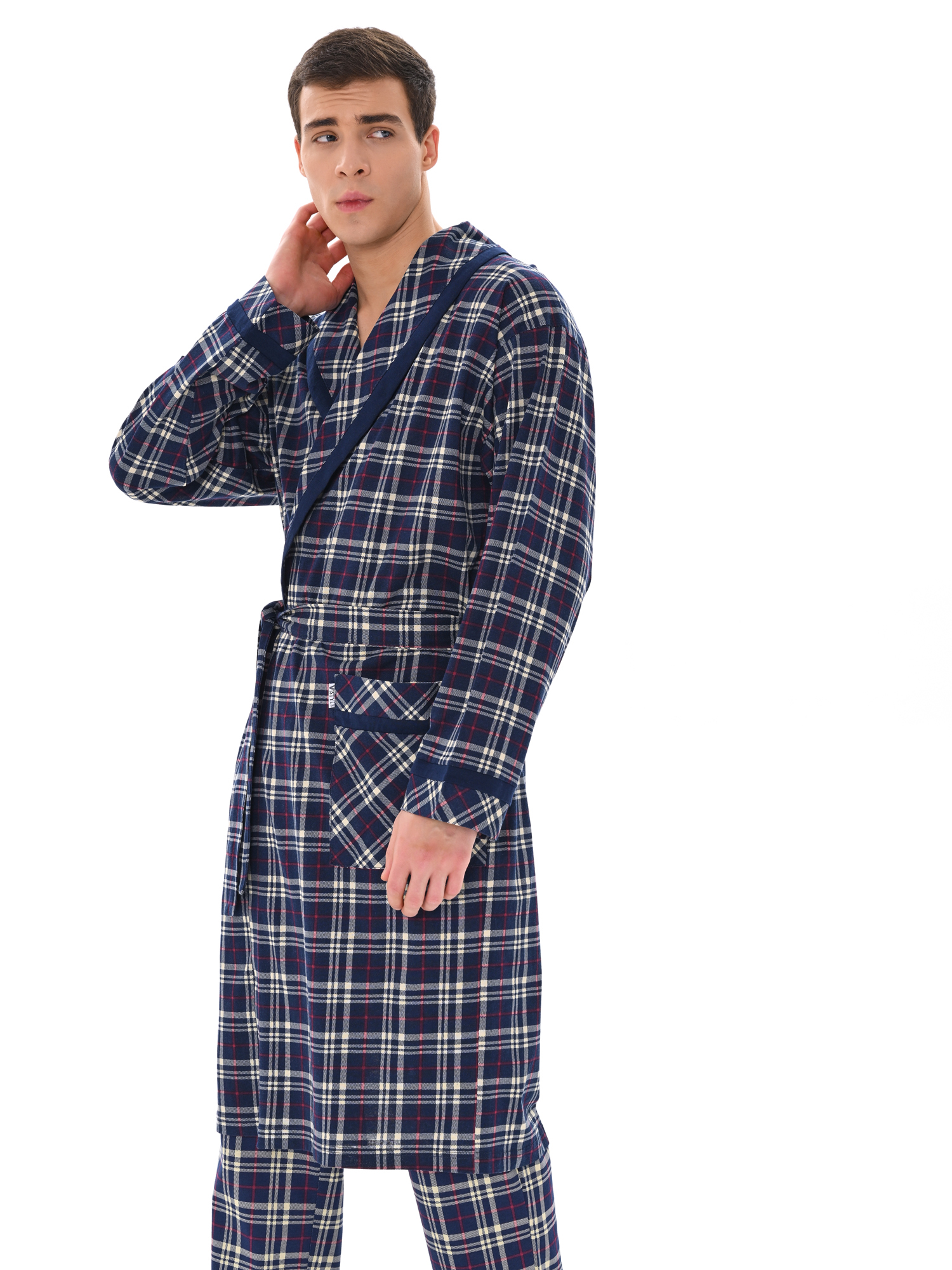 Классический и стильный мужской халат с поясом. Силуэт воротника шалька, один накладной карман и длинные рукава с манжетом отдекорированы однотонной отделкой. Длина до середины икры. Крой со слегка приспущенным плечом обеспечивает более свободную и комфортную посадку по телу.
