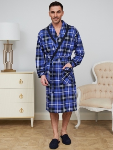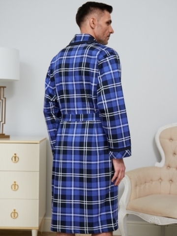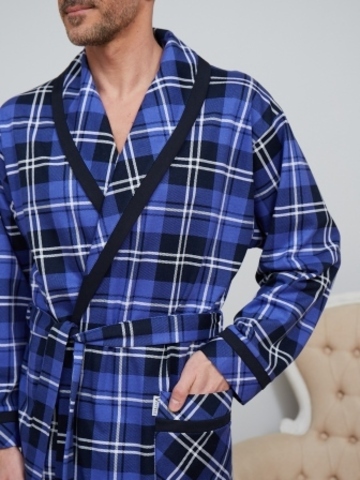 Классический и стильный мужской халат с поясом. Силуэт воротника шалька, один накладной карман и длинные рукава с манжетом отдекорированы однотонной отделкой. Длина до середины икры. Крой со слегка приспущенным плечом обеспечивает более свободную и комфортную посадку по телу.