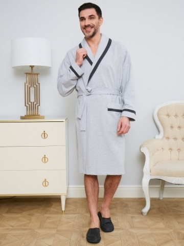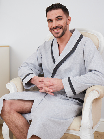 Классический и стильный мужской халат с поясом. Силуэт воротника шалька, один накладной карман и длинные рукава с манжетом отдекорированы однотонной отделкой. Длина до середины икры. Крой со слегка приспущенным плечом обеспечивает более свободную и комфортную посадку по телу.