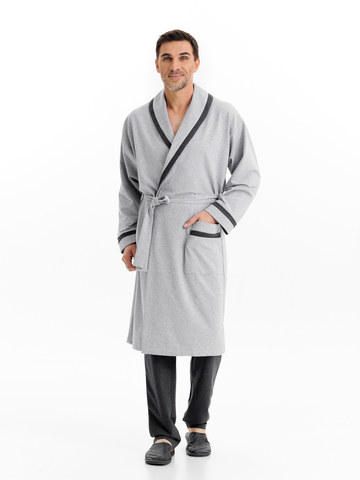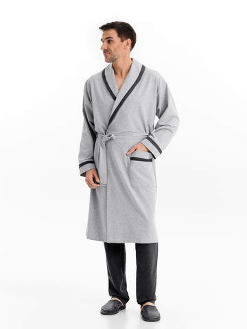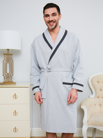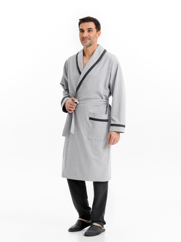 Классический и стильный мужской халат с поясом. Силуэт воротника шалька, один накладной карман и длинные рукава с манжетом отдекорированы однотонной отделкой. Длина до середины икры. Крой со слегка приспущенным плечом обеспечивает более свободную и комфортную посадку по телу.