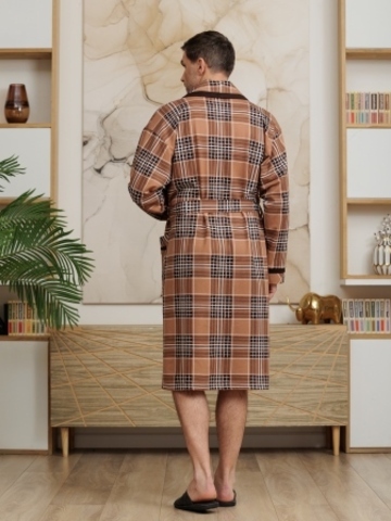 Классический и стильный мужской халат с поясом. Силуэт воротника шалька, один накладной карман и длинные рукава с манжетом отдекорированы однотонной отделкой. Длина до середины икры. Крой со слегка приспущенным плечом обеспечивает более свободную и комфортную посадку по телу.