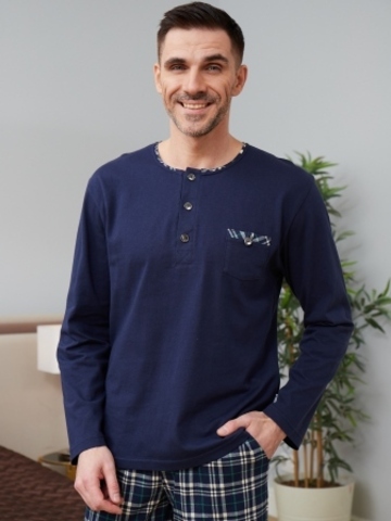 Современный мужской костюм для дома, состоящий из кофты на трех пуговицах и нагрудного кармана, свободного покроя. Брюки прямого силуэта из трикотажного полотна, с поясом на резинке, шнуром и боковыми карманами. Изделие выполнено из высококачественного трикотажного материала. Отличный вариант для дома и отдыха на каждый день.